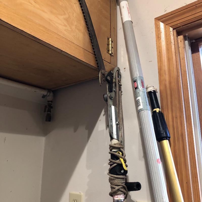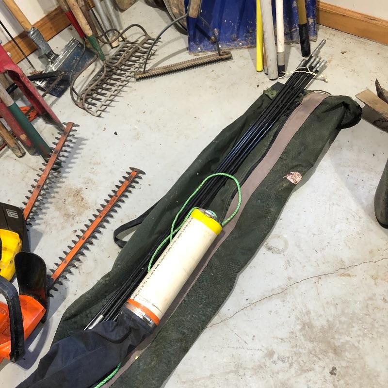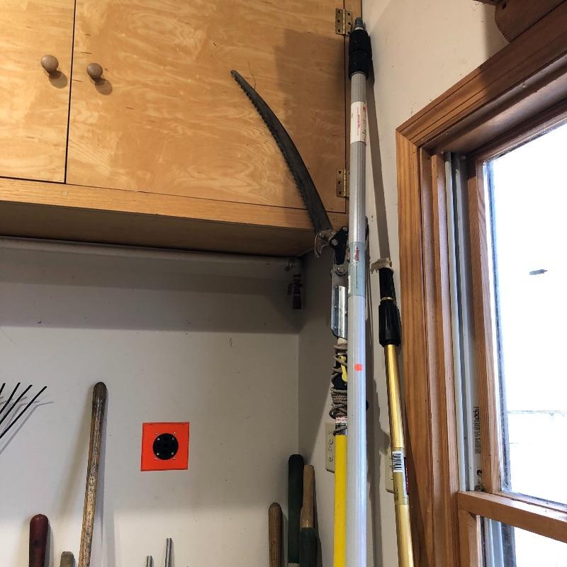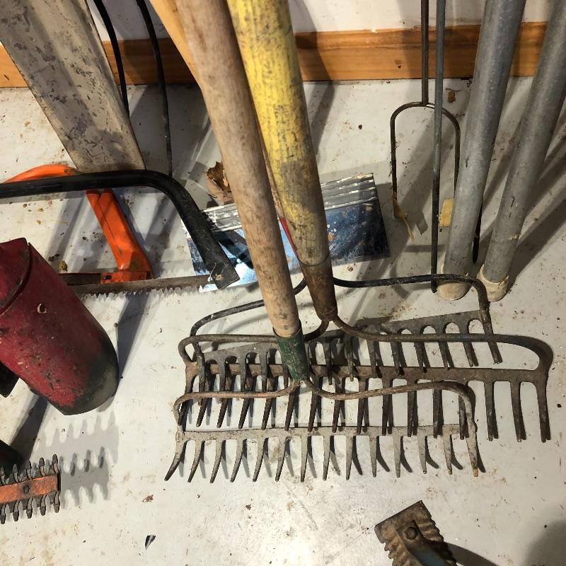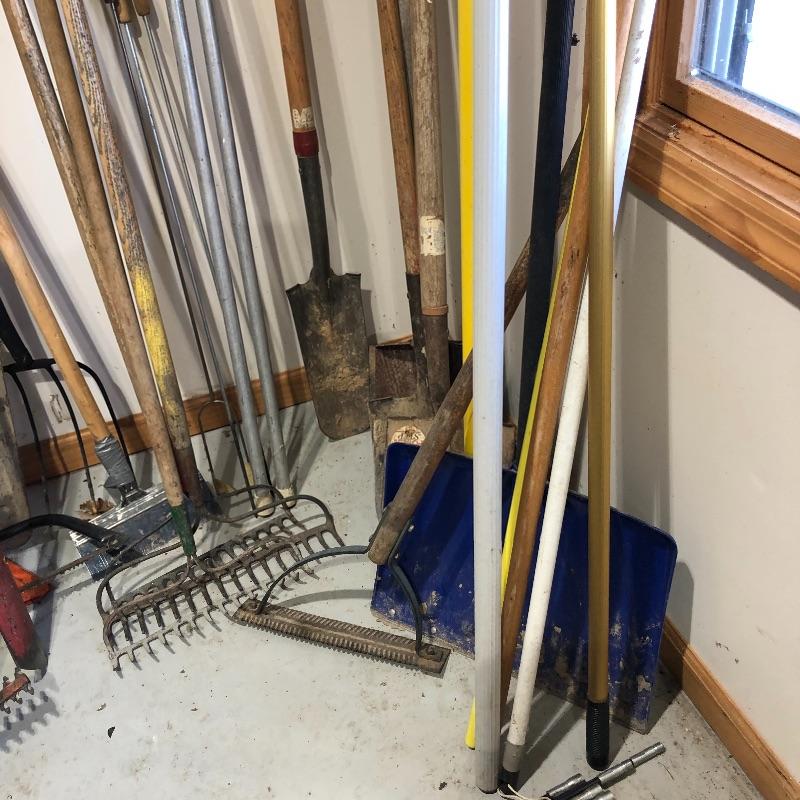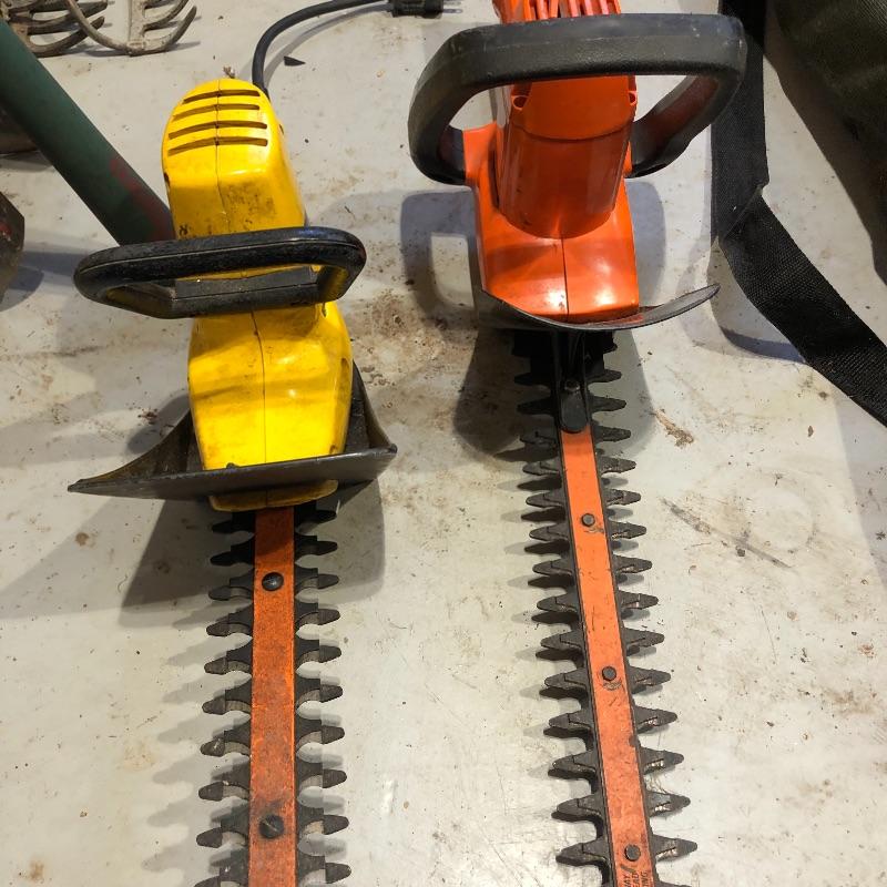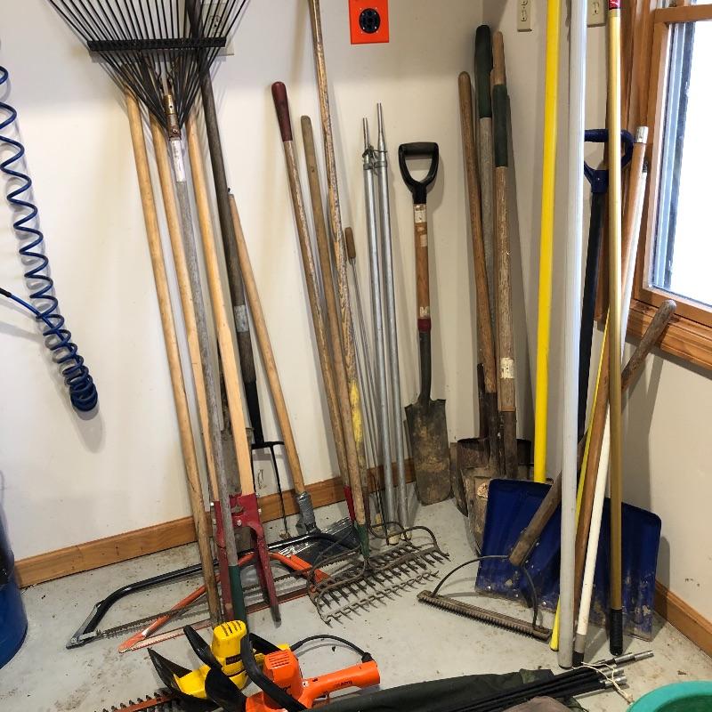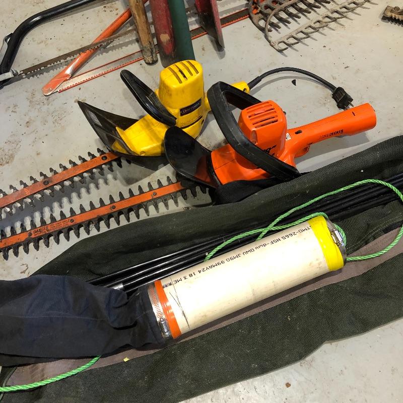 This lot includes numerous tools that will make your yard work easier! It includes two bush trimmers, two hand saws, a post hole digger, three metal rakes and a leaf rake, a spade and five shovels, a hand Weed whacker, a snow shovel, a craftsman tree trimmer, and numerous extension poles for painting. Both bush trimmers worked when plugged in Local pick up only.