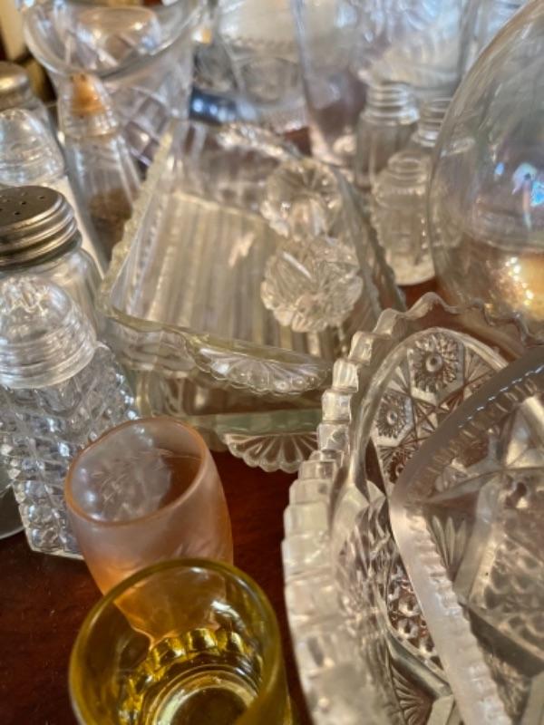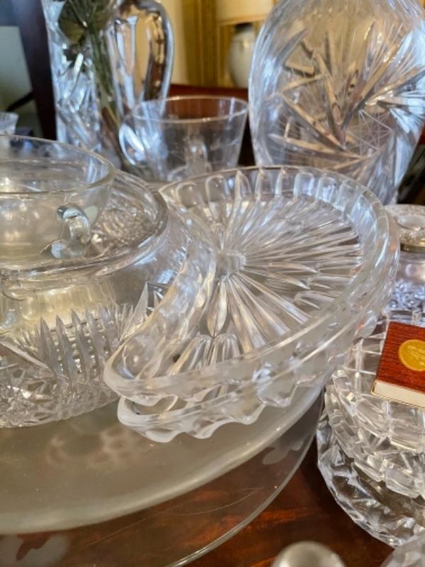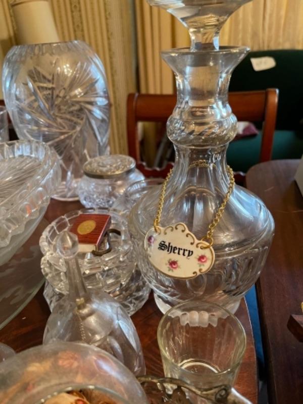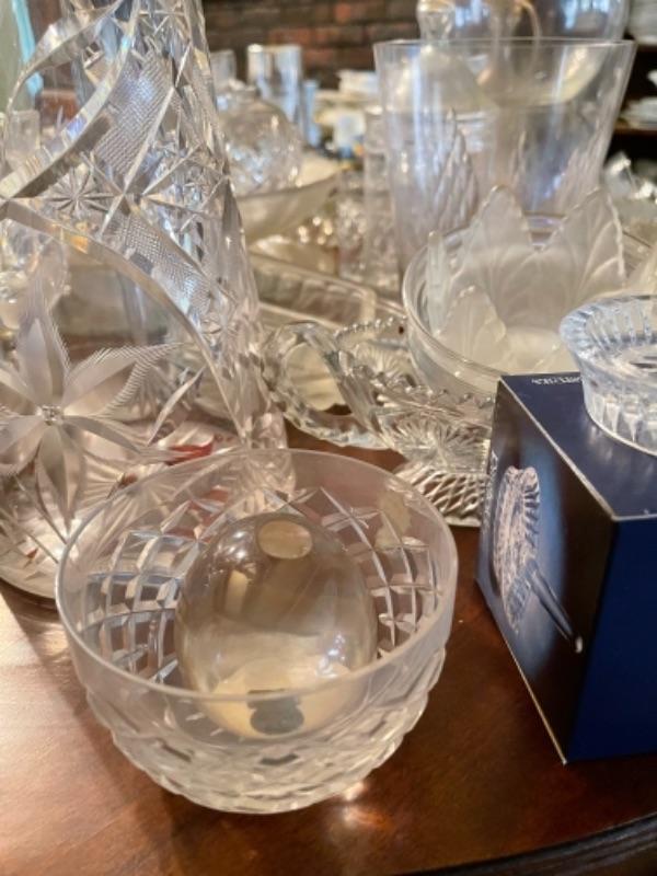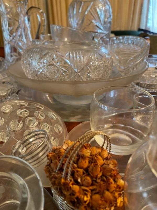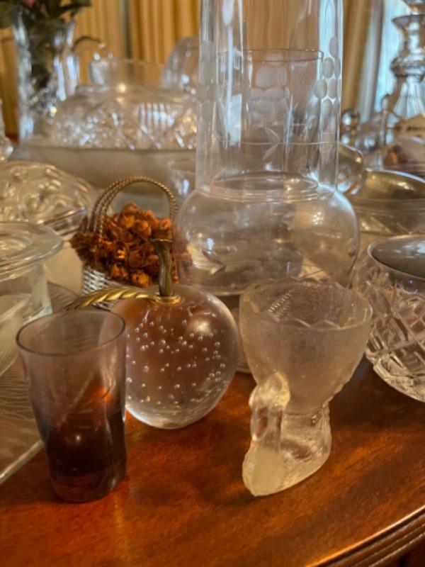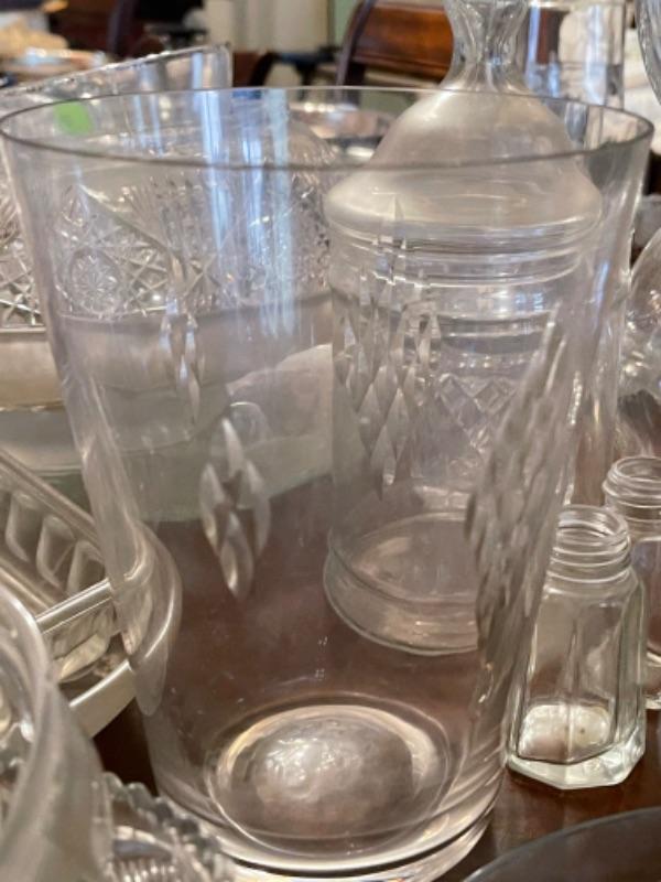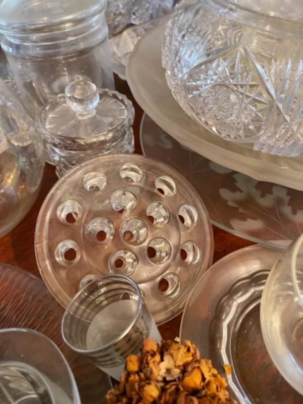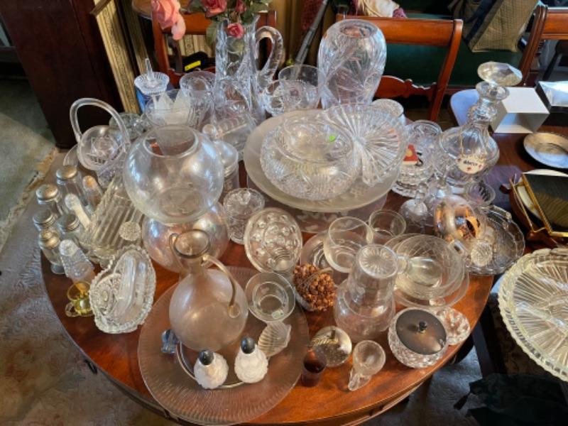 Lot 24DR. Collection of crystal and glass vases, decanters, flower frogs, salt/pepper shakers, ring dish, ice bucket, pitcher, etc.--$130