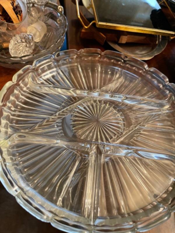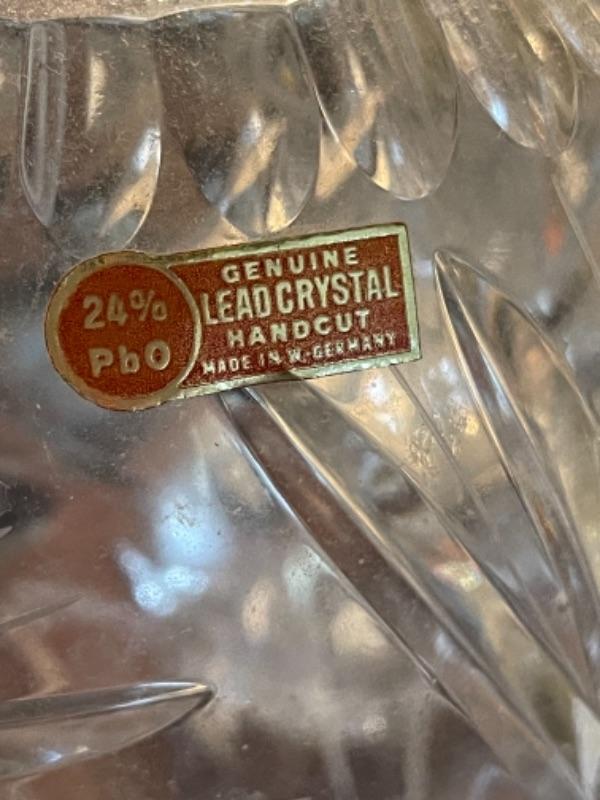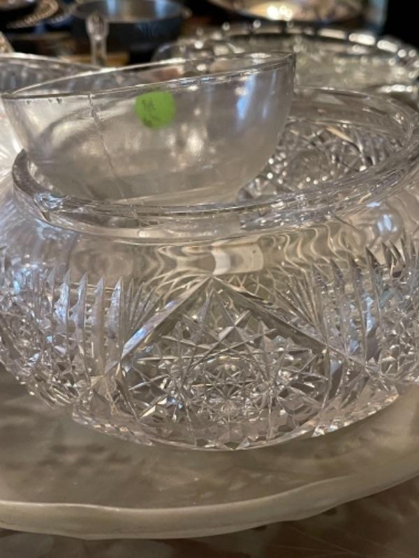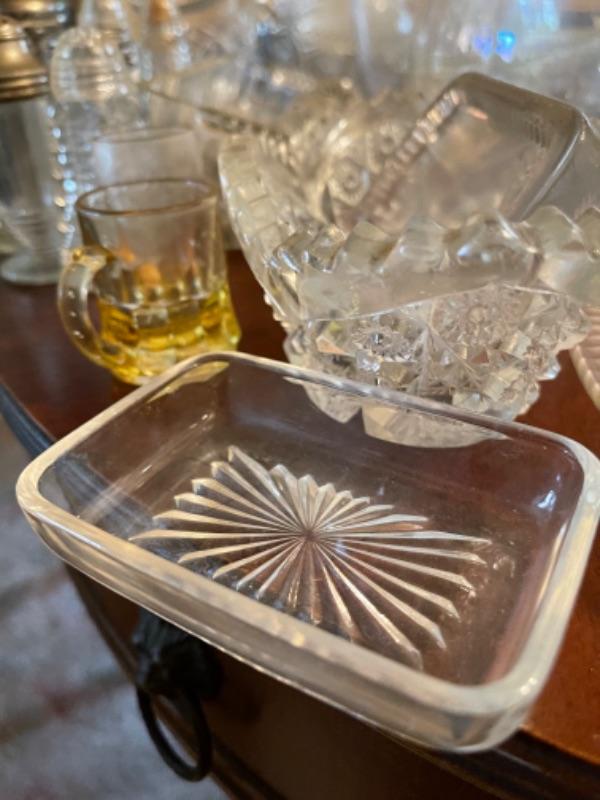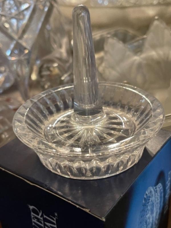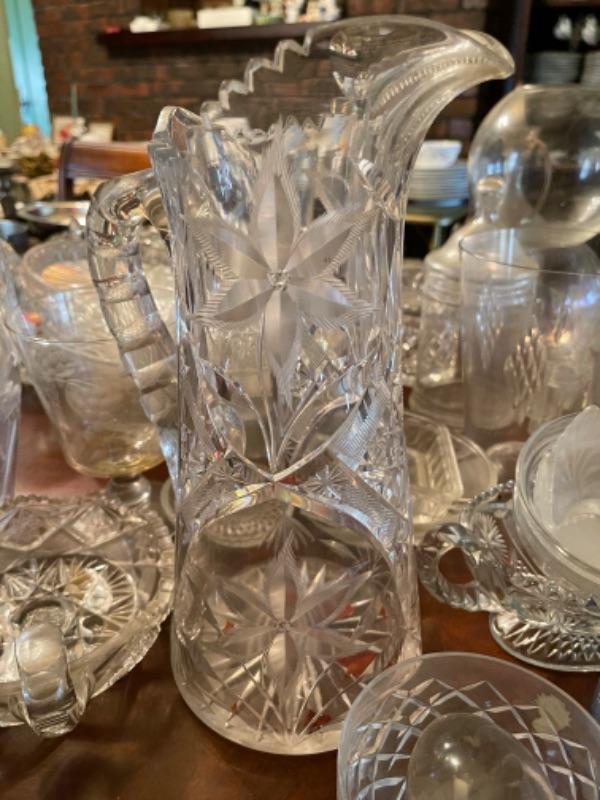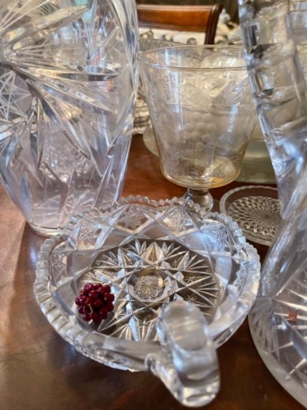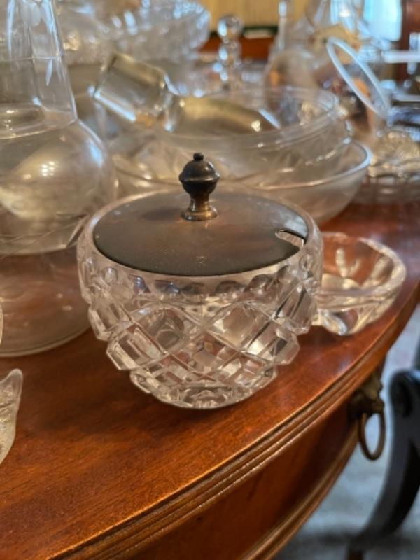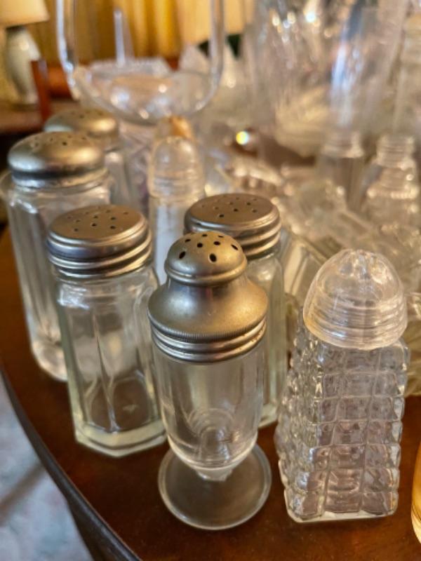 Lot 24DR. Collection of crystal and glass vases, decanters, flower frogs, salt/pepper shakers, ring dish, ice bucket, pitcher, etc.--$130