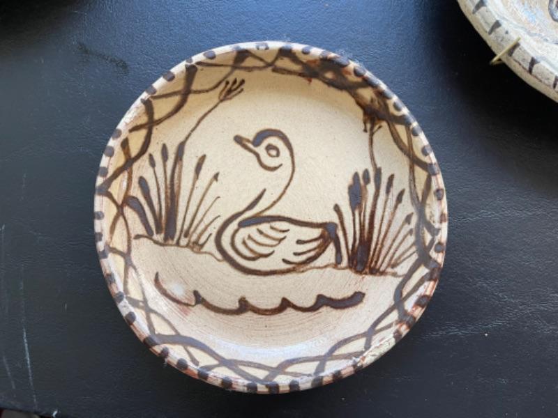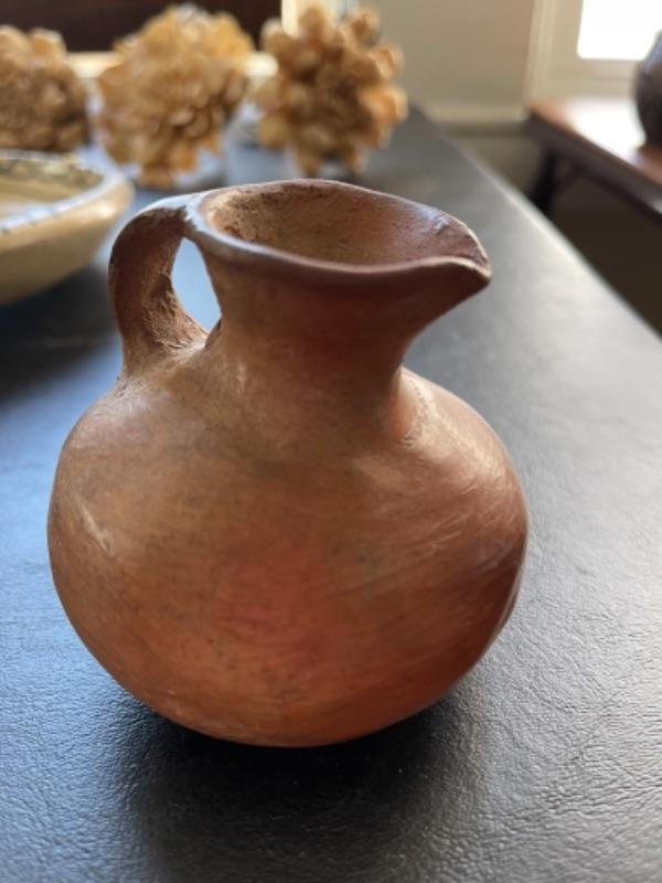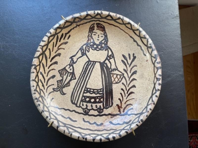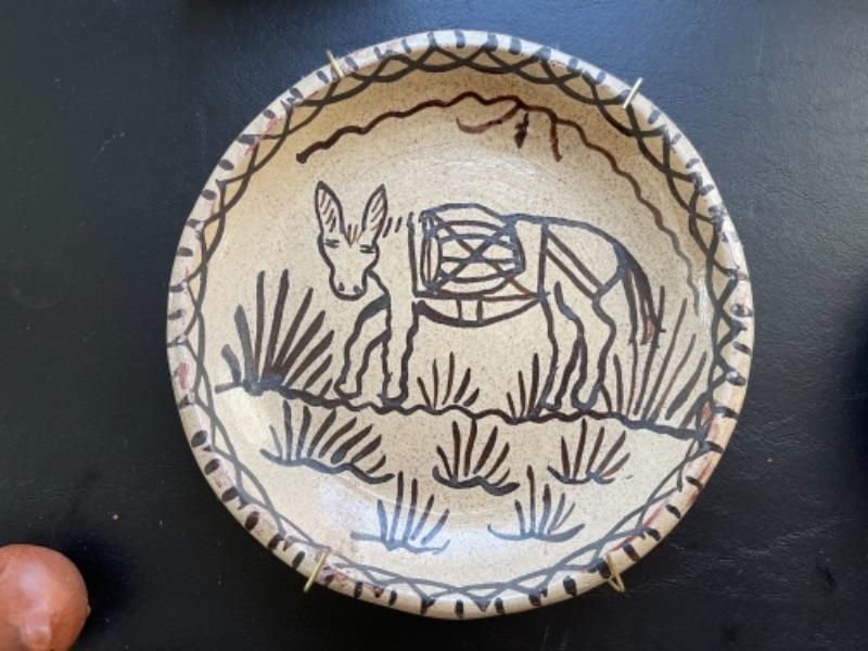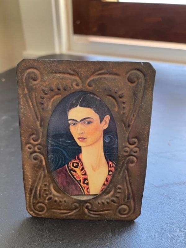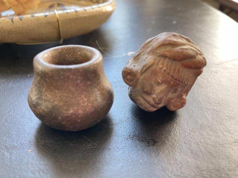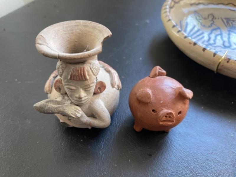 Lot 24LD. Three Mexican Tonala ceramic wall plates, ceramic jugs, ceramic Mayan head, tin frame of Frida Kahlo--$45