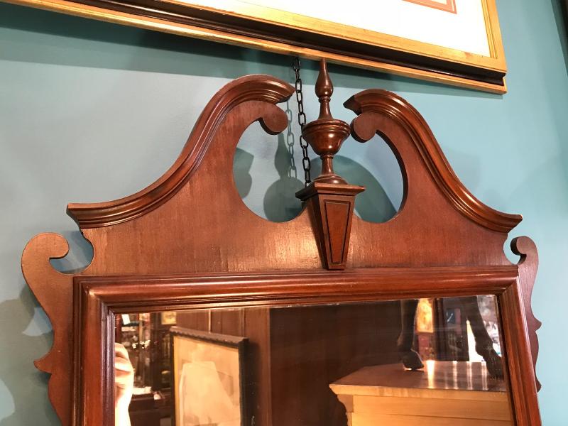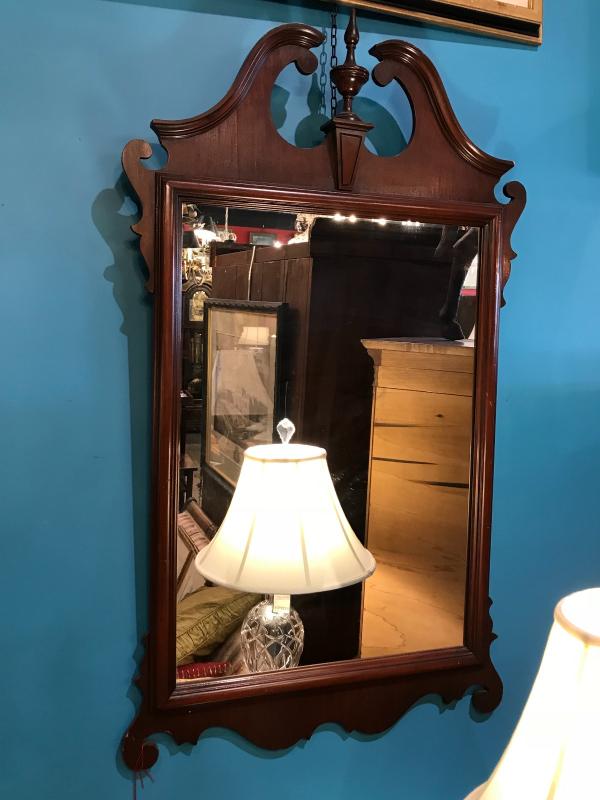 Very nice vintage mahogany Chippendale style mirror with scroll bottom and scrolled broken pediment with turned finial. 26" x 44"