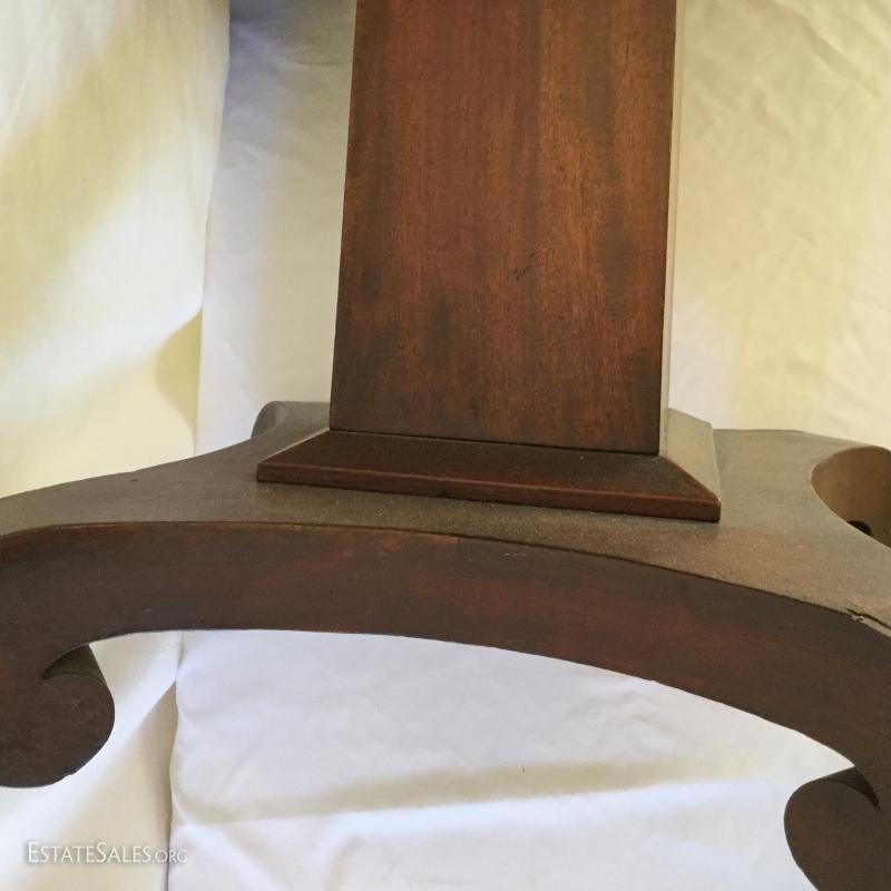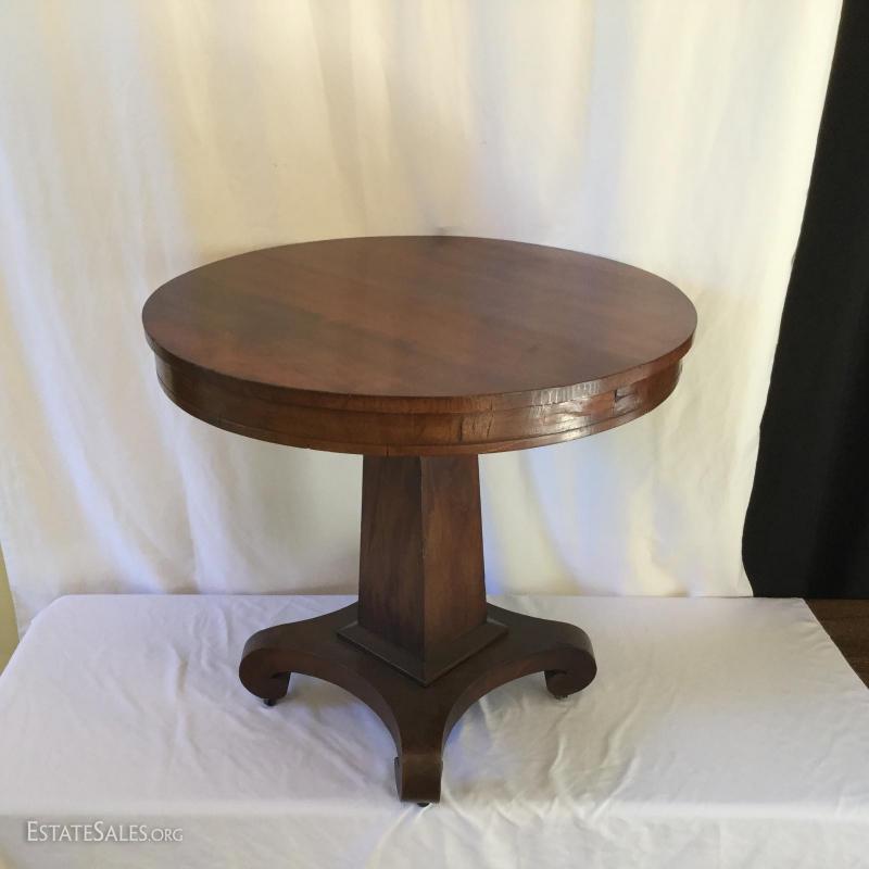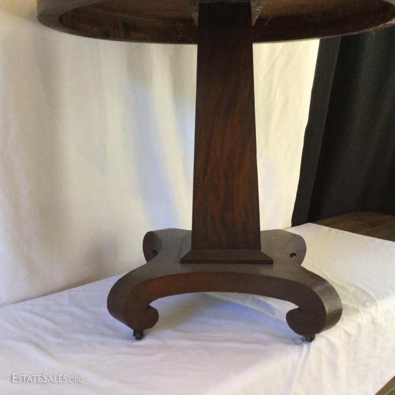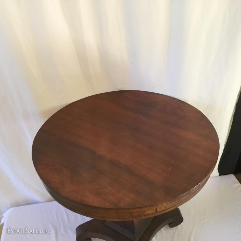 Lovely wooden pedestal table on wheels. Gorgeous wood. Great accent table. 29.5" diameter X 27" high.