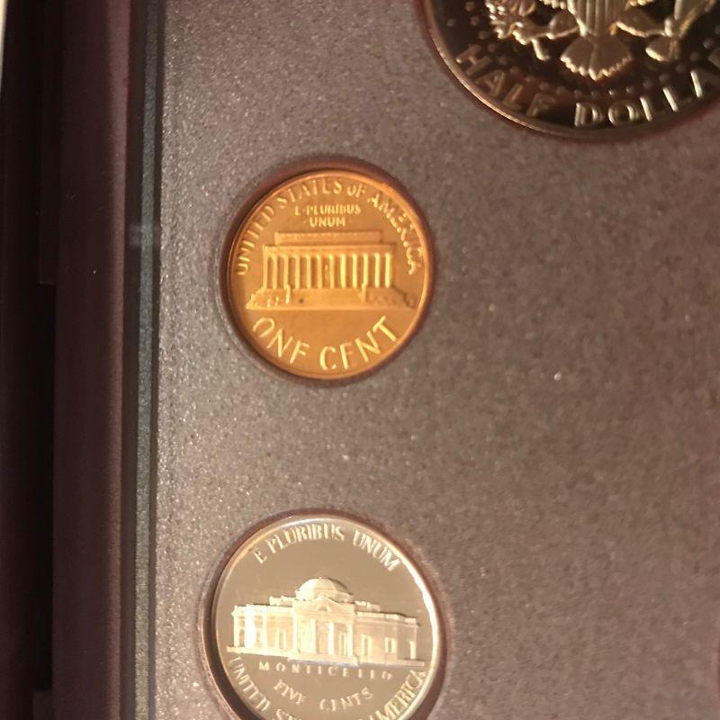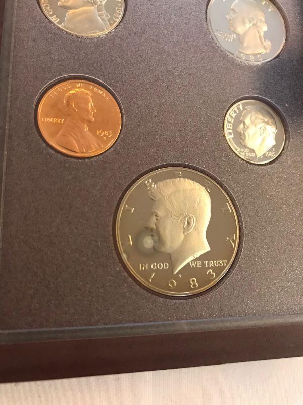 Six 1983 Prestige Sets. One half dollar has a blemish noted in photos. Four of the six pennies have either discoloration or a black spot.