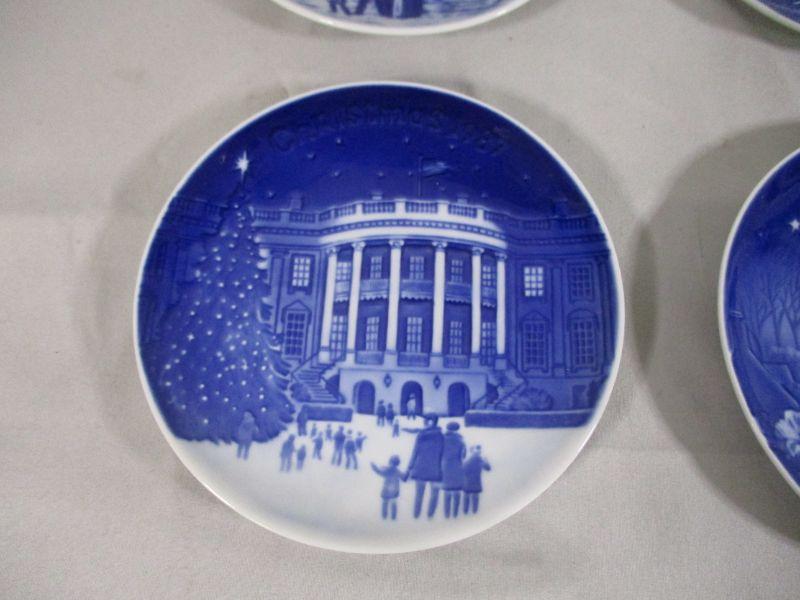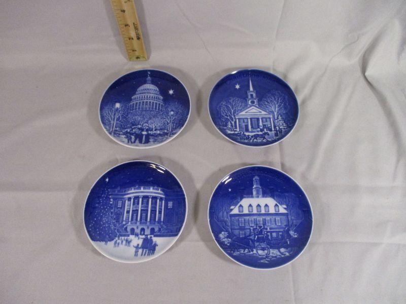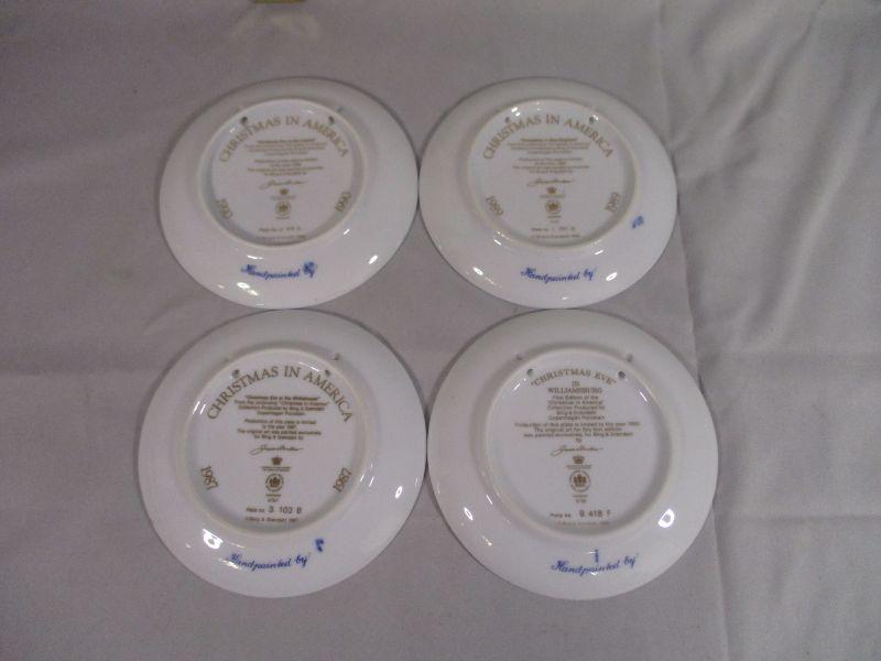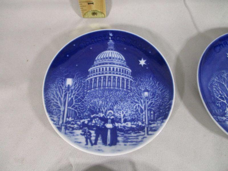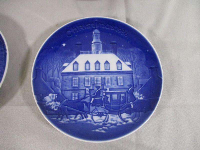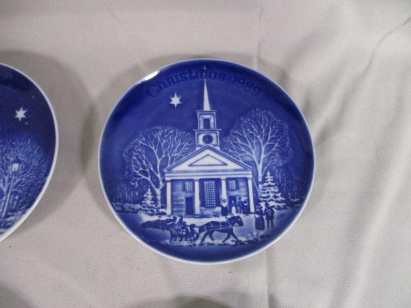 There plates are: Christmas 1986, Christmas 1987, Christmas 1989, and Christmas 1990. Each plate is part of the Christmas in America series from Bing and Grondahl and measures about 5.25" in diameter.