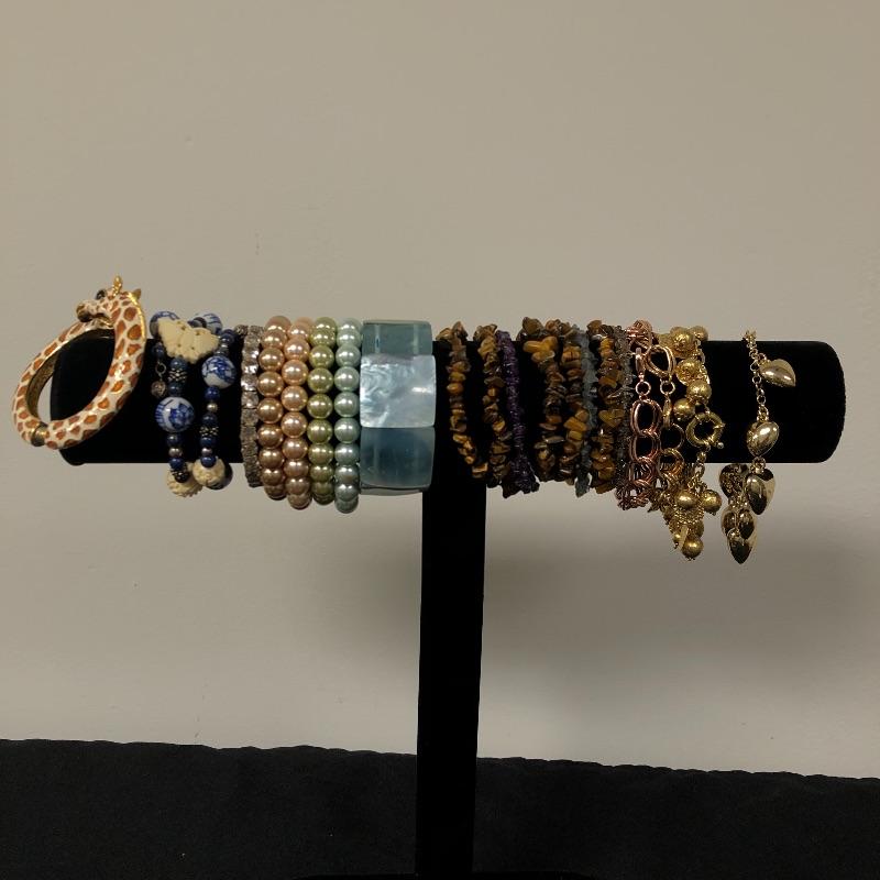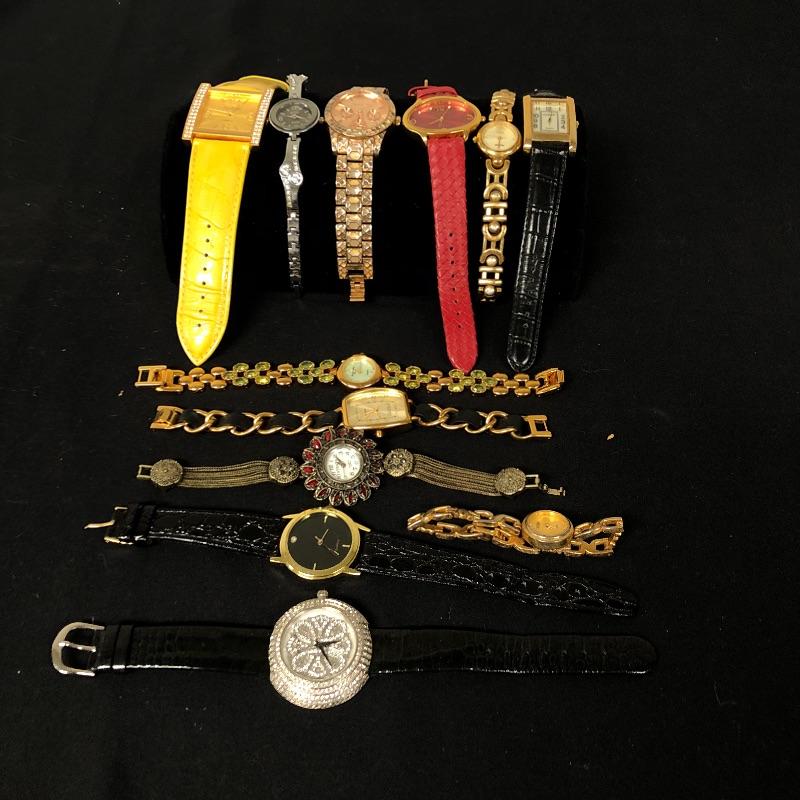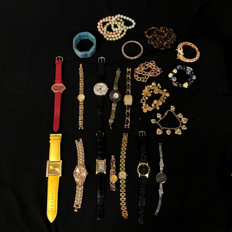 This lot contains several beautiful watches with genuine leather as well as several beautiful bracelets. Some of the bracelets include beautiful charm bracelets, bracelets with small rocks/gems, and faux pearl bracelets. The watches include brands such as Joan River’s Classics, BTL Quartz, Gossip Quartz, Medana, and more. Lastly, it comes with a tool to help assist with the clasp on the bracelet. Shipping available.