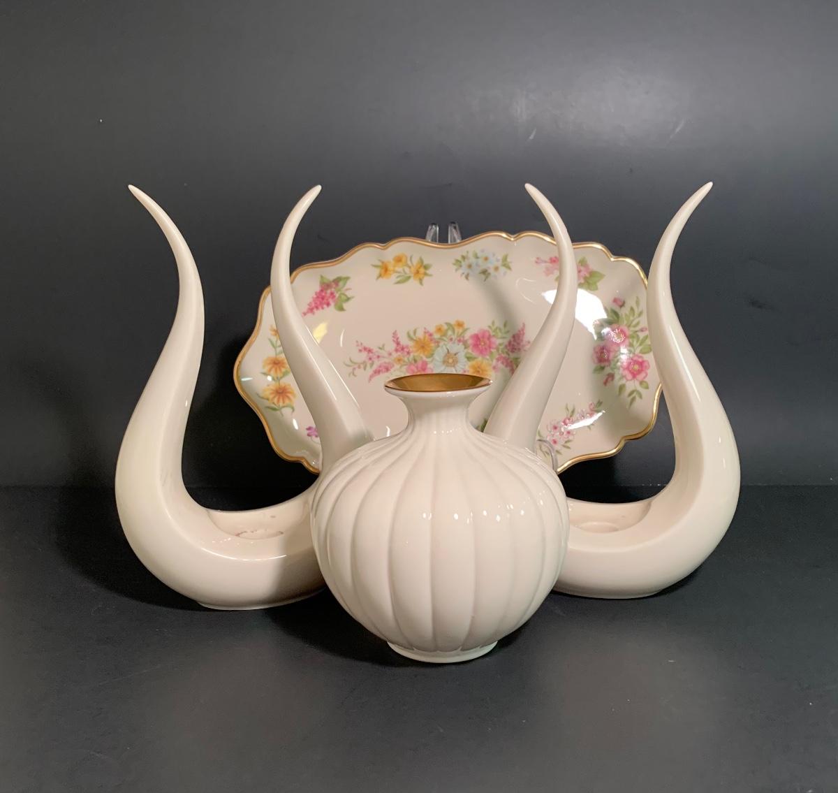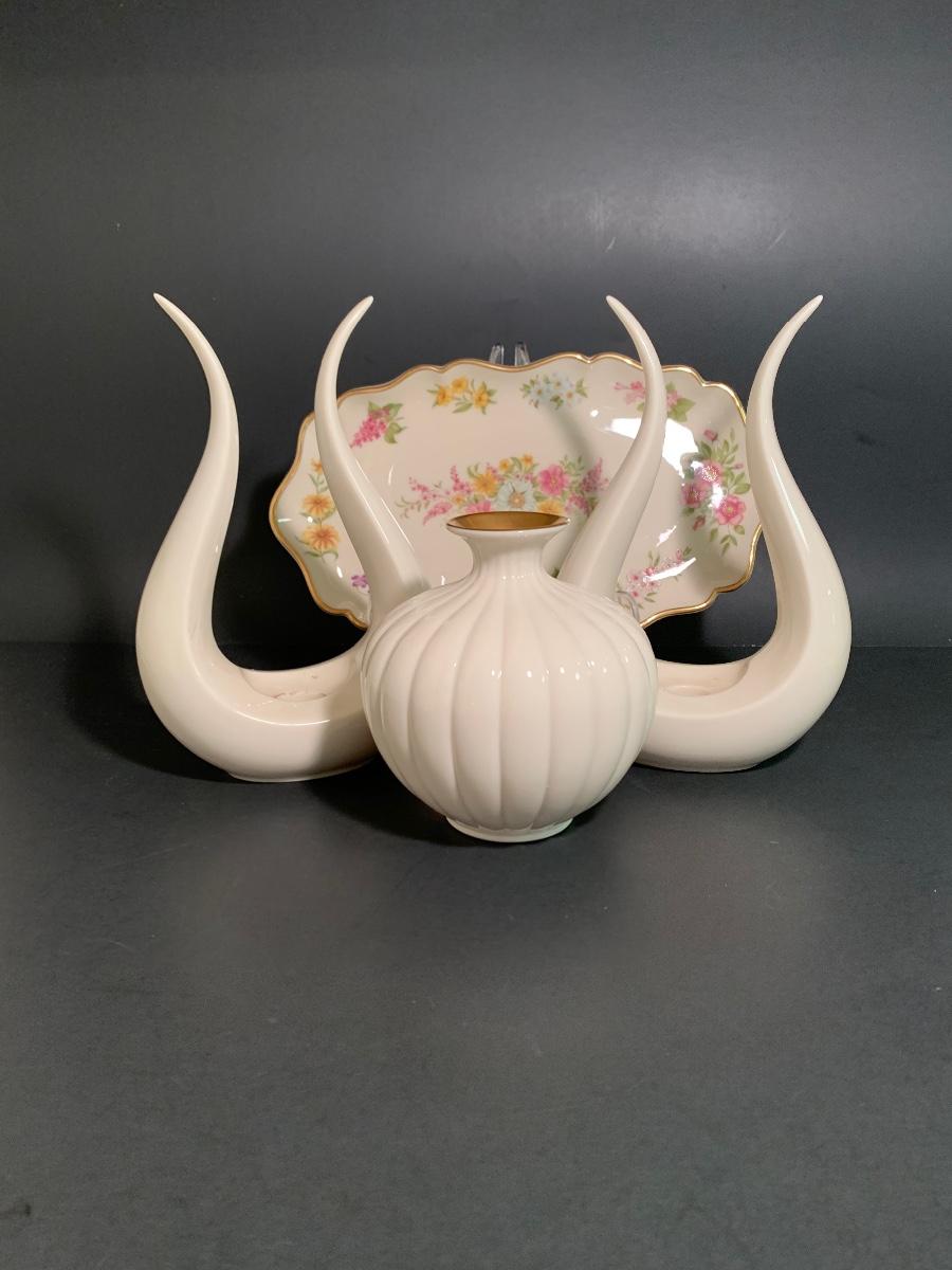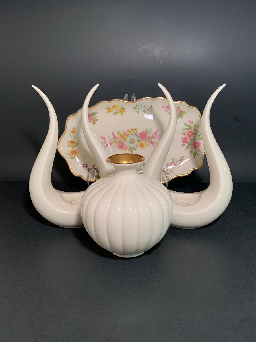 Beautiful vintage collection of Lenox. There a pair of MCM Tulip Leaf Lyre Candlestick Holders which are