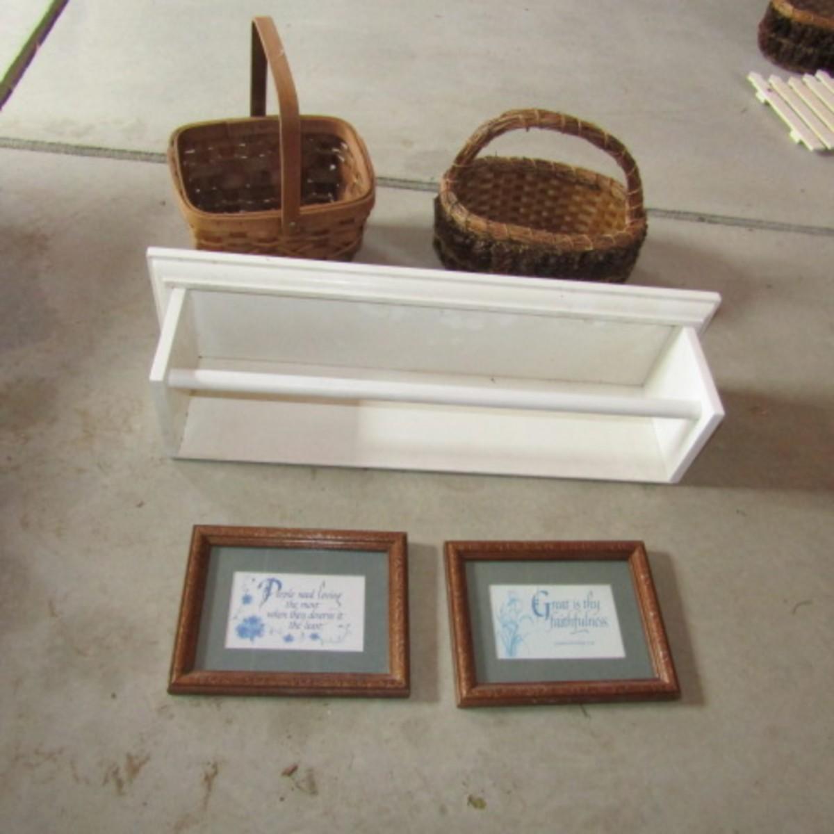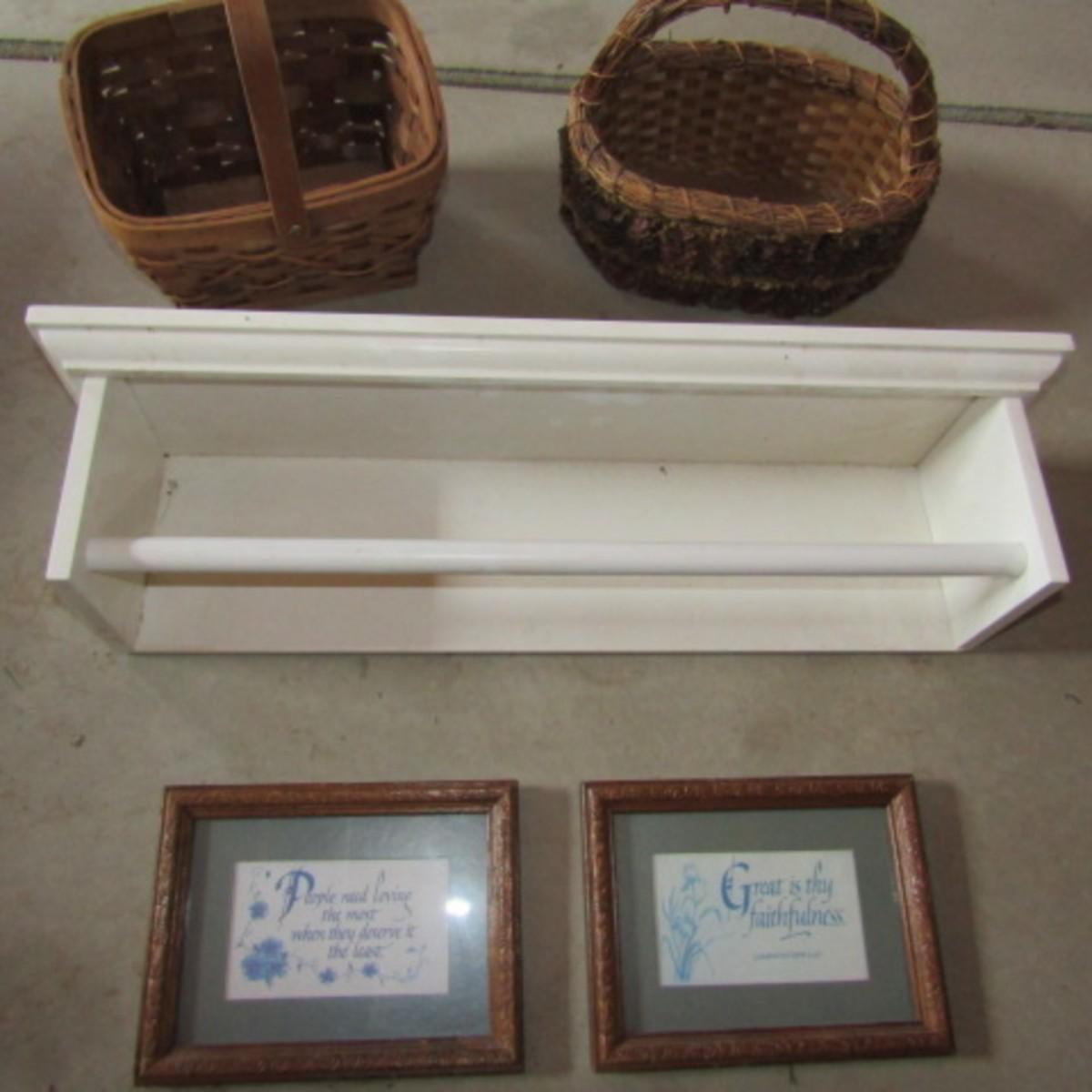 LOT 25  WOODEN WALL SHELF, BASKETS AND 2 PICTURES (W)