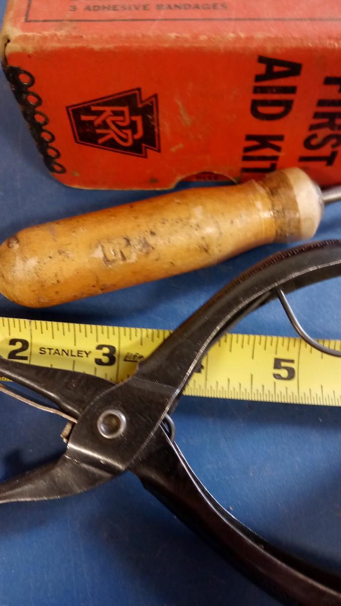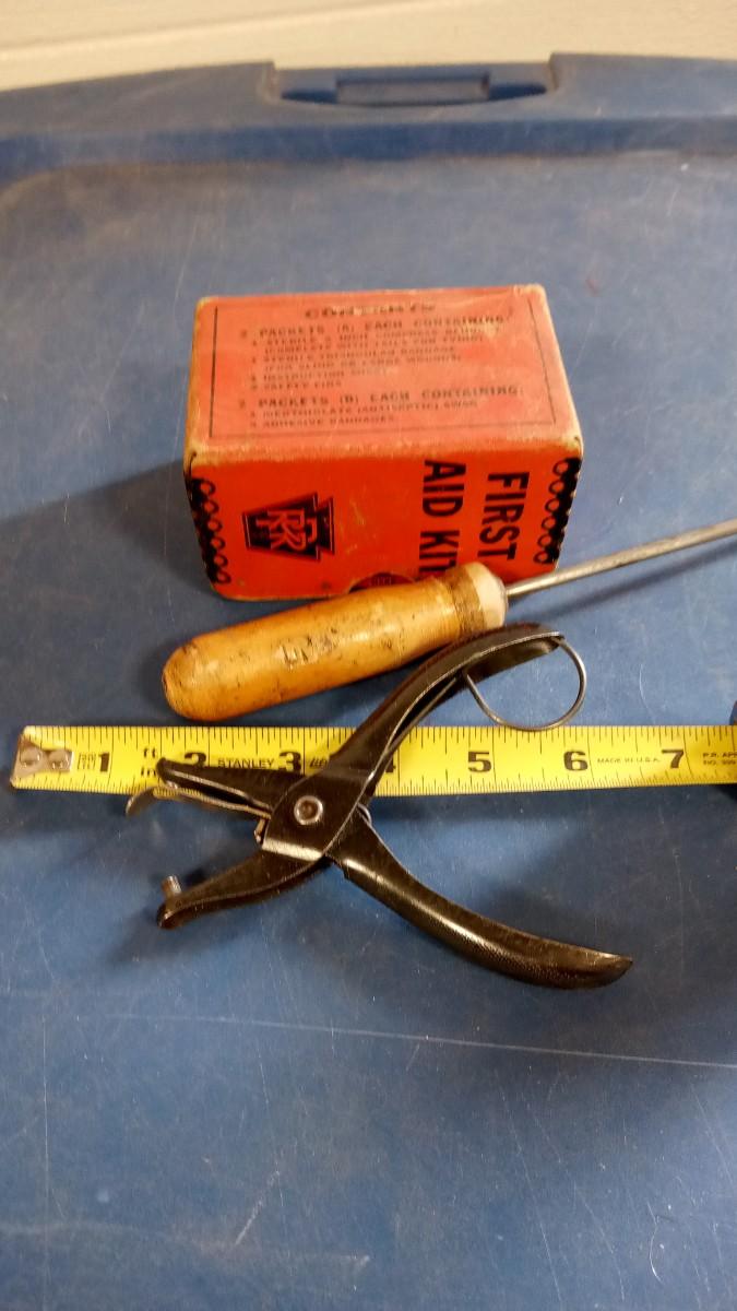 FIRST AID KIT PITTSBURGH AND PENN., UNION PACIFIC ICE PICK AND RAILROAD TICKET PUNCH
