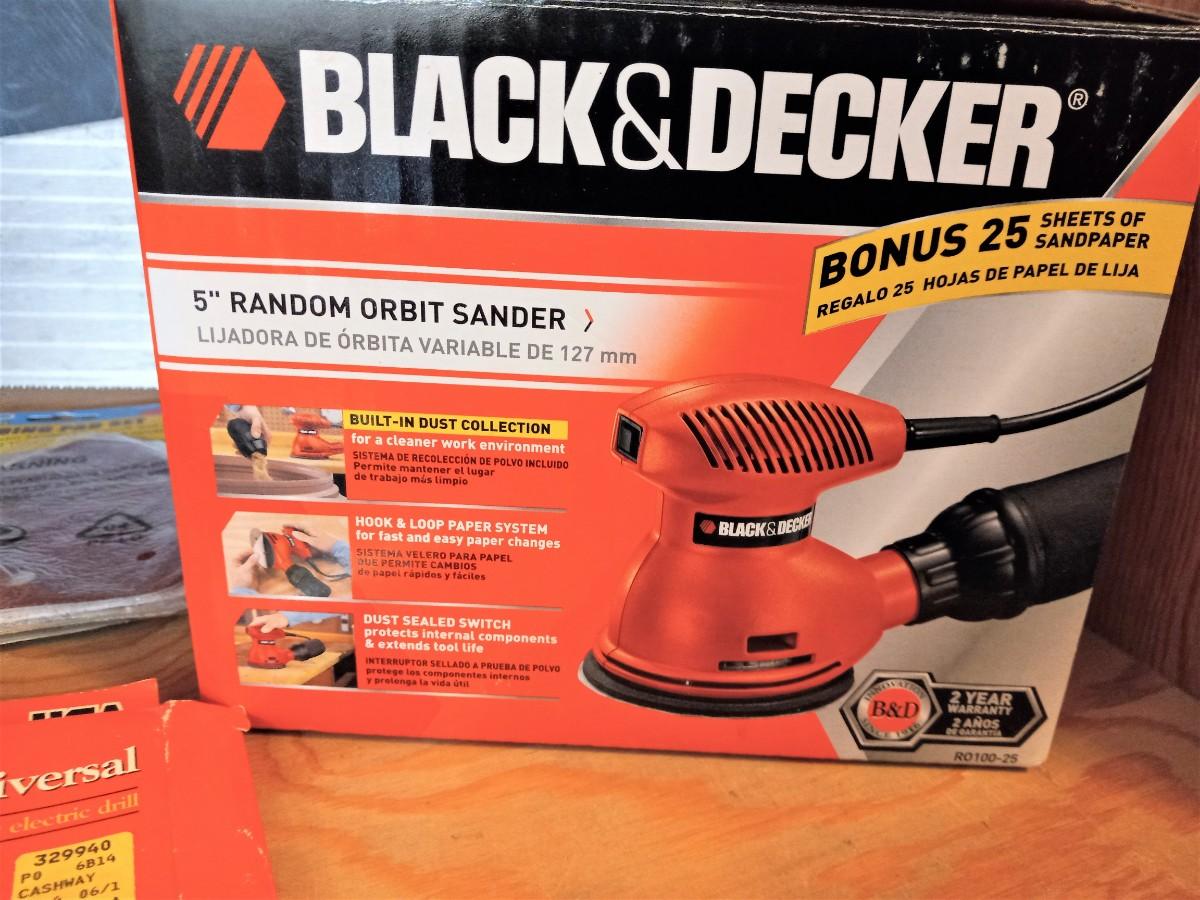 LOT 25 NEW ORBIT SANDER, SANDPAPER, HAND SAW AND MORE