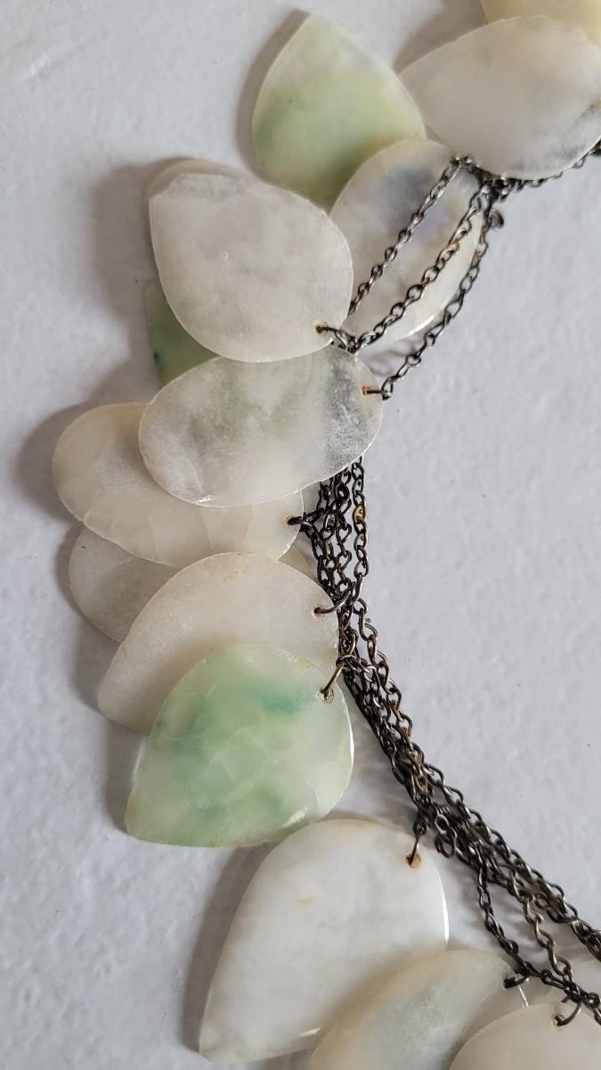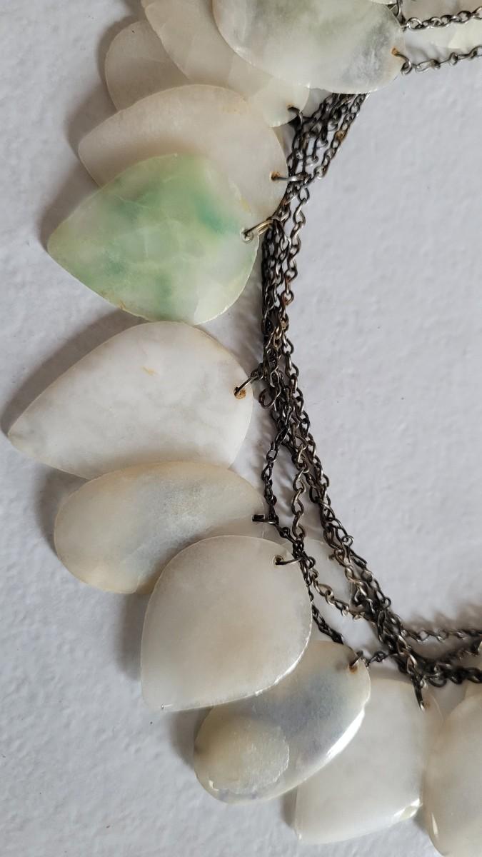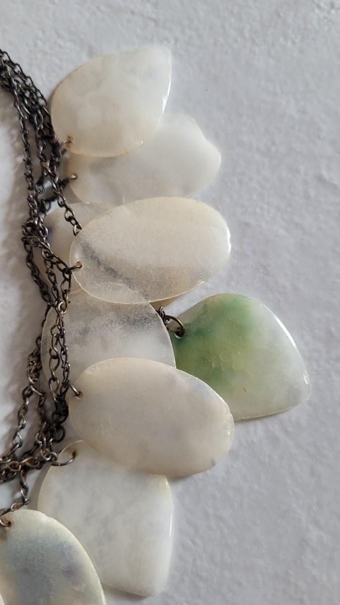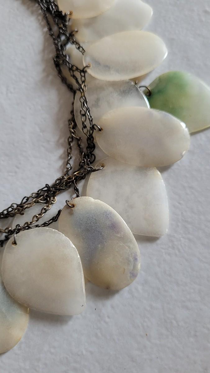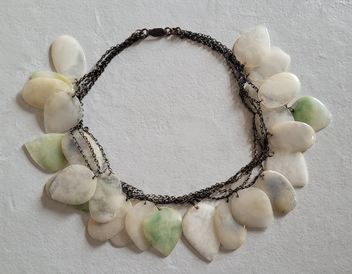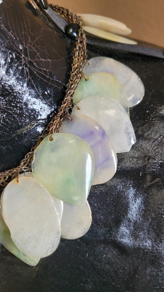 What a rare piece! Thin jade pieces are hung together to create a musical, colorful necklace. The jade pieces are white and green & white and blue/lavender. Such a beauty. There are possibly pieces missing. Some possible chips.