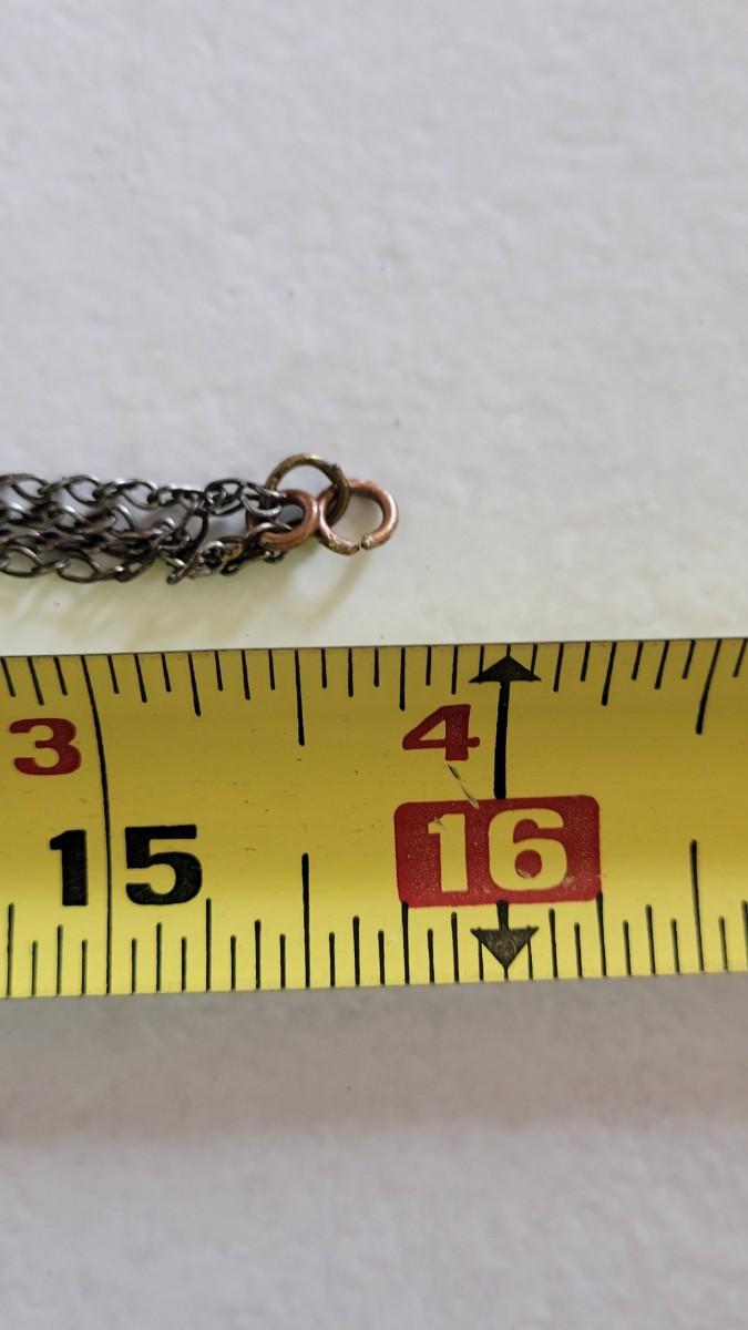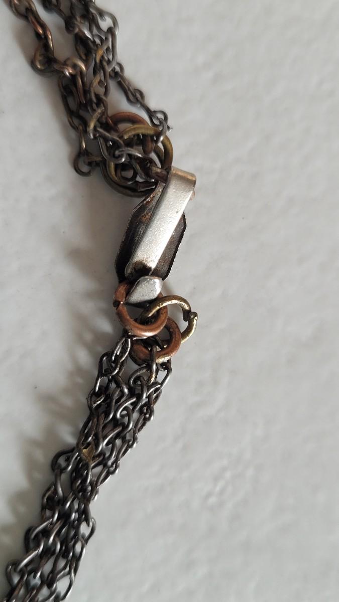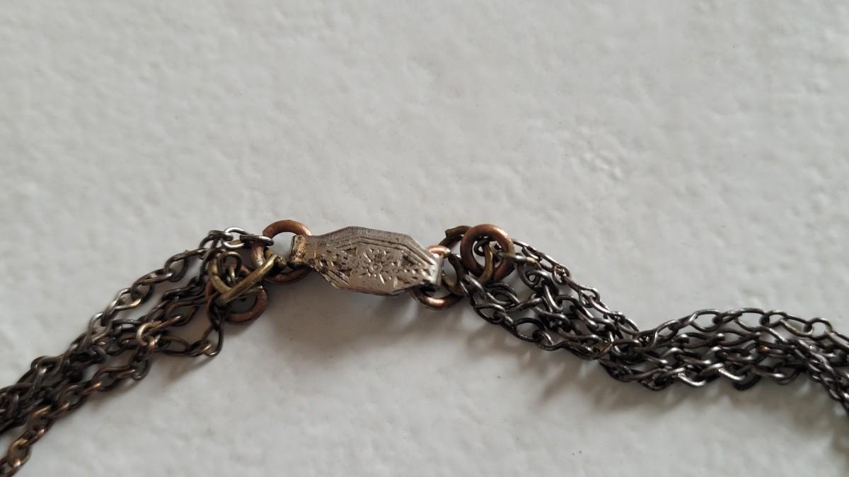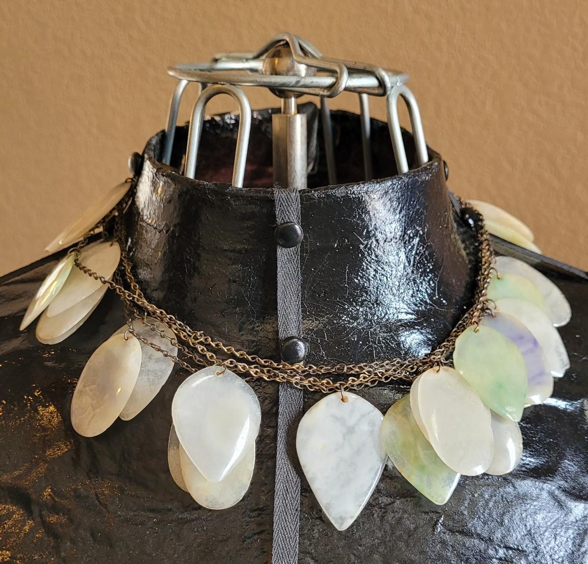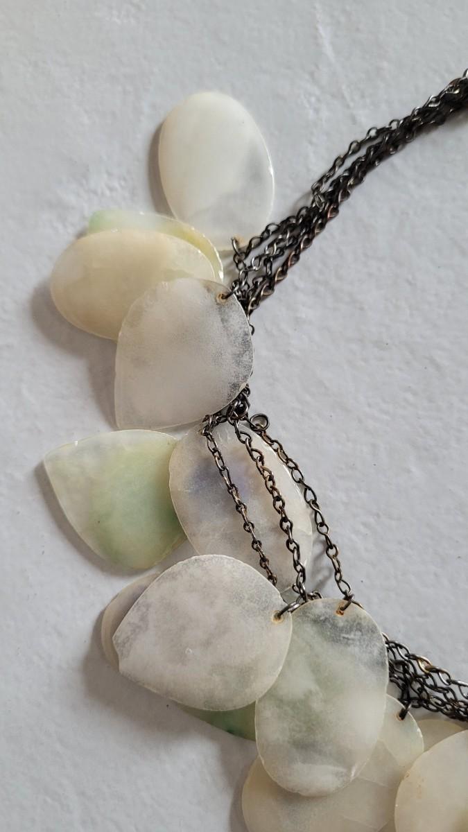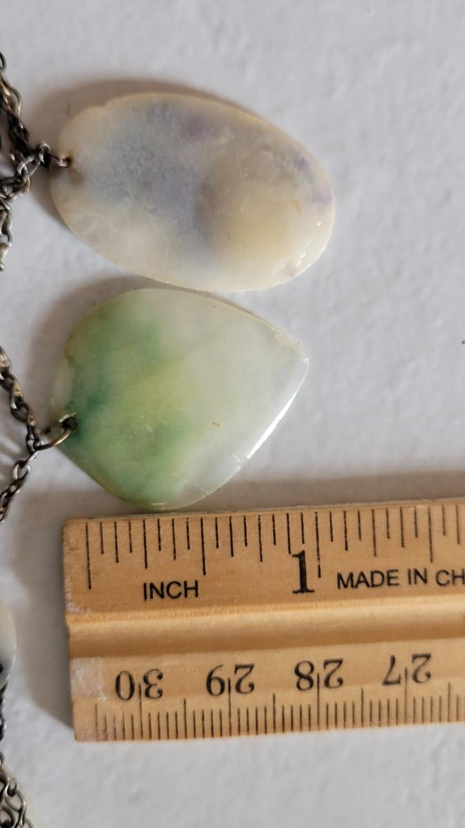 What a rare piece! Thin jade pieces are hung together to create a musical, colorful necklace. The jade pieces are white and green & white and blue/lavender. Such a beauty. There are possibly pieces missing. Some possible chips.