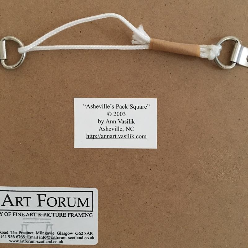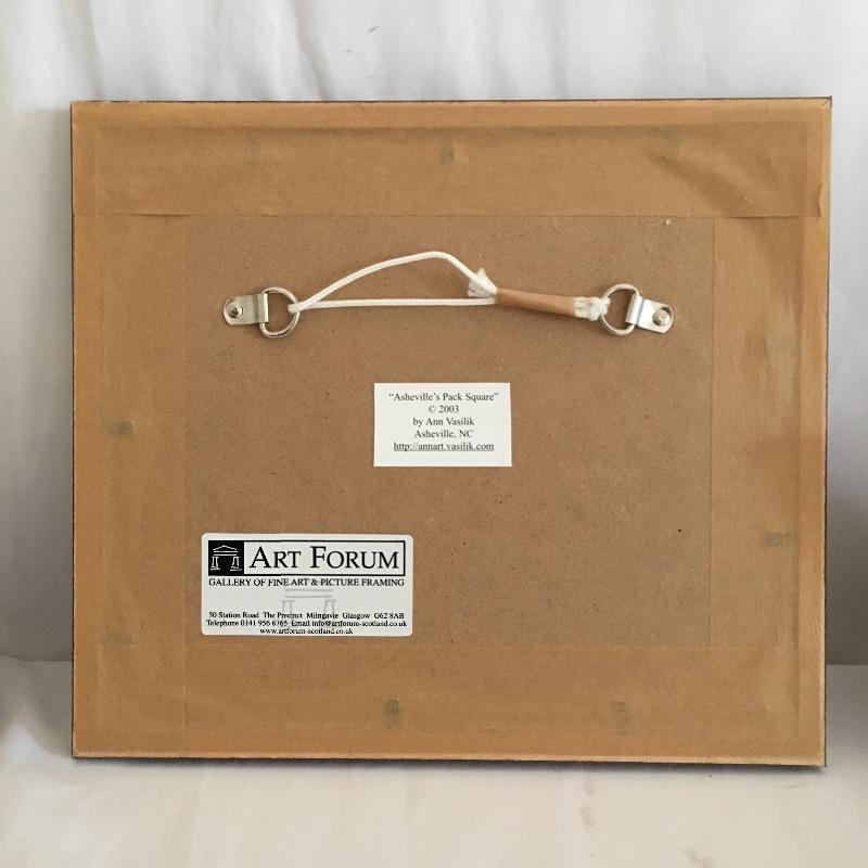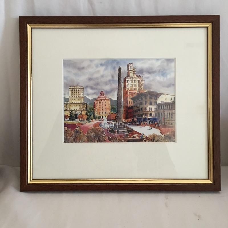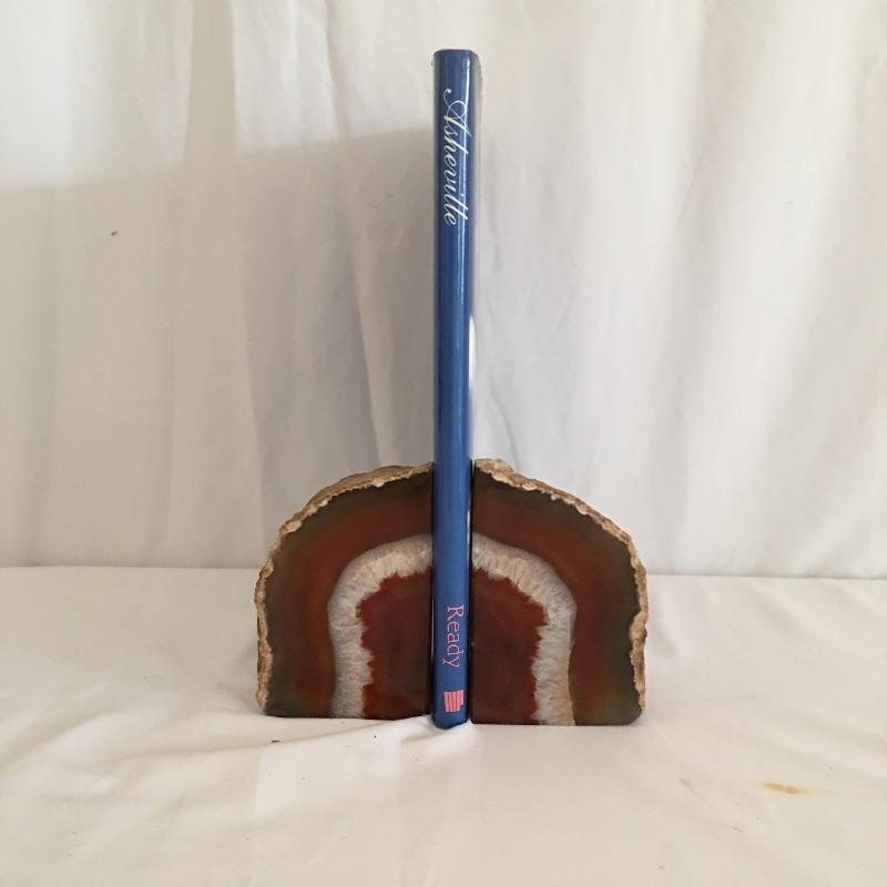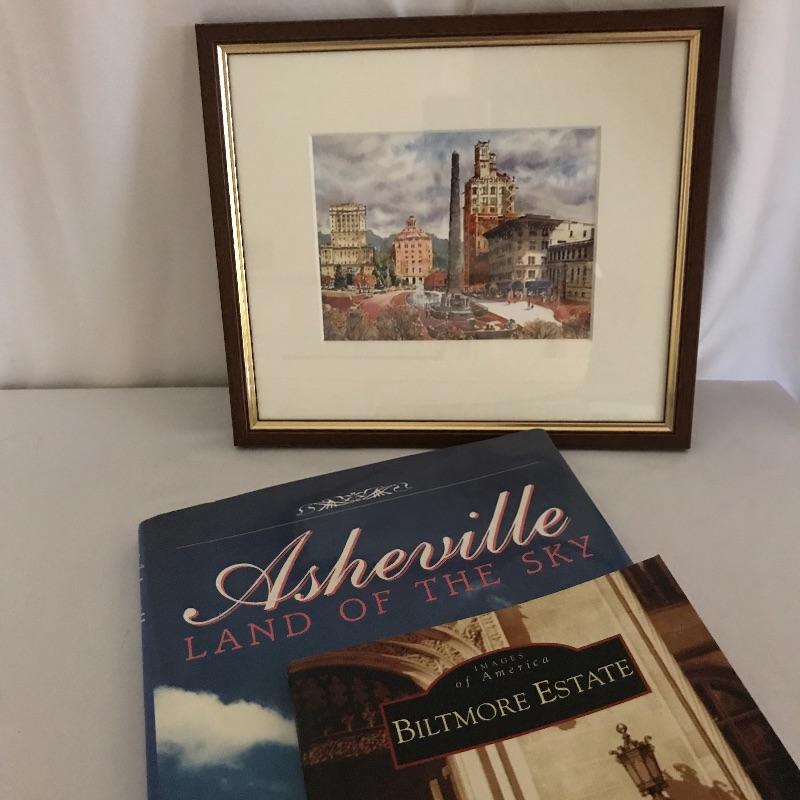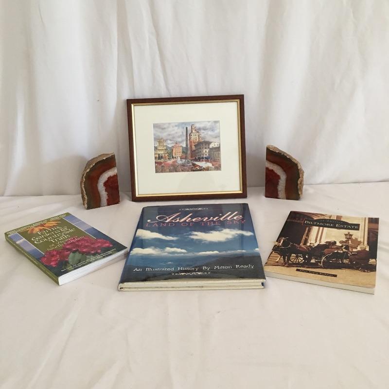Asheville collection includes geode bookends, framed and matted artwork by Ann Vasilik. Art is behind glass in a nice frame measuring 9” x 10”. Asheville Land of Sky book and a book about the Biltmore estate.