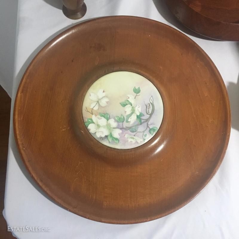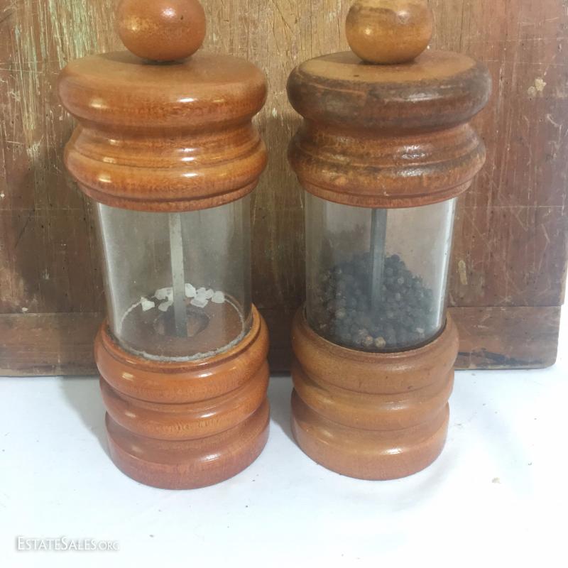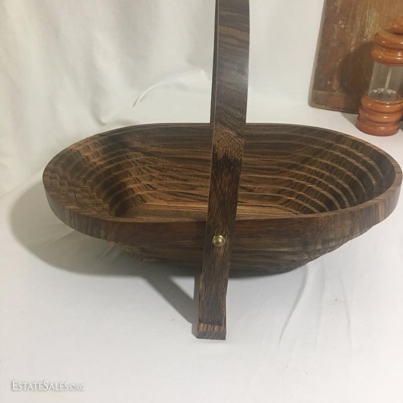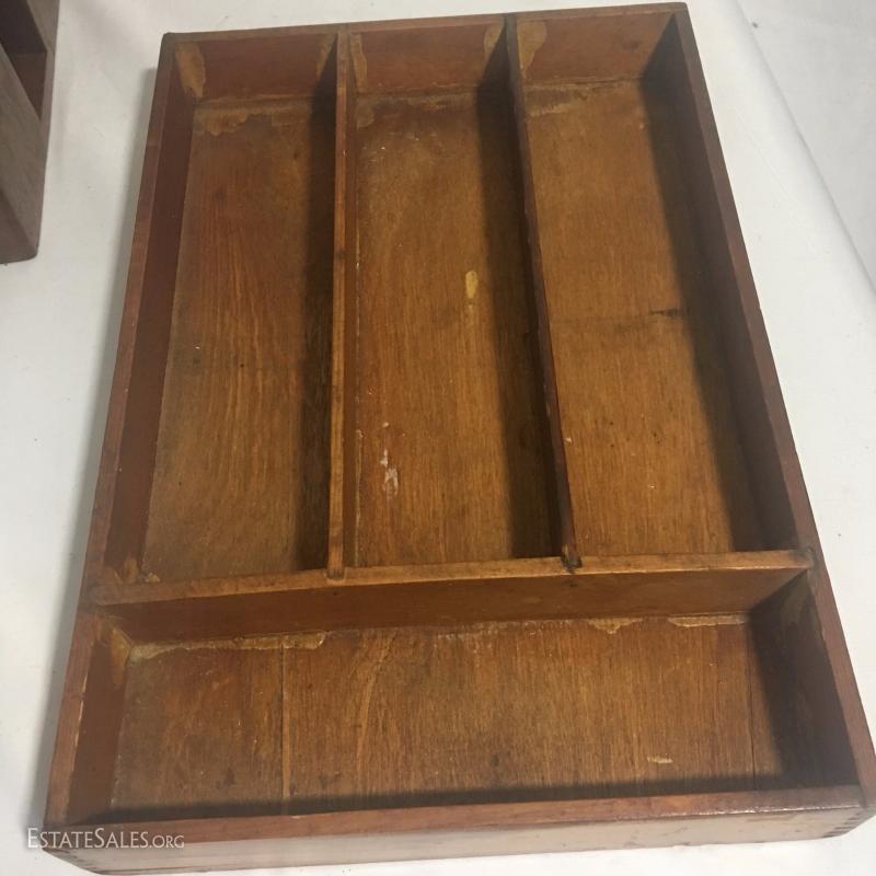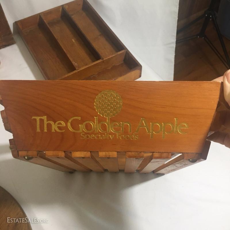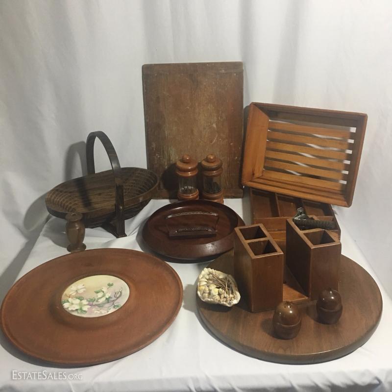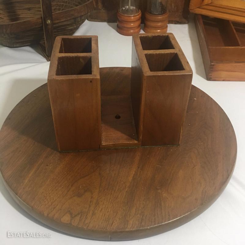 Large wooden kitchen lot. Includes custom made lazy Susan, salt and pepper shakers, silverware tray, collapsible basket, trays and utensils. See photos.
