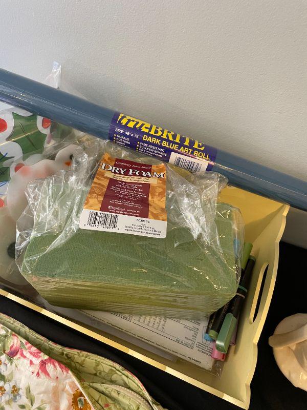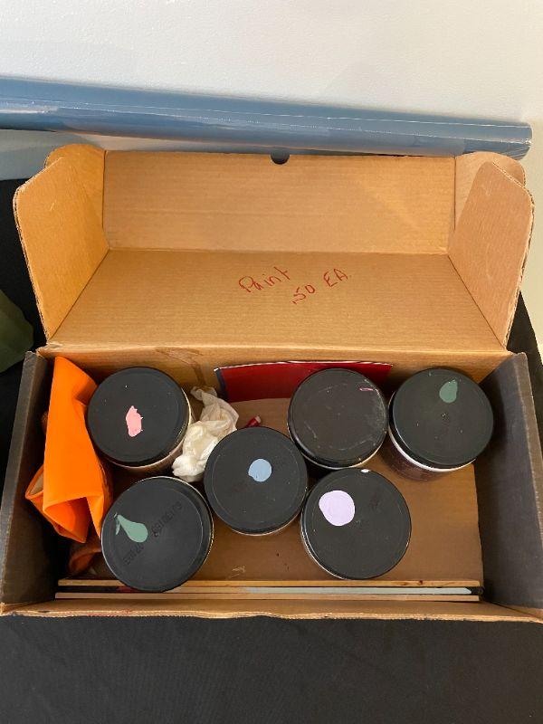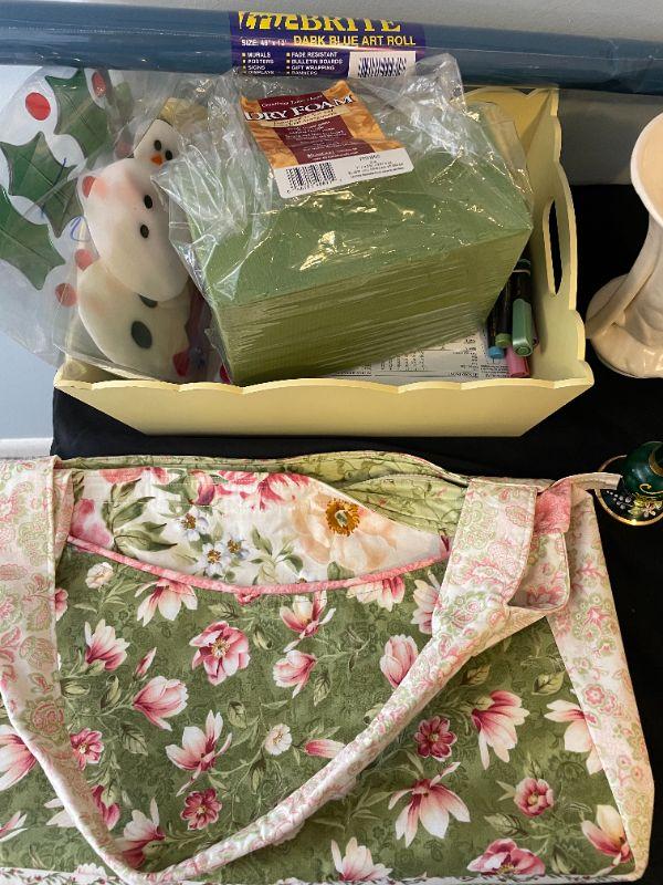 Bag, plaque, (3) vases, glassware, crafts supply, signed and numbered picture, hand painted glass vase, box of paints, dark blue art roll.