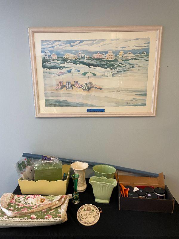 Lot 25 - Bag, plaque, (3) vases, glassware, crafts supply, signed and numbered picture