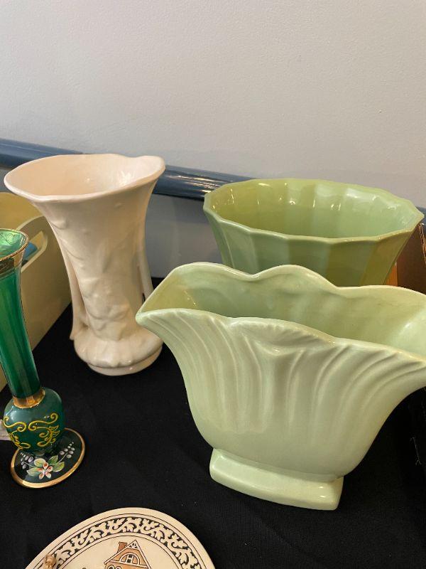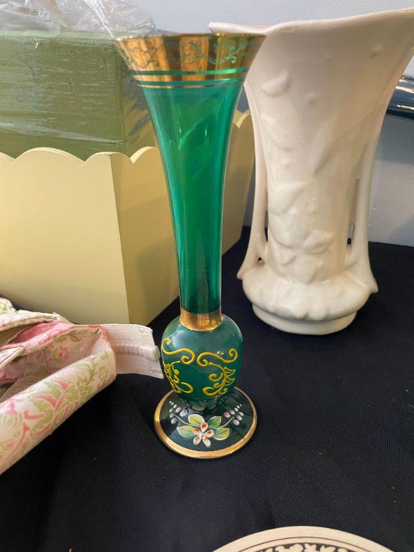 Lot 25 -  Bag, plaque, (3) vases, glassware, crafts supply, signed and numbered picture