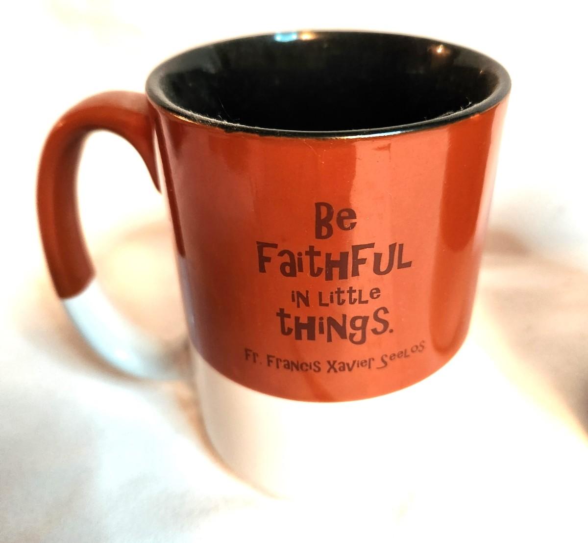 Mrs. Fountain was devoted to Blessed Franicis X. Seelos and was active at the shrine in the Irish Channel. These items were sold in the gift shop there - not sure if they are still available. You get all you see here - two good quality mugs with a quote from Seelos "Be faithful in little things" - advice we all should take - along with a neat terra cotta figure of the good Father. - designed as a window hanger. Figure is 10.5" tall - all in good condition.
