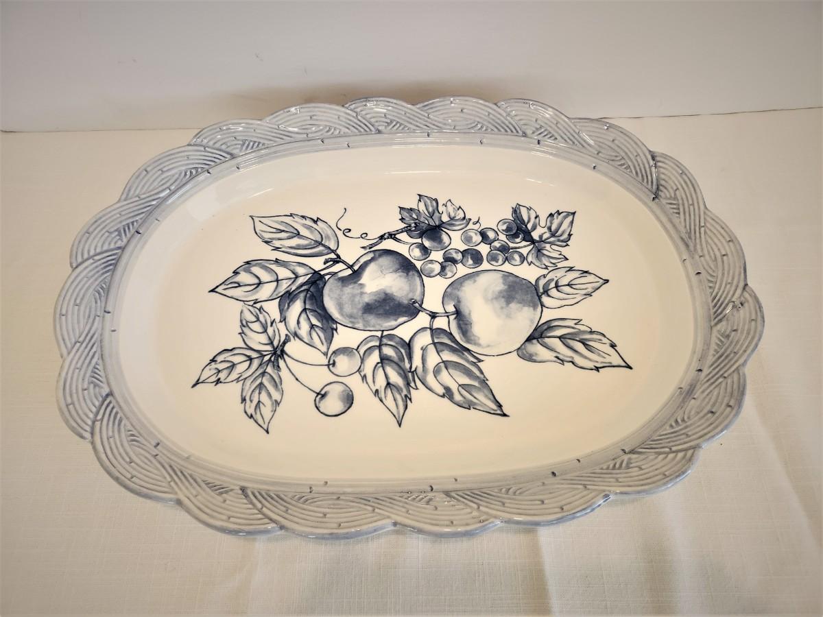 Nice contemporary blue/white decorative platter - fruit motif - made Italy. Good condition, 18" x 12".