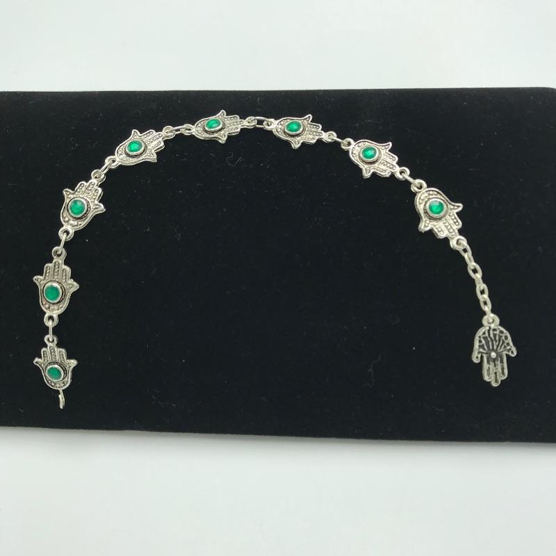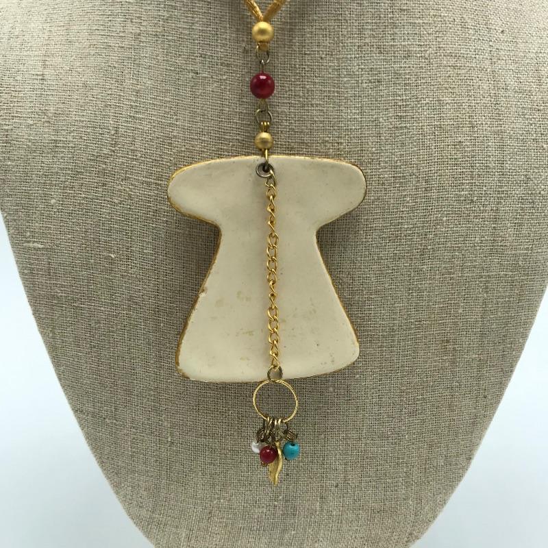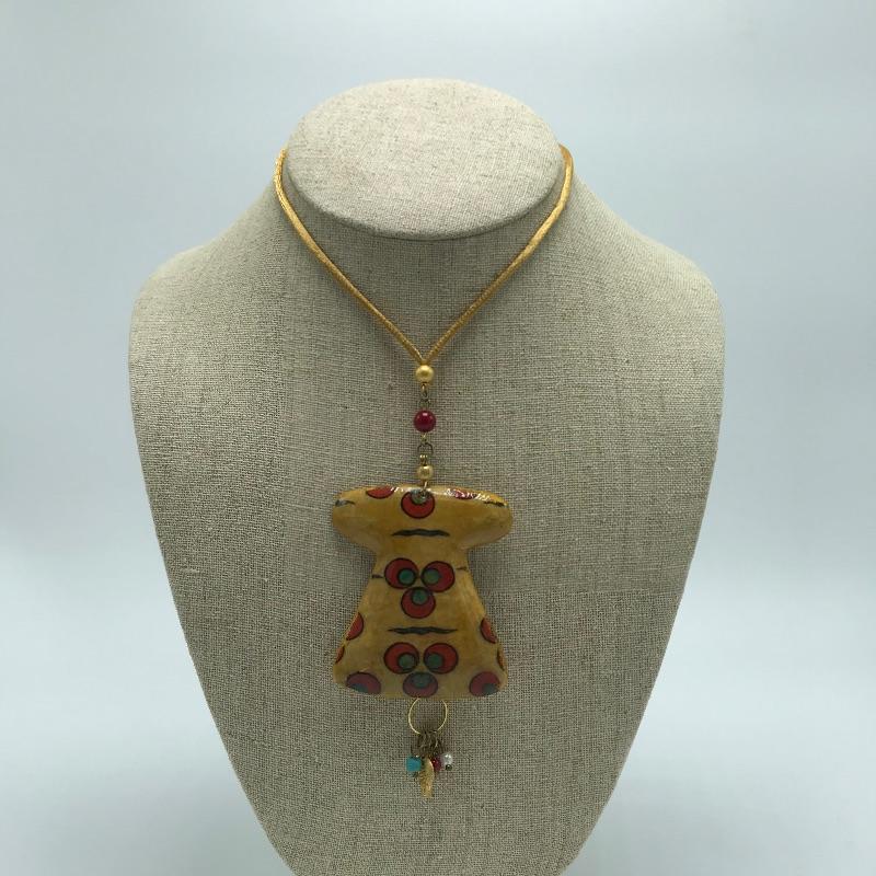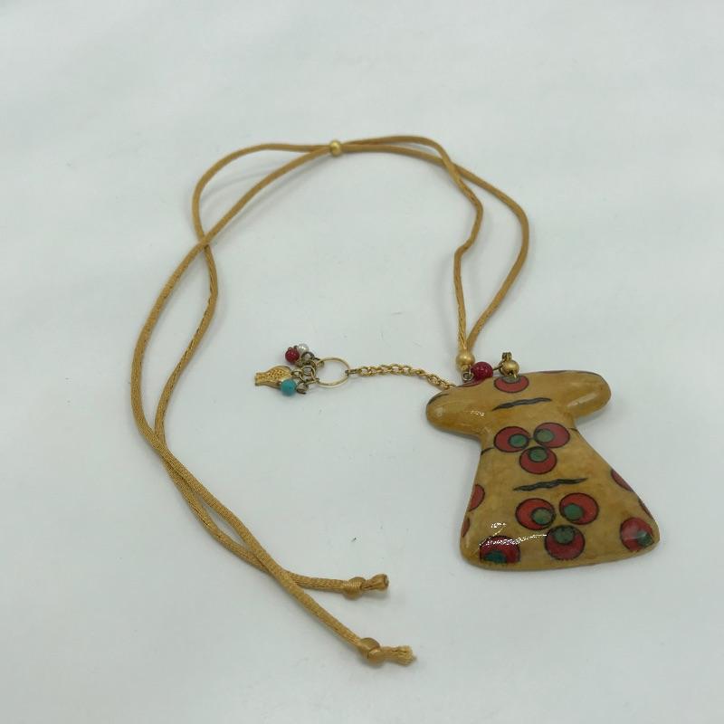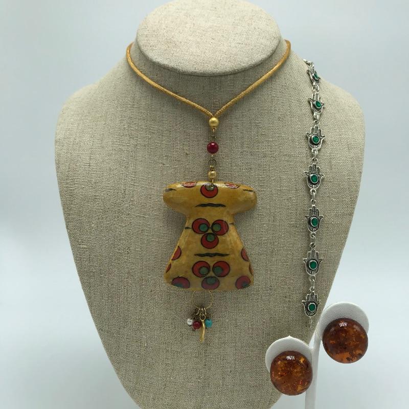 Fun and funky bohemian lot featuring earrings, bracelet and necklace. The unique necklace has an adjustable silk-like cord and a dress charm that has a decoupage or high gloss pottery finish and separate bead pendant attached. The clip earrings appear to be amber with changing depth dependent on light. Lastly a Hamsa Hand charm bracelet with bright green jewel centers. See photos.