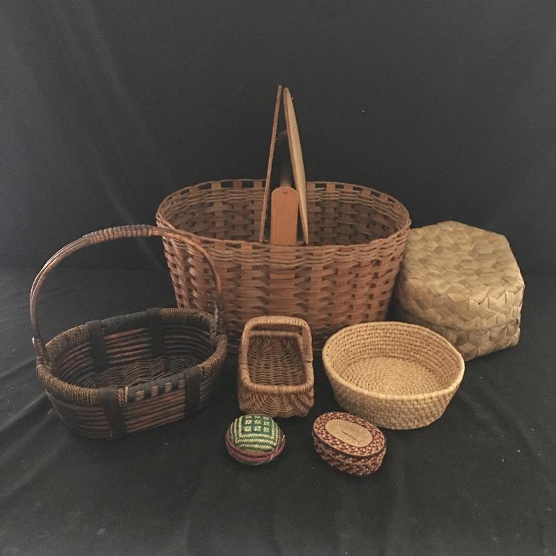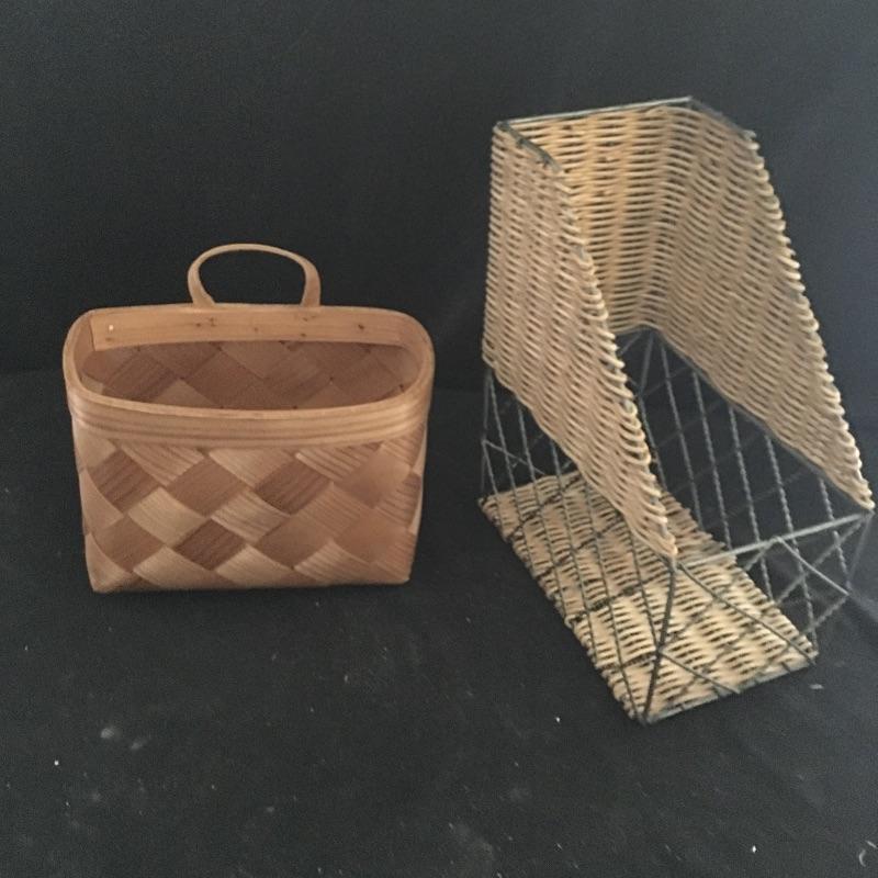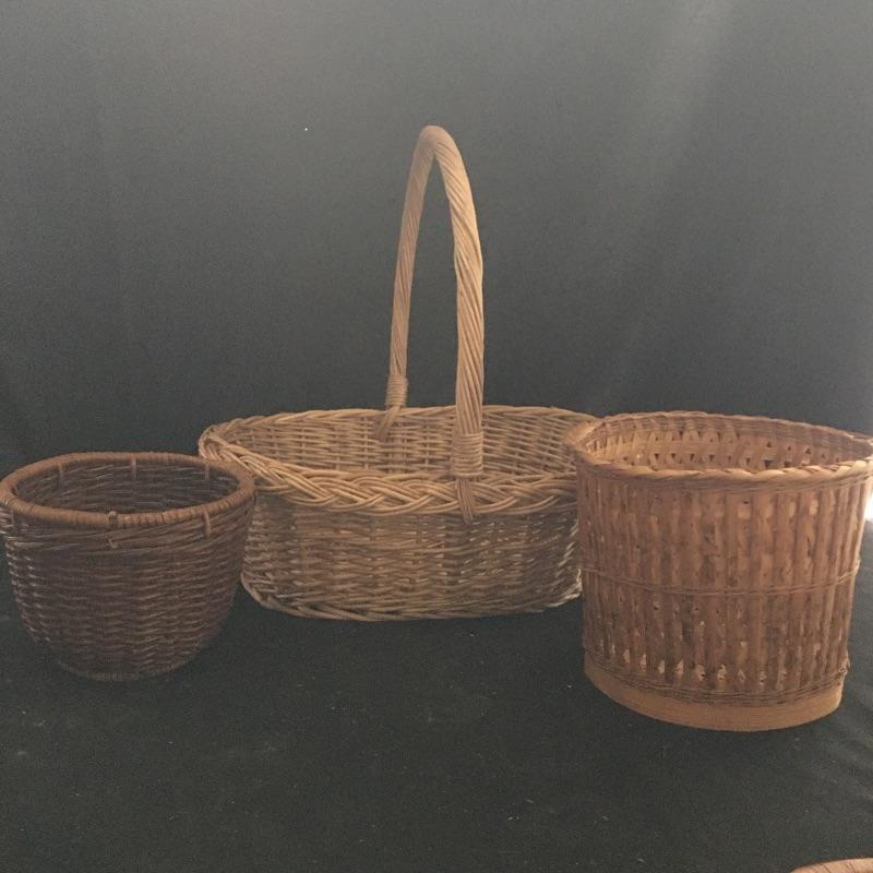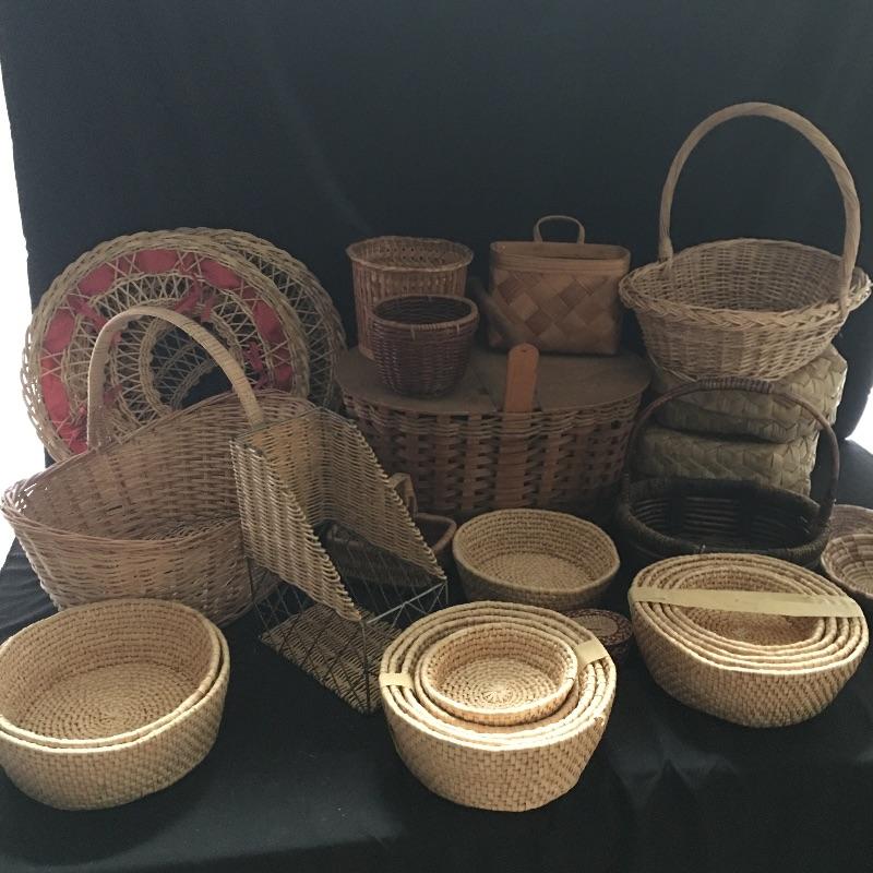 Bundles of baskets. Lot includes picnic basket, file holder, hanging basket, nesting baskets, baskets with handles and more. You will find plenty of uses for these well made baskets. Picnic basket measures 13.5” x 20” x 13.5”.