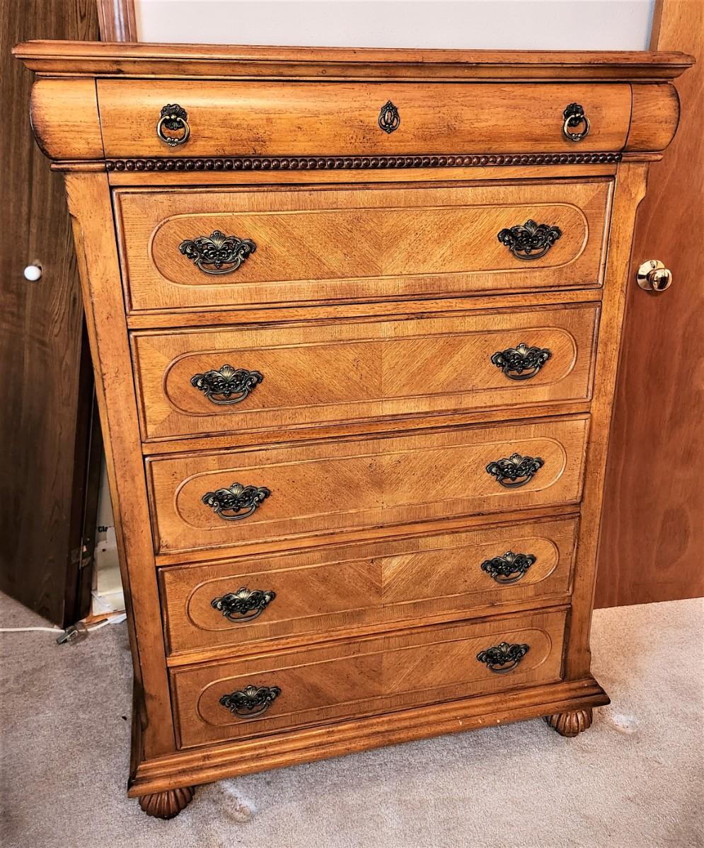 Nice looking contemporary chest of drawers,6 drawers, oak finish. No maker noted. 38" across, 18" deep, 54" tall. Has some boo-boos on the top - not major. Finish worn off in two dime-size spots on top. Overall good used condition.