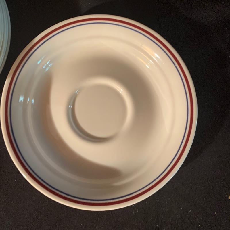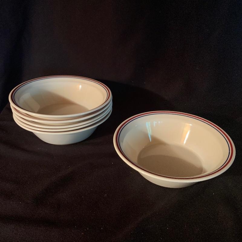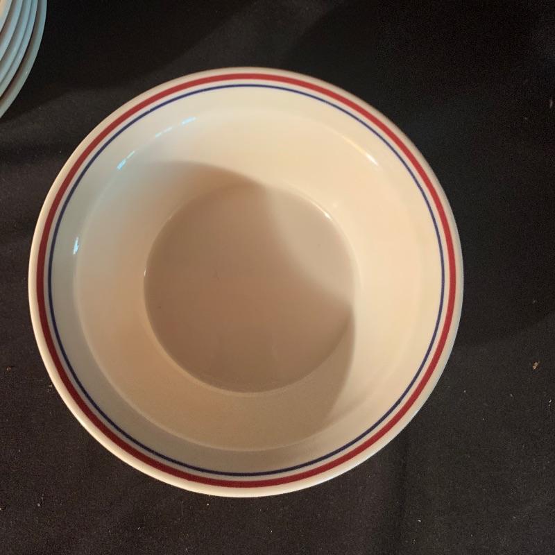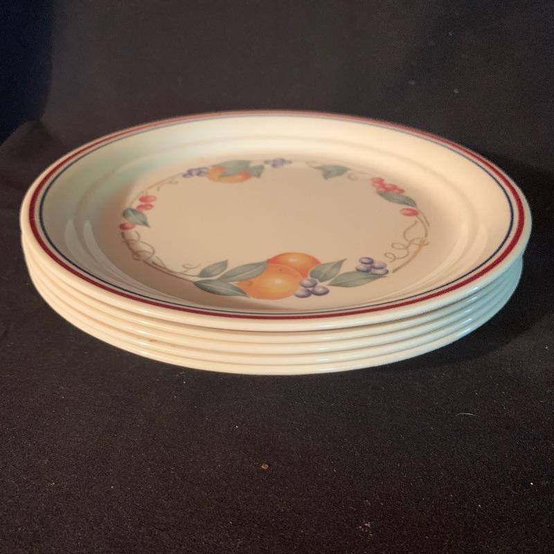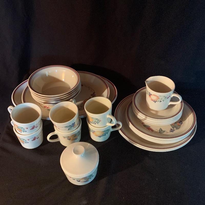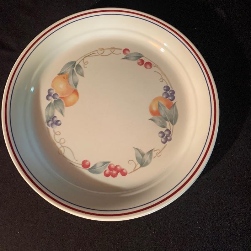This beautiful set of Corning and other dishes go well together and have similar patterns. This lot comes with two serving platters, six salad bowls, a sugar bowl, six teacups, a small creamer pitcher, seven dessert plates, and eight dinner plates. The plates have gorgeous fruit designs on them and are accented with red and blue lines. All dishes are Corning except for the largest platter, which is English (15” x 10”), and has the same red stripe trim as all the others. Local pickup only.