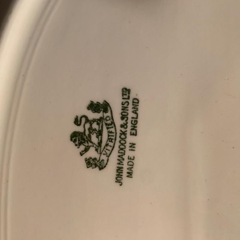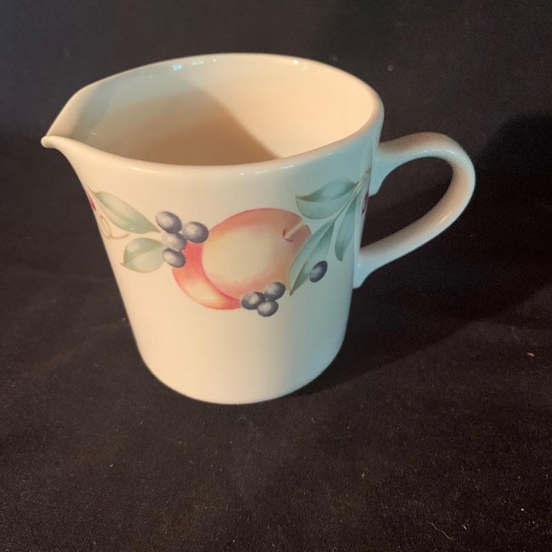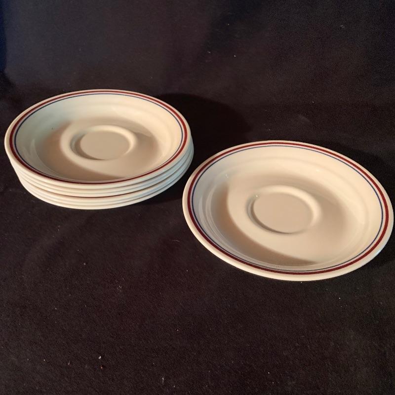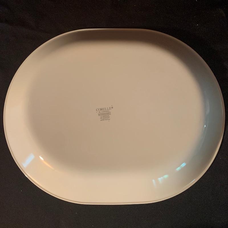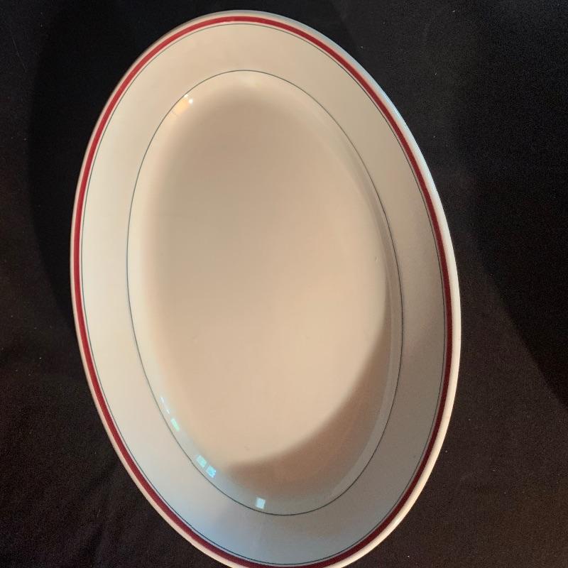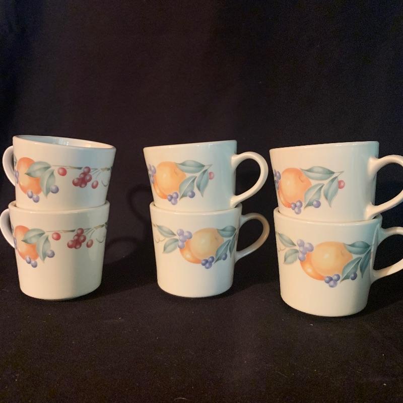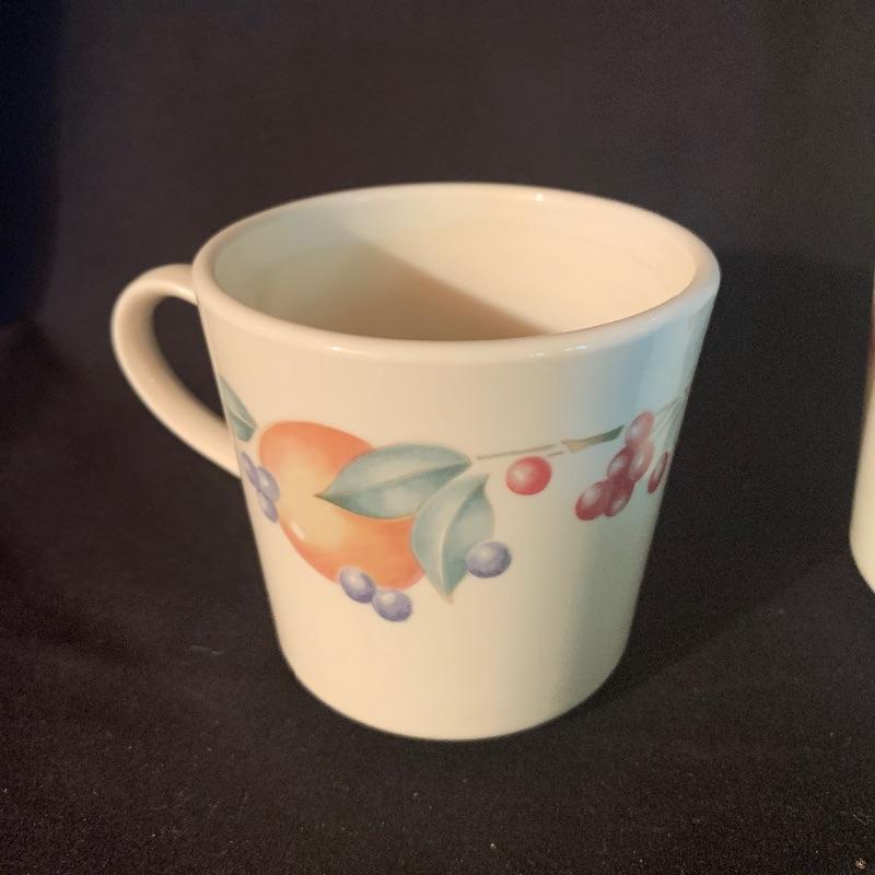 This beautiful set of Corning and other dishes go well together and have similar patterns. This lot comes with two serving platters, six salad bowls, a sugar bowl, six teacups, a small creamer pitcher, seven dessert plates, and eight dinner plates. The plates have gorgeous fruit designs on them and are accented with red and blue lines. All dishes are Corning except for the largest platter, which is English (15” x 10”), and has the same red stripe trim as all the others. Local pickup only.
