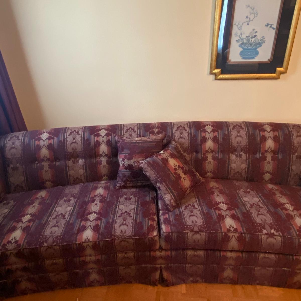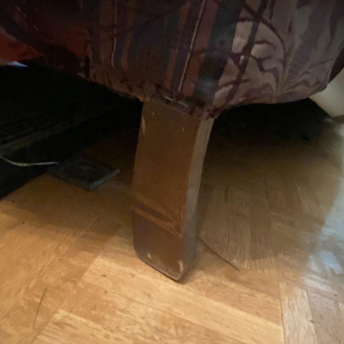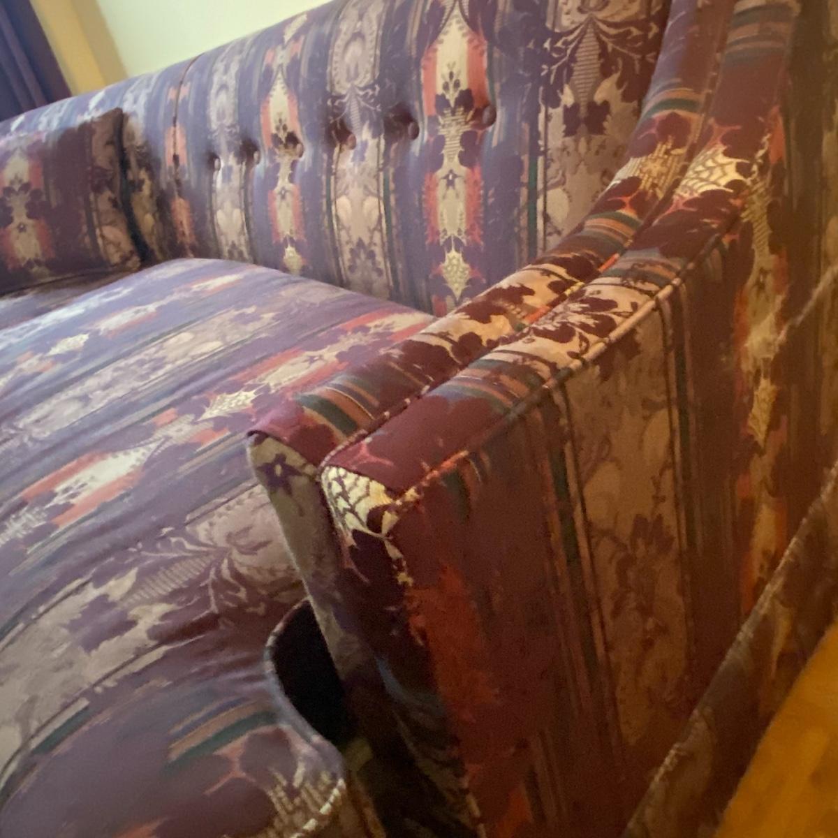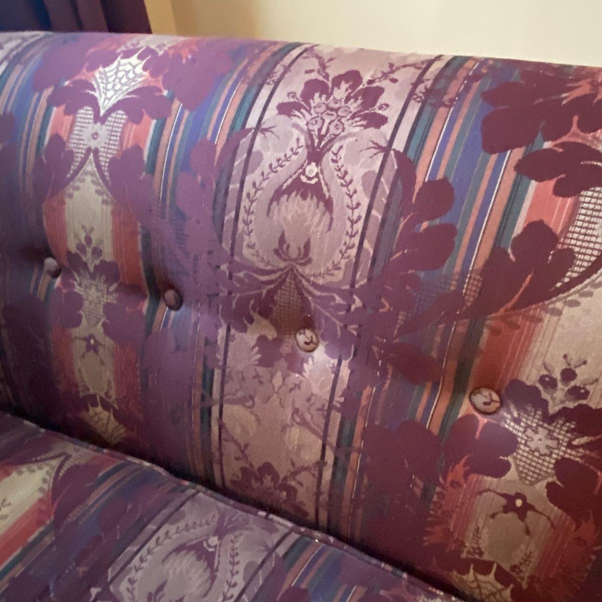 Enjoy this sturdy purple and floral inspired couch! No manufacturing label and appears to be reupholstered, see photos. Couch measurements are 96”x21”x16”. Back of couch stands 28” tall. Couch was in a home with multiple dogs and has signs of age, such as the side of the couch has collected a dust line, that can be wiped off. With some fabric cleaner and care this piece will come back to life. Wooden legs have scuffs and showing signs of age as well. See photos. Local pickup only.