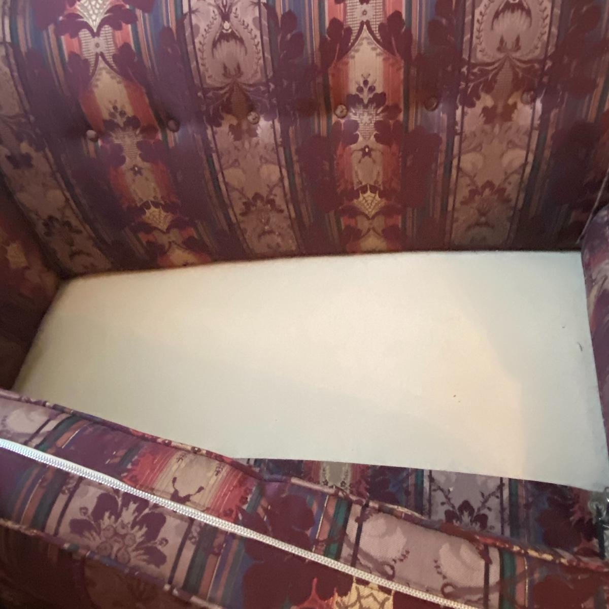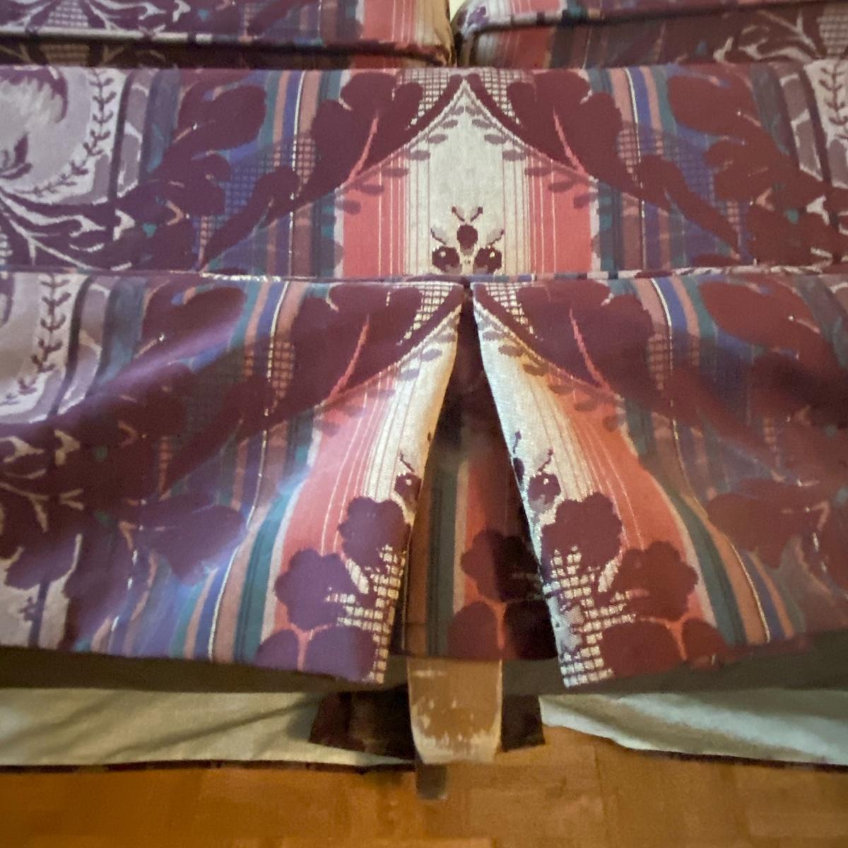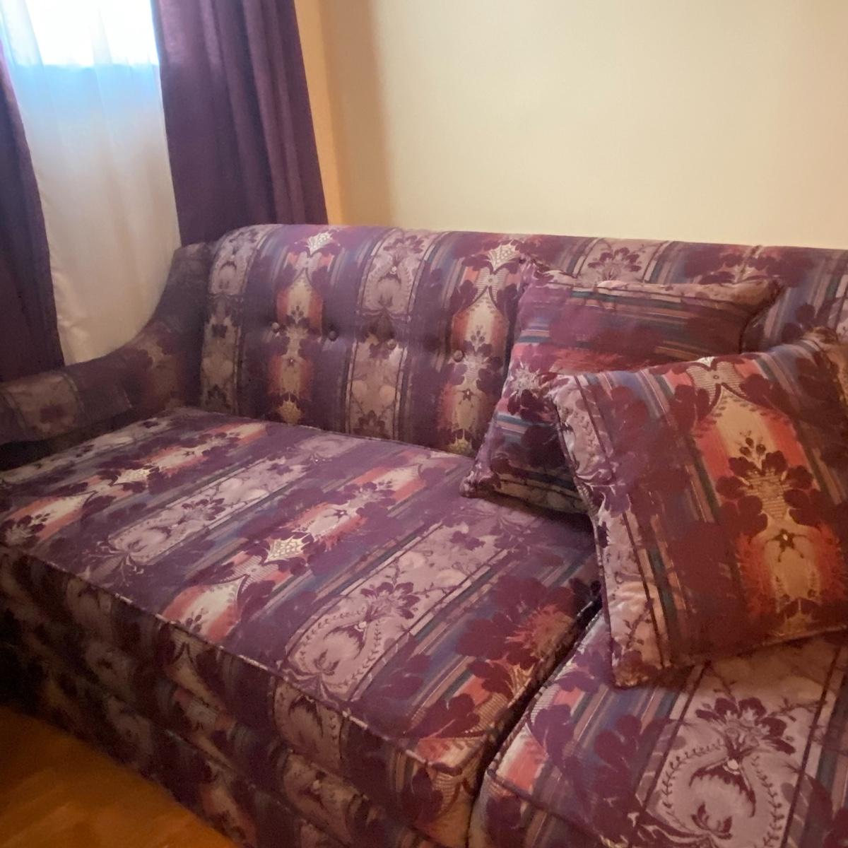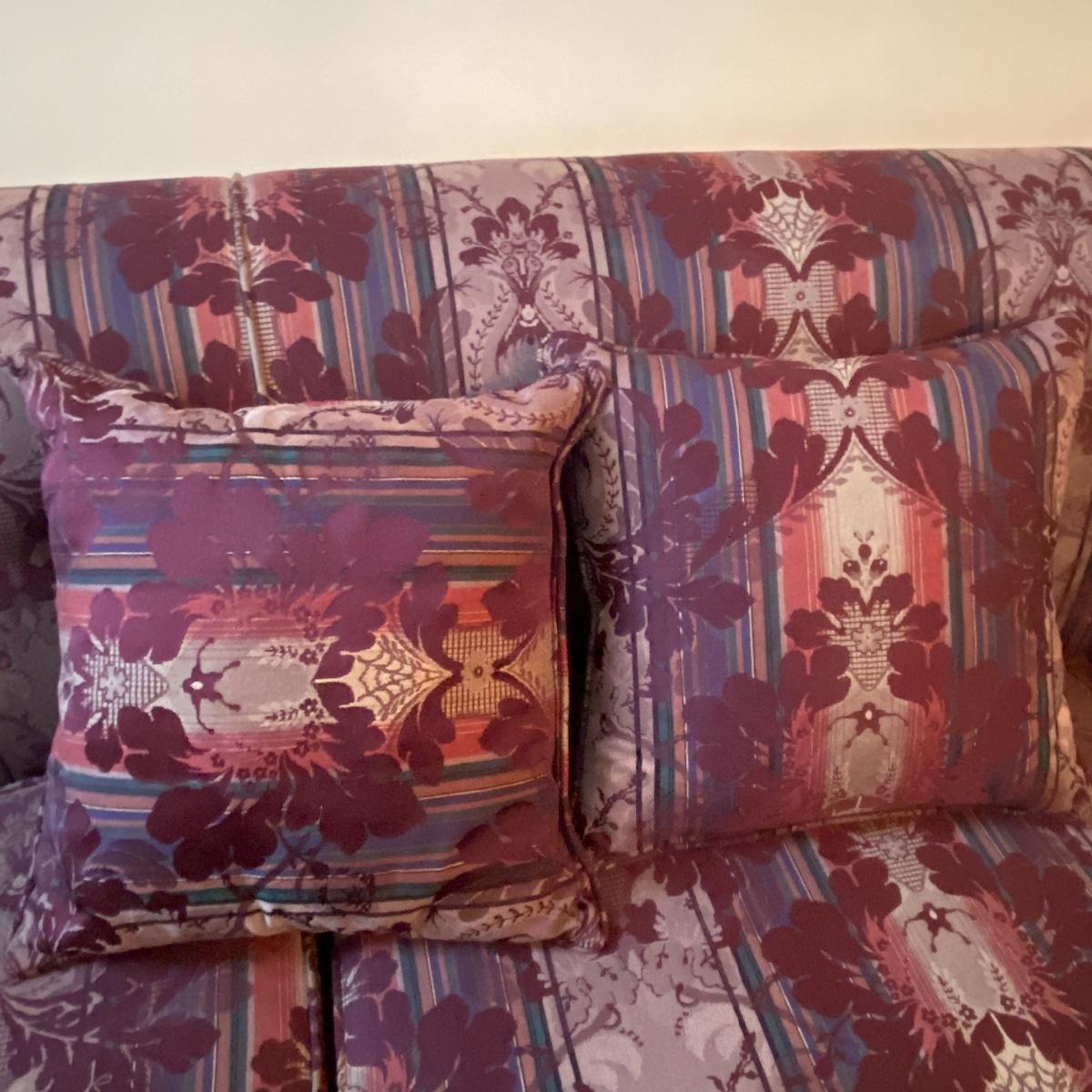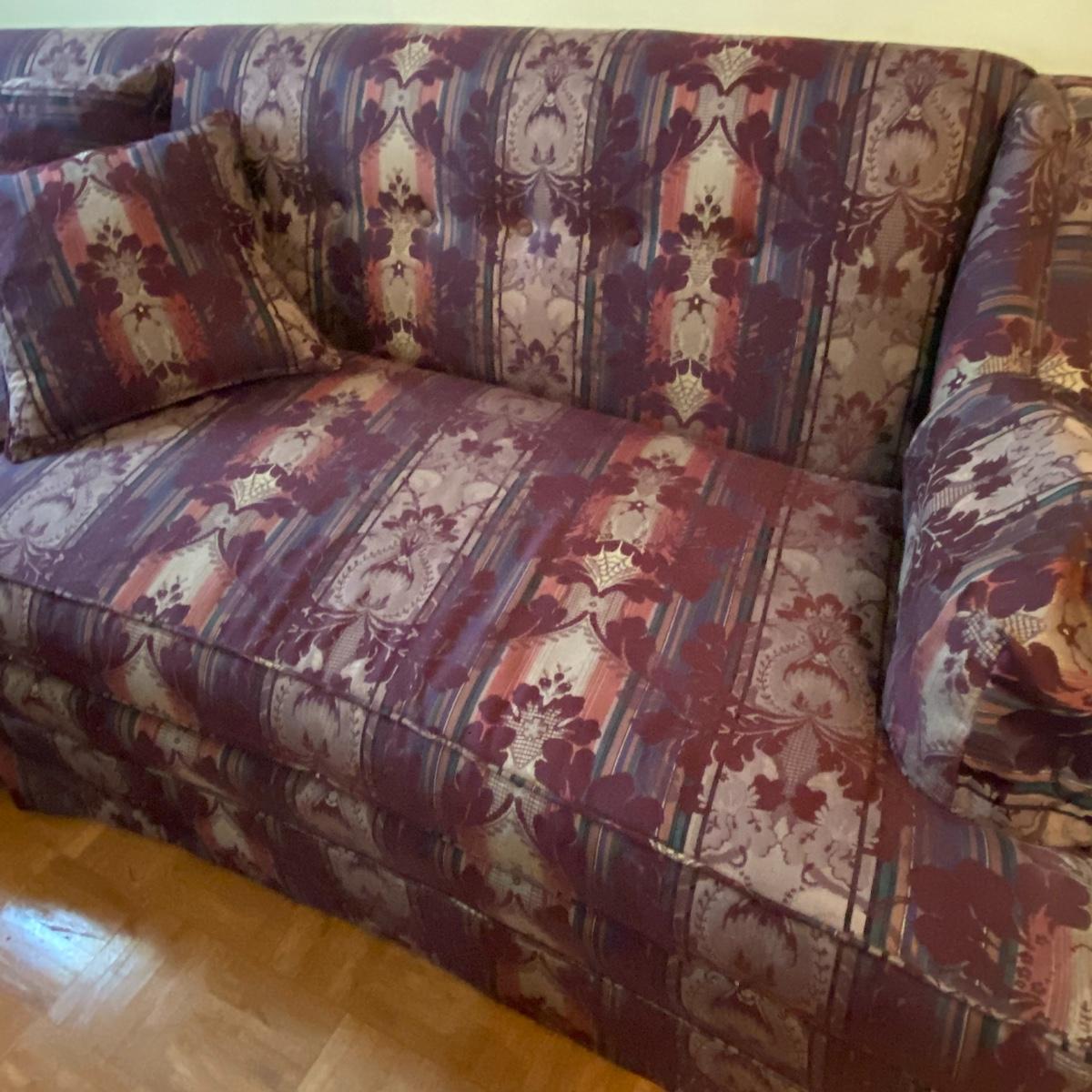 Enjoy this sturdy purple and floral inspired couch! No manufacturing label and appears to be reupholstered, see photos. Couch measurements are 96”x21”x16”. Back of couch stands 28” tall. Couch was in a home with multiple dogs and has signs of age, such as the side of the couch has collected a dust line, that can be wiped off. With some fabric cleaner and care this piece will come back to life. Wooden legs have scuffs and showing signs of age as well. See photos. Local pickup only.