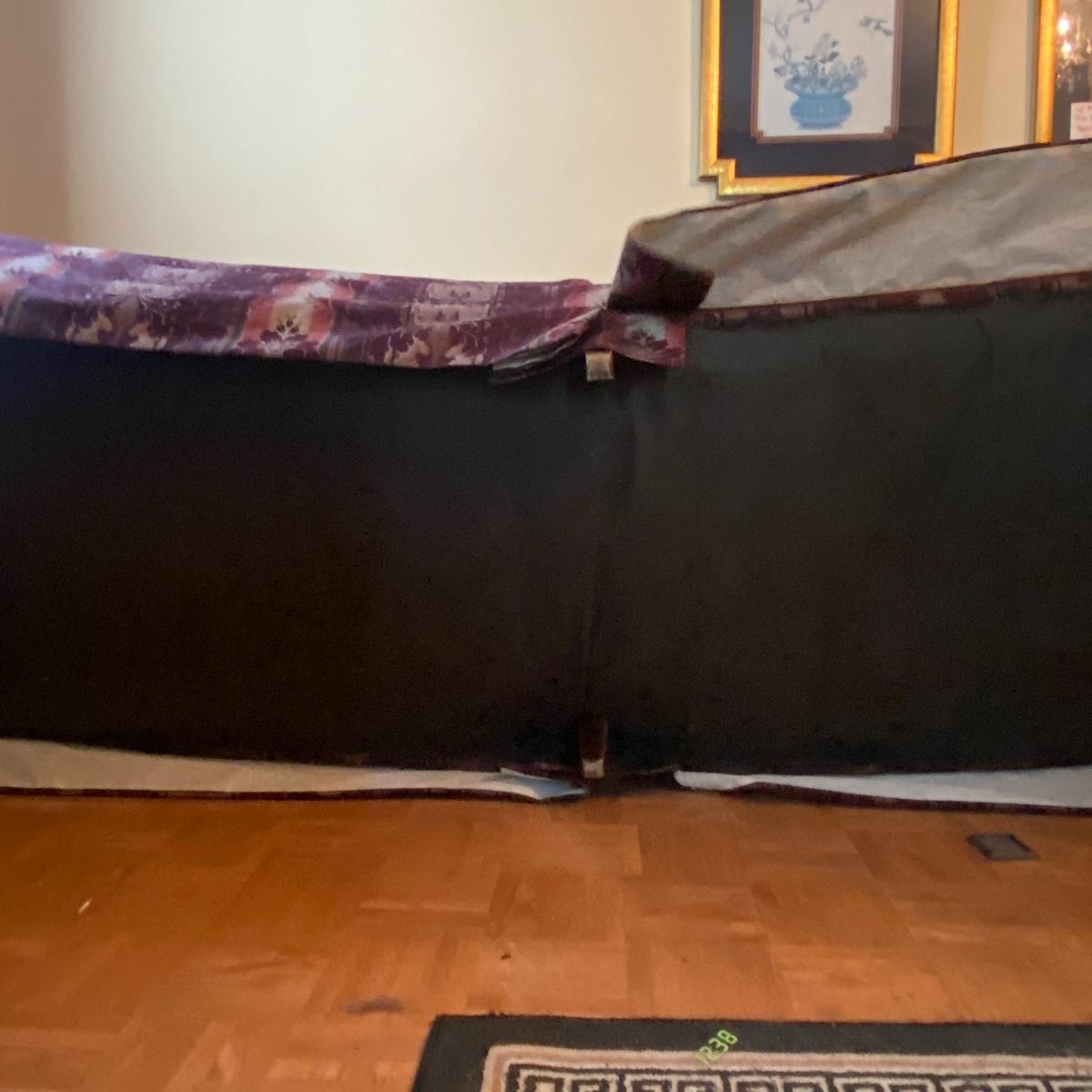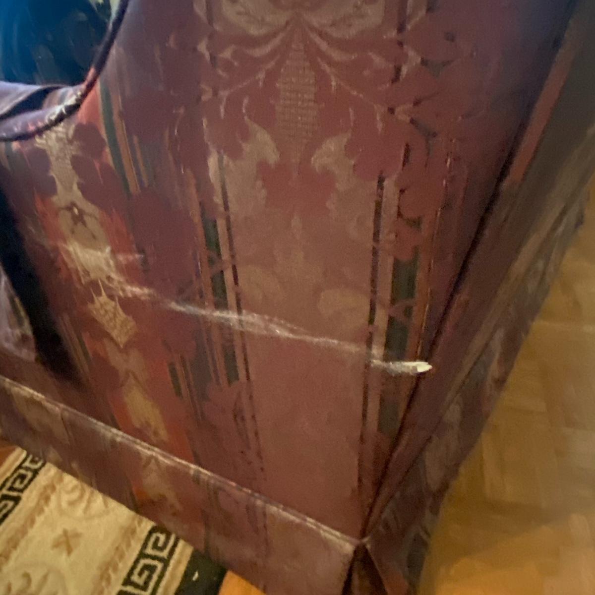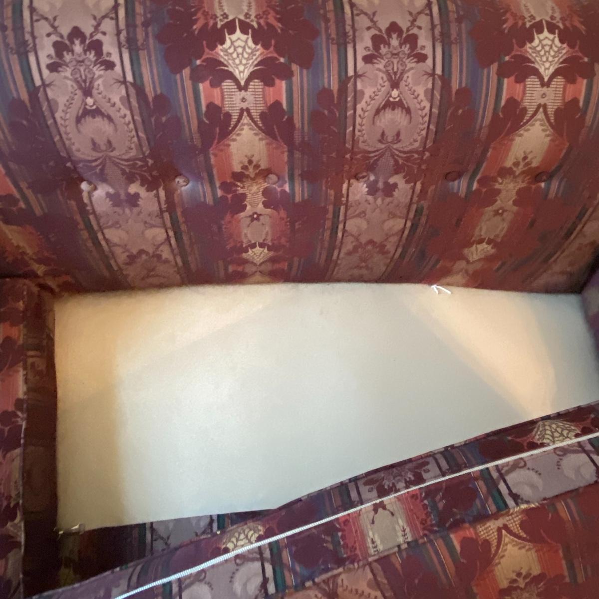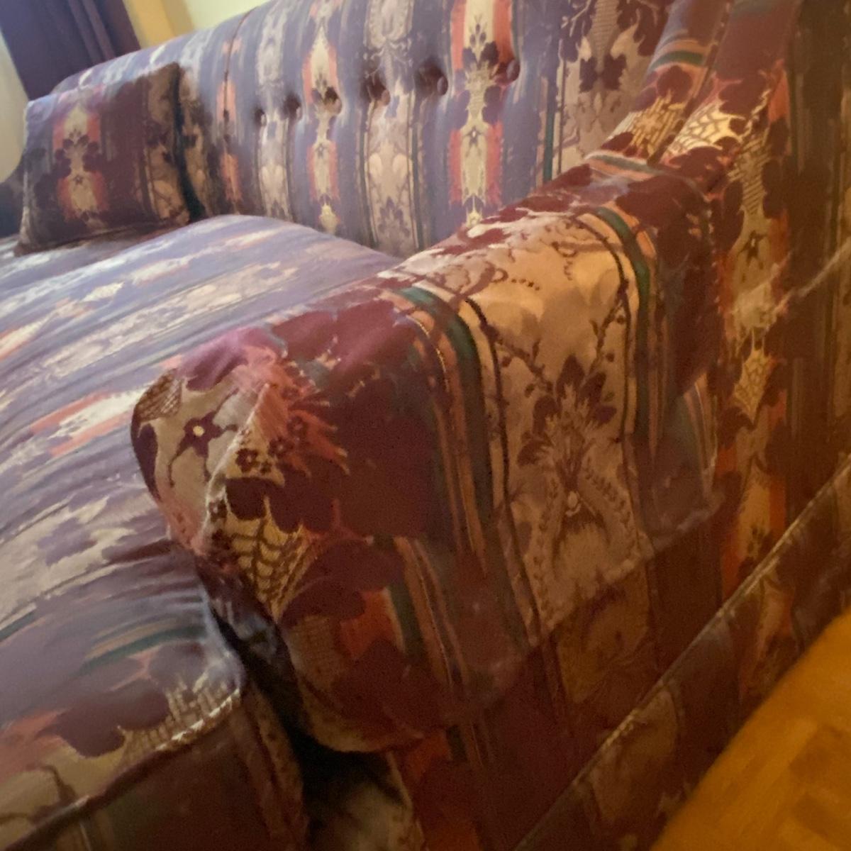 Enjoy this sturdy purple and floral inspired couch! No manufacturing label and appears to be reupholstered, see photos. Couch measurements are 96”x21”x16”. Back of couch stands 28” tall. Couch was in a home with multiple dogs and has signs of age, such as the side of the couch has collected a dust line, that can be wiped off. With some fabric cleaner and care this piece will come back to life. Wooden legs have scuffs and showing signs of age as well. See photos. Local pickup only.