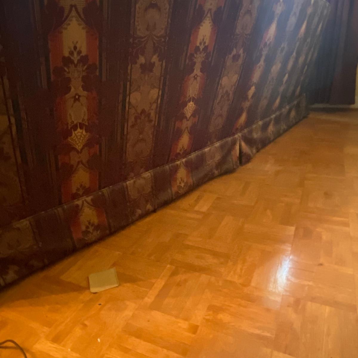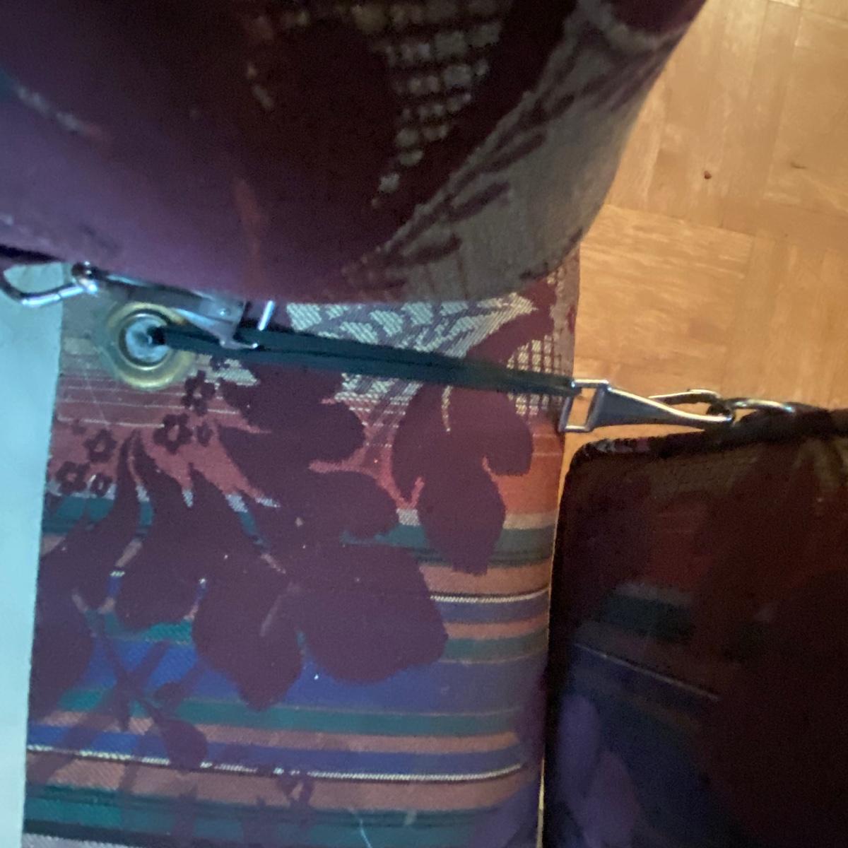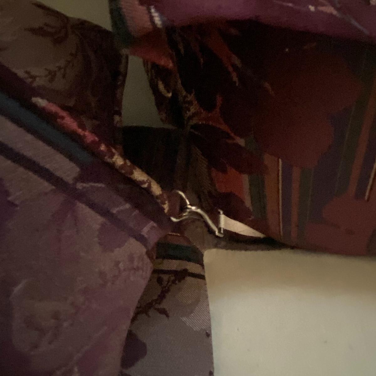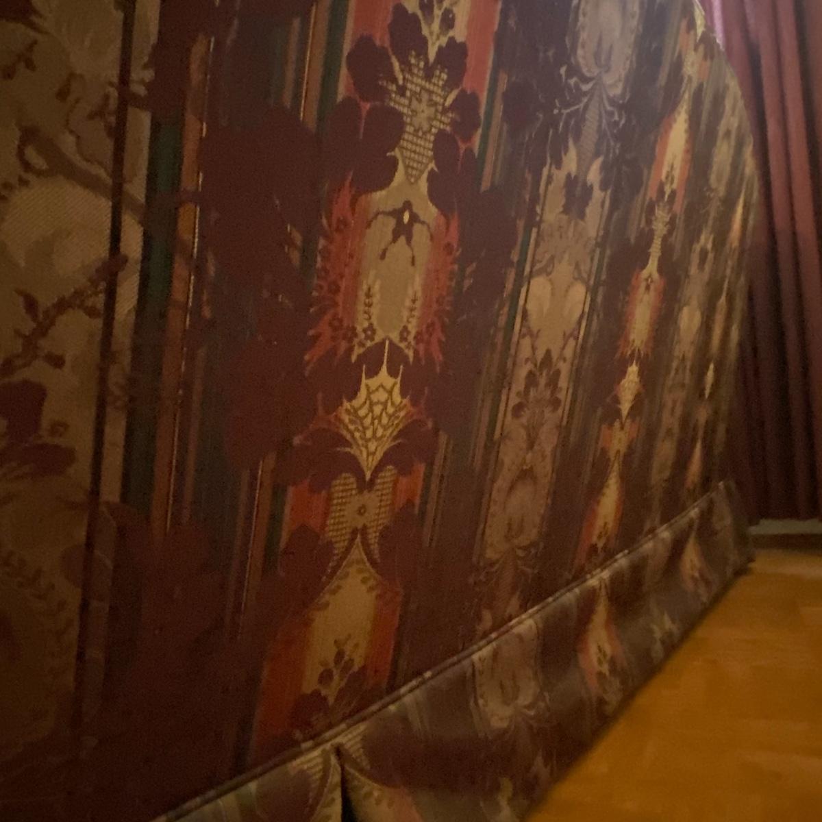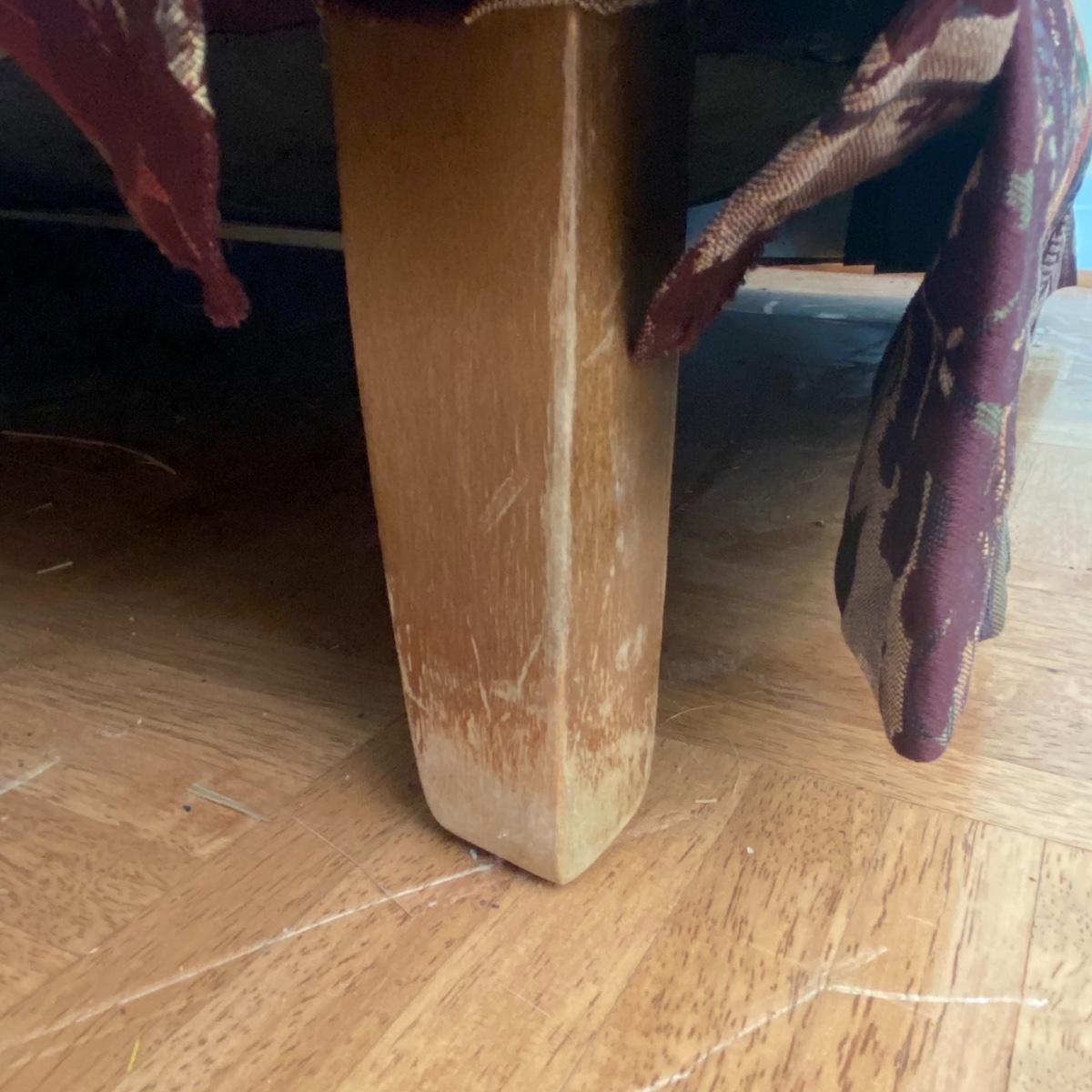 Enjoy this sturdy purple and floral inspired couch! No manufacturing label and appears to be reupholstered, see photos. Couch measurements are 96”x21”x16”. Back of couch stands 28” tall. Couch was in a home with multiple dogs and has signs of age, such as the side of the couch has collected a dust line, that can be wiped off. With some fabric cleaner and care this piece will come back to life. Wooden legs have scuffs and showing signs of age as well. See photos. Local pickup only.