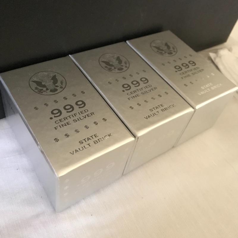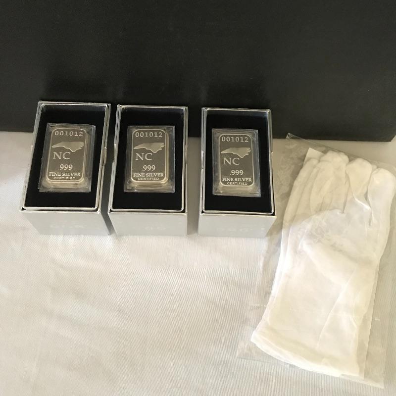 Three boxes of six each North Carolina .999 silver bar vault bricks. White handling gloves included, appear unused in original packaging.