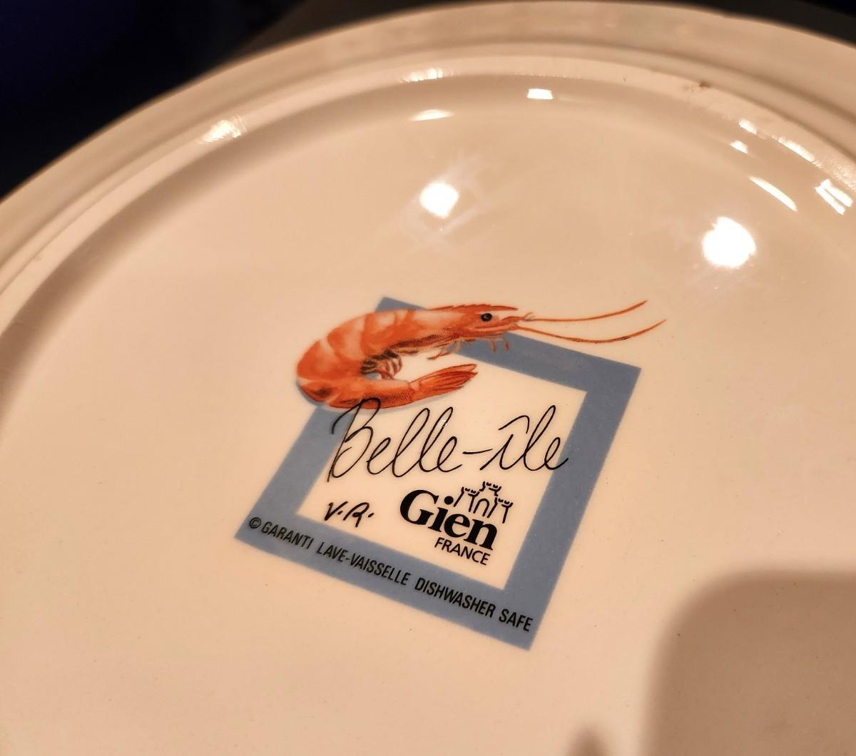 By Gien France, Belle Ille Dinner Plate with seafood motif - retired pattern. Replacements cost is $139.95 EACH. 11.25" across. Would look great displayed in your New Orleans kitchen. We only found the 1 plate. Good condition.