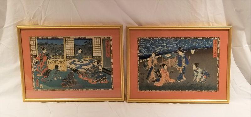 Check out this wonderful PAIR of Toyokumi (1786-1864) Chinese woodblocks. Color and condition is great - contemporary, professional framing on these two. They each measure 17.5 inches wide and 13 1/2 inches tall. Price is for the pair.