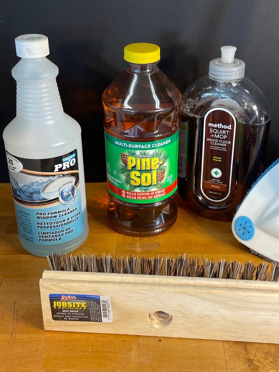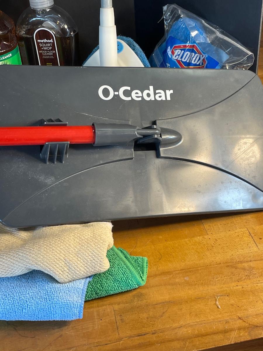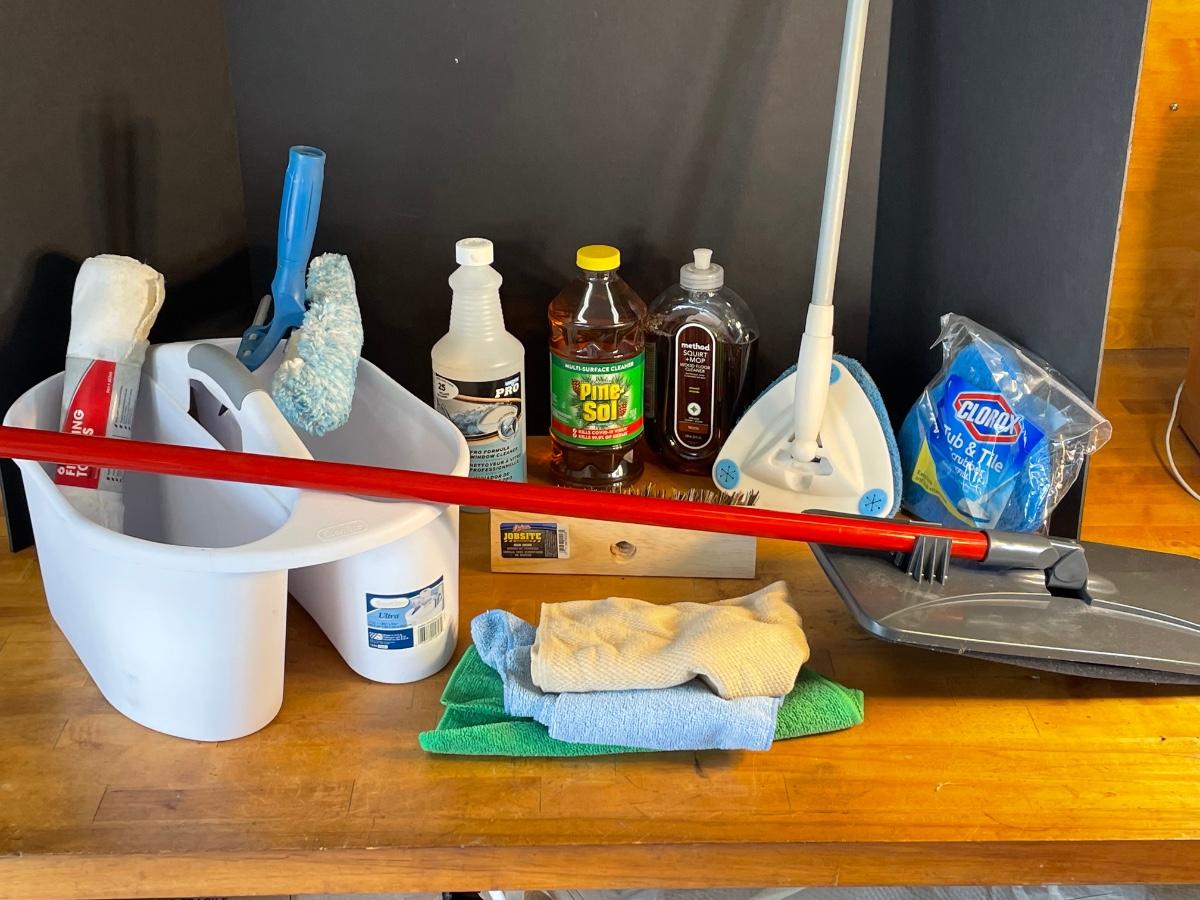 Assorted mops, cleaning products, a caddy, microfiber cloths, squeegee