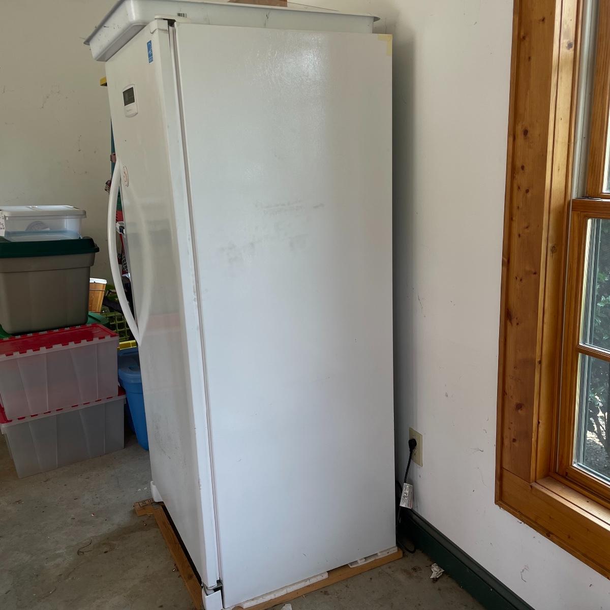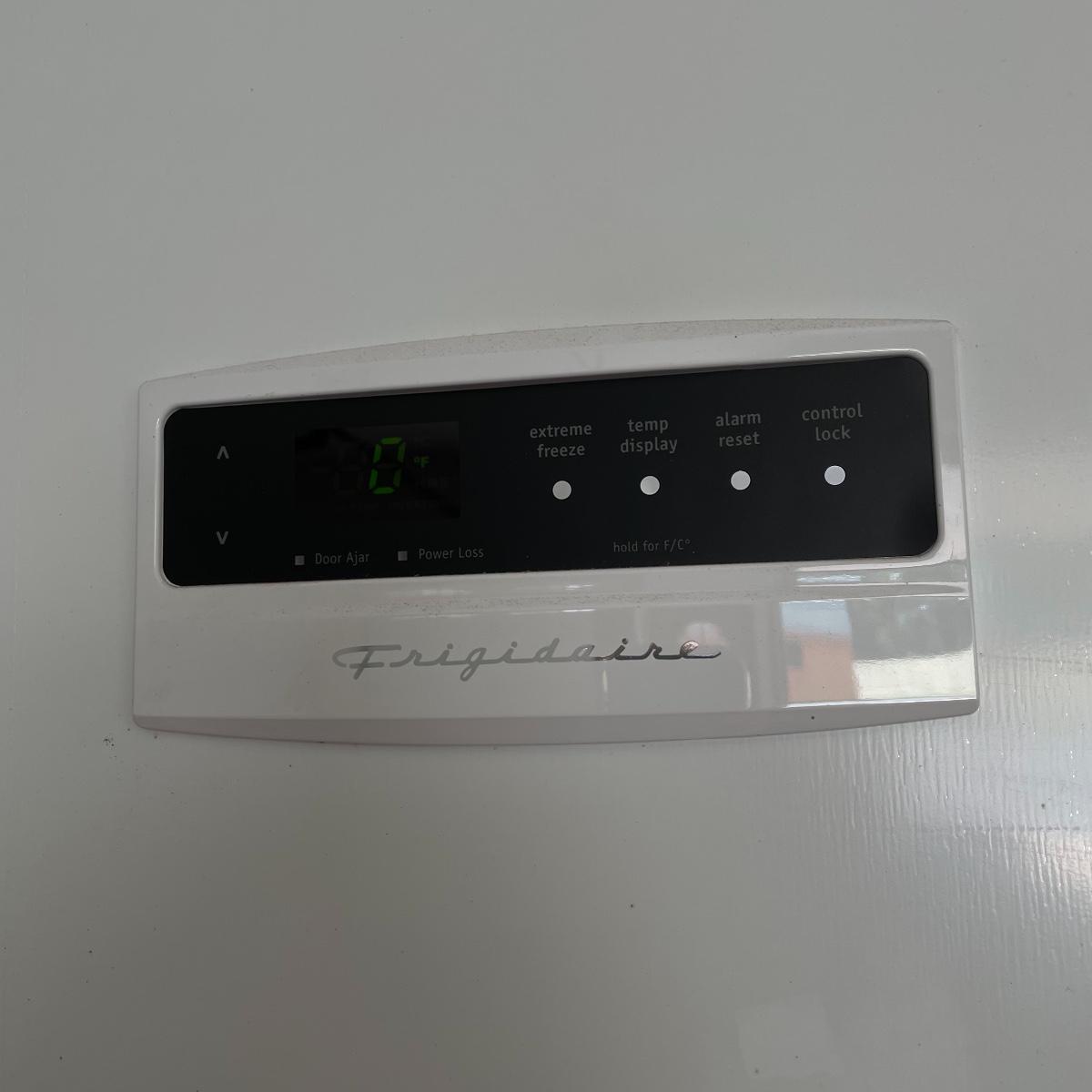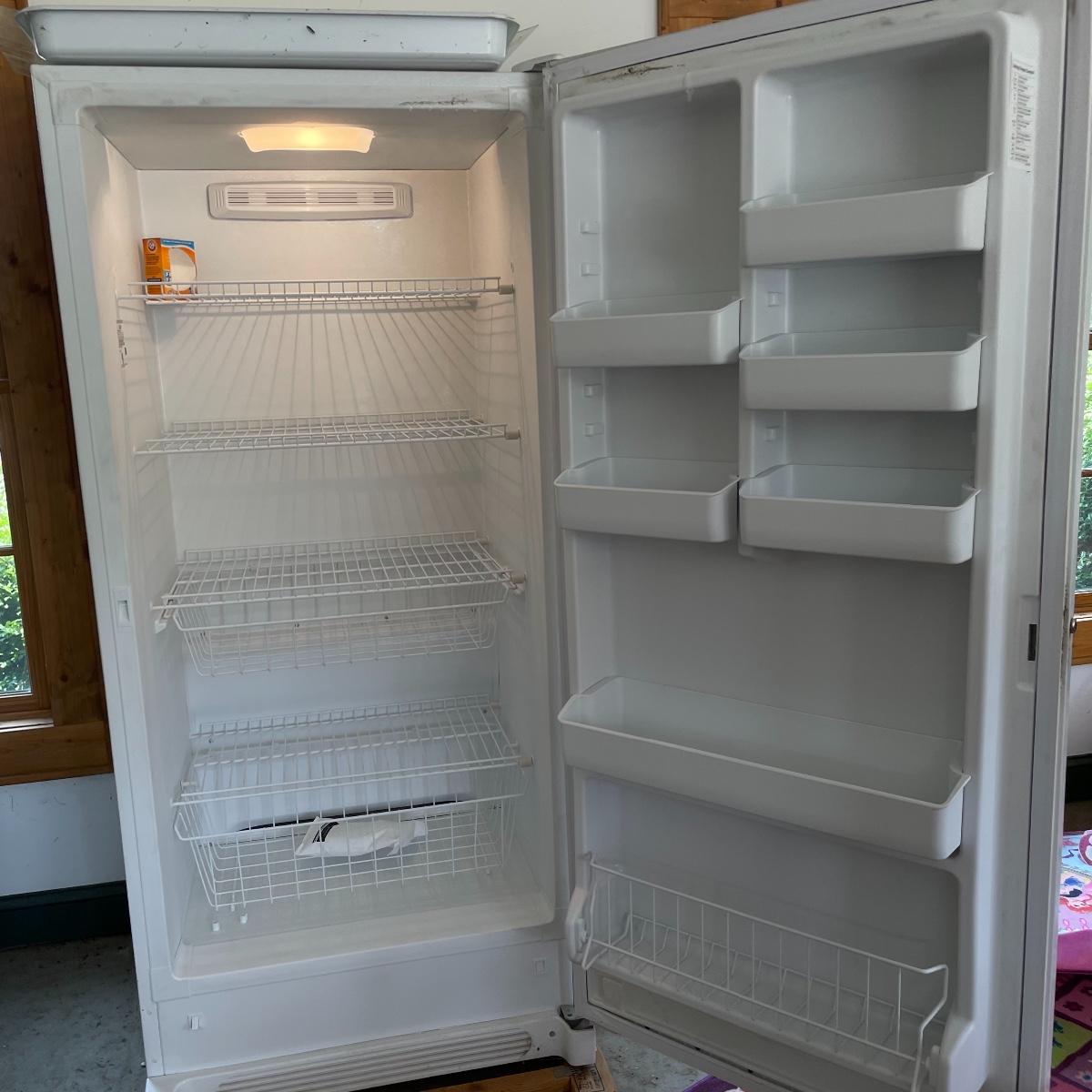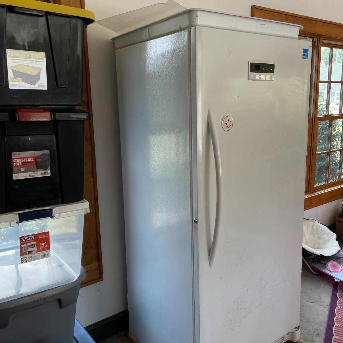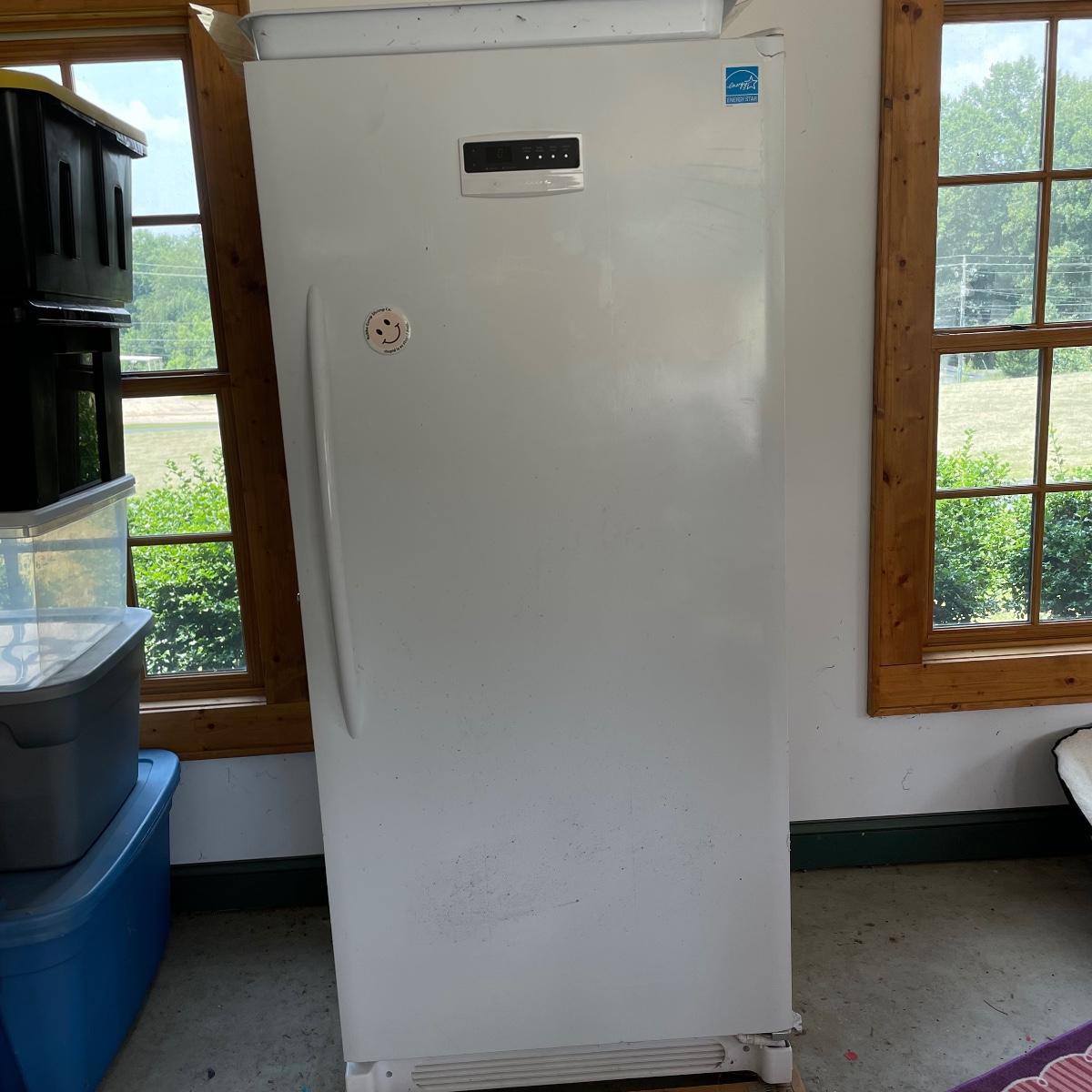 Keep your food good and frozen with this big, clean, upright Frigidaire freezer. It appears to be attached to a wooden frame riser to keep it off of the ground and has a drip tray stored on top. This appliance measures approximately 32” x 28.25” x 72” while on its wooden riser. This freezer also has a handy warning if the door is ajar and an electric display to ensure it’s working properly. The freezer is currently plugged in and working well, the display is at 0°F. See images for model number and other specs. Bubba Gump magnet is included. Local pick up only.