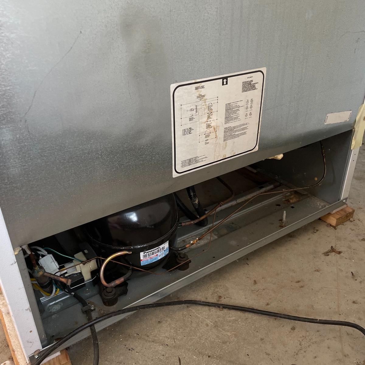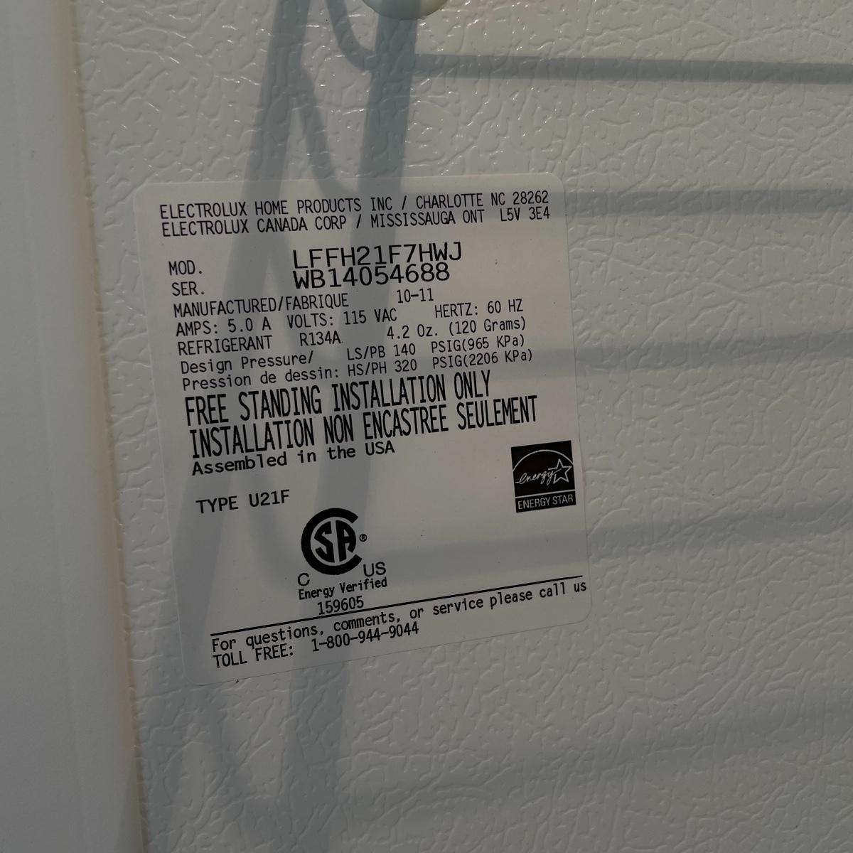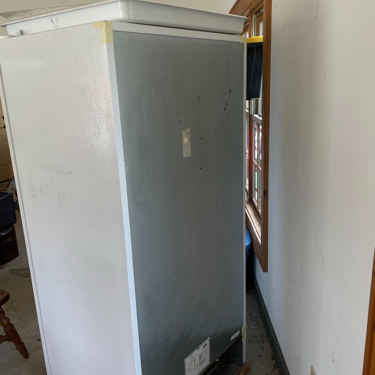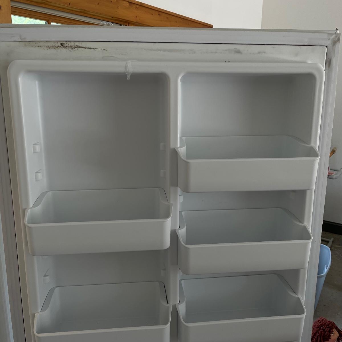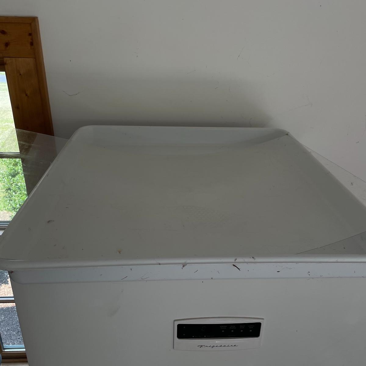 Keep your food good and frozen with this big, clean, upright Frigidaire freezer. It appears to be attached to a wooden frame riser to keep it off of the ground and has a drip tray stored on top. This appliance measures approximately 32” x 28.25” x 72” while on its wooden riser. This freezer also has a handy warning if the door is ajar and an electric display to ensure it’s working properly. The freezer is currently plugged in and working well, the display is at 0°F. See images for model number and other specs. Bubba Gump magnet is included. Local pick up only.