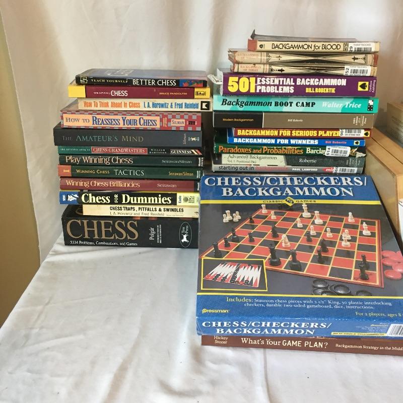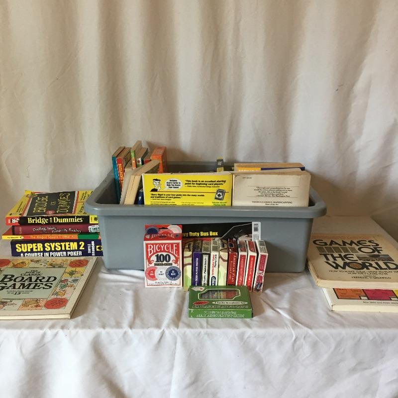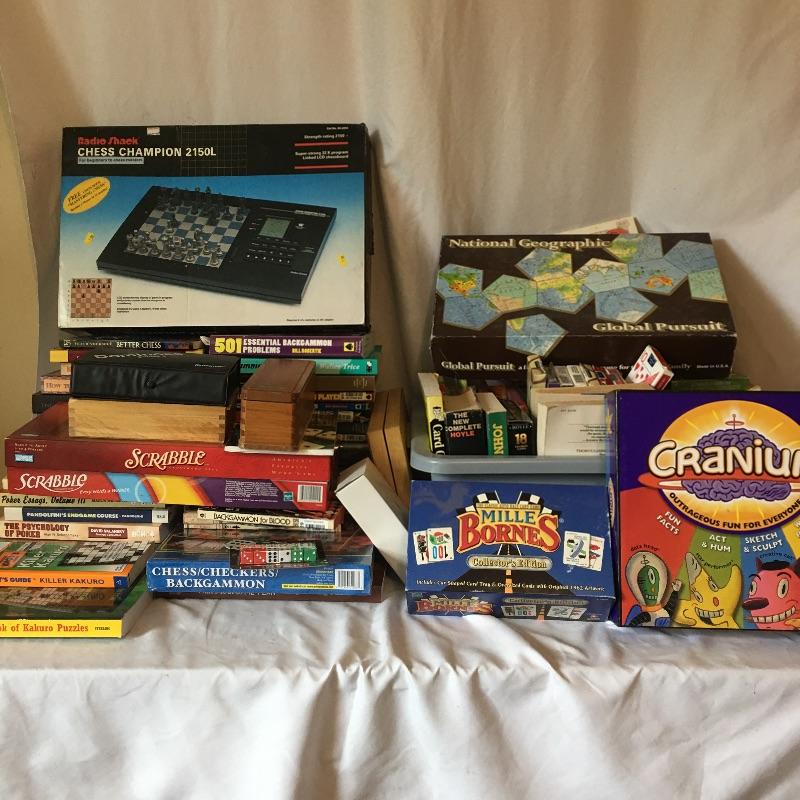 Games and more. Lot includes Scrabble, Cranium, Backgammon, dominos, cards, and a plethora of how to books on games. Get the family together and have a great time with these thinking games.