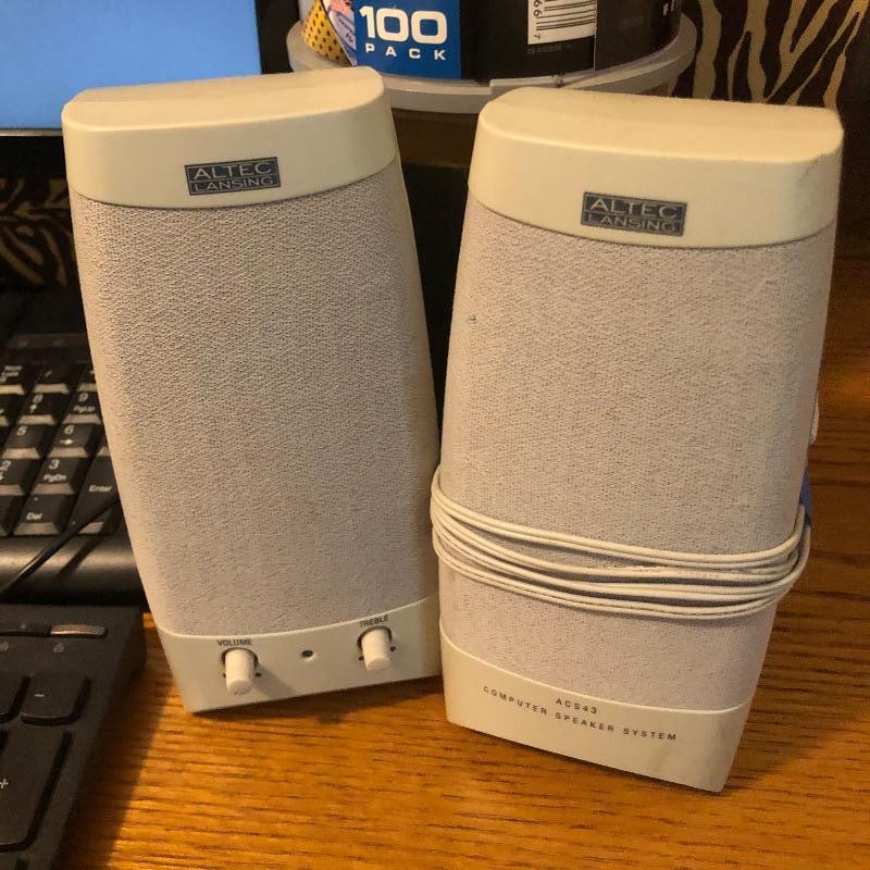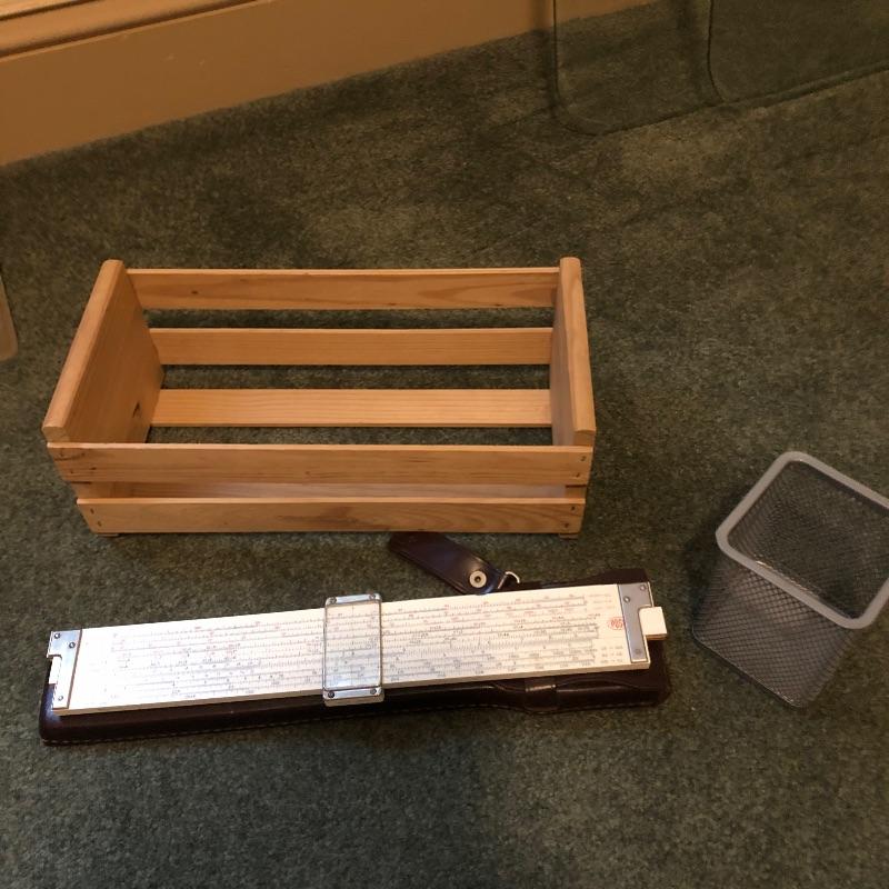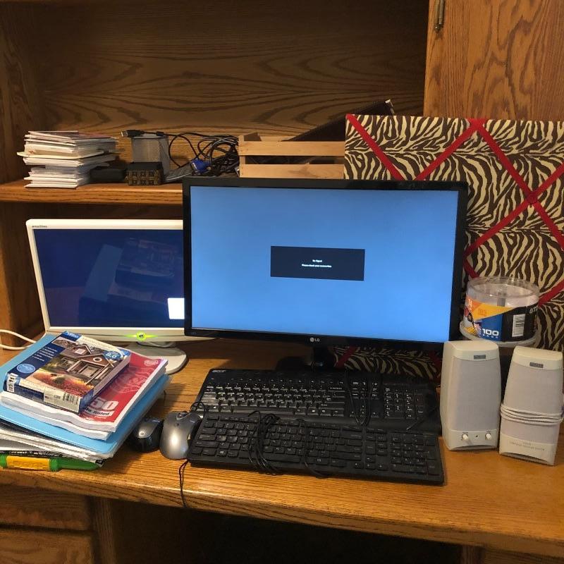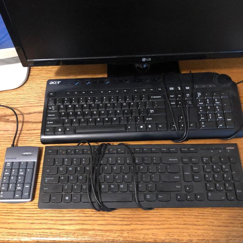 This assortment of home office essentials includes 2 monitors; the larger of the two is the LG and the other is an emachines, last 2 images show serial information etc and both powered on. There are 2 full keyboards and a number only keyboard as well as a pair of speakers, pin board, Home Designer software, vintage slide ruler and more here in this large lot.