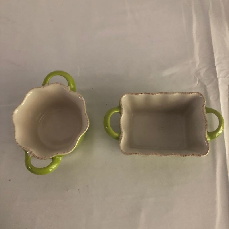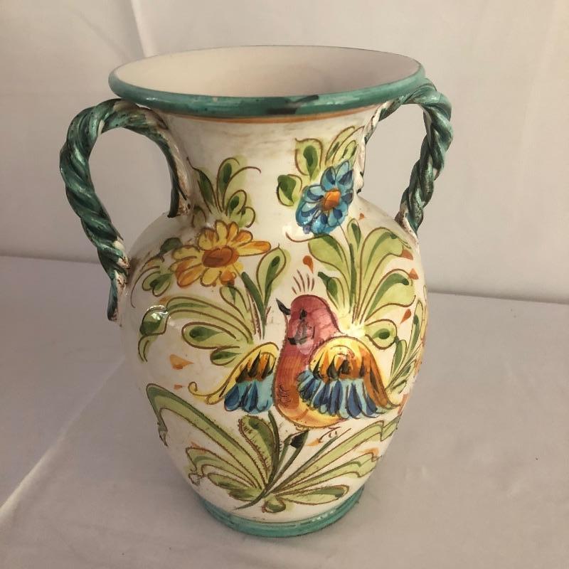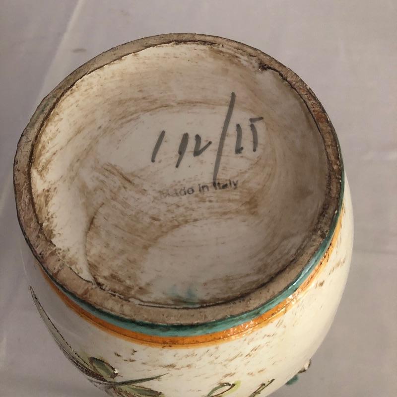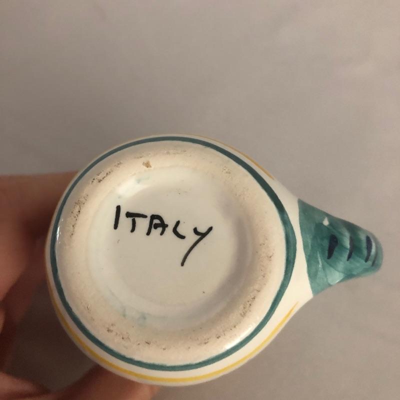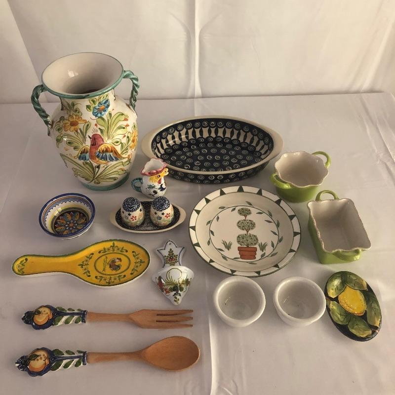 Italian dishware. Included is a large vase, serving dish, two small green dishes, two small white bowls, salt and pepper shakers with a matching dish, and so much more! The incredible detailing on these pieces would add lots of character to any kitchen.