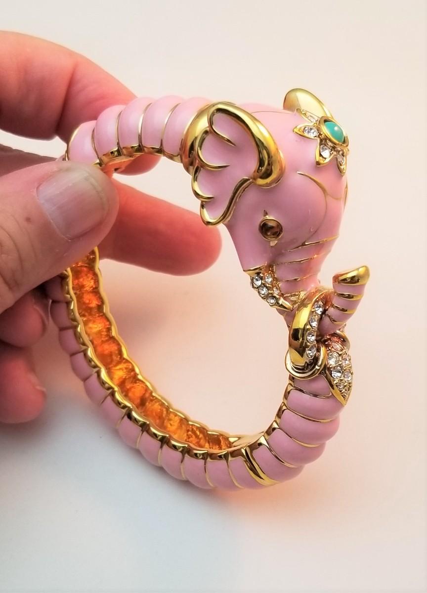 Whimsical Kenneth Jay Lane Pink Elephant bangle bracelet - hinged - magnetic closure - good condition. Will fit up to an 8" wrist.
