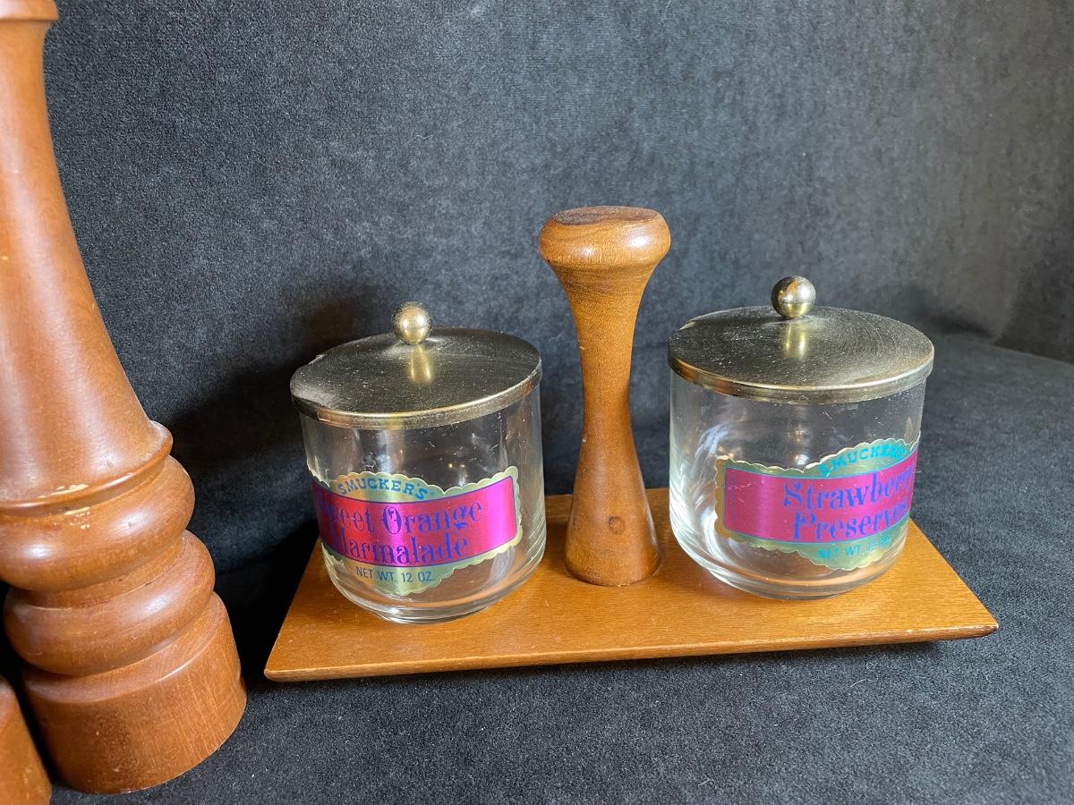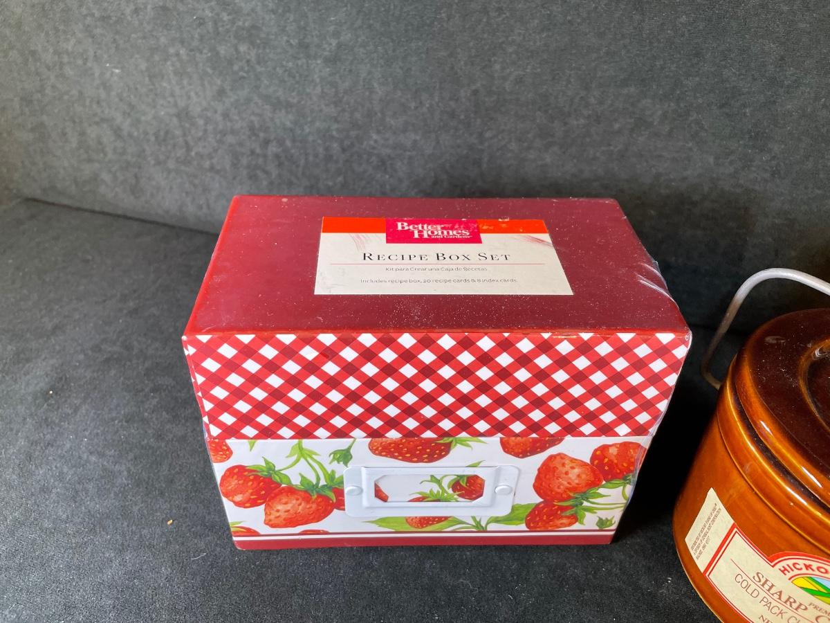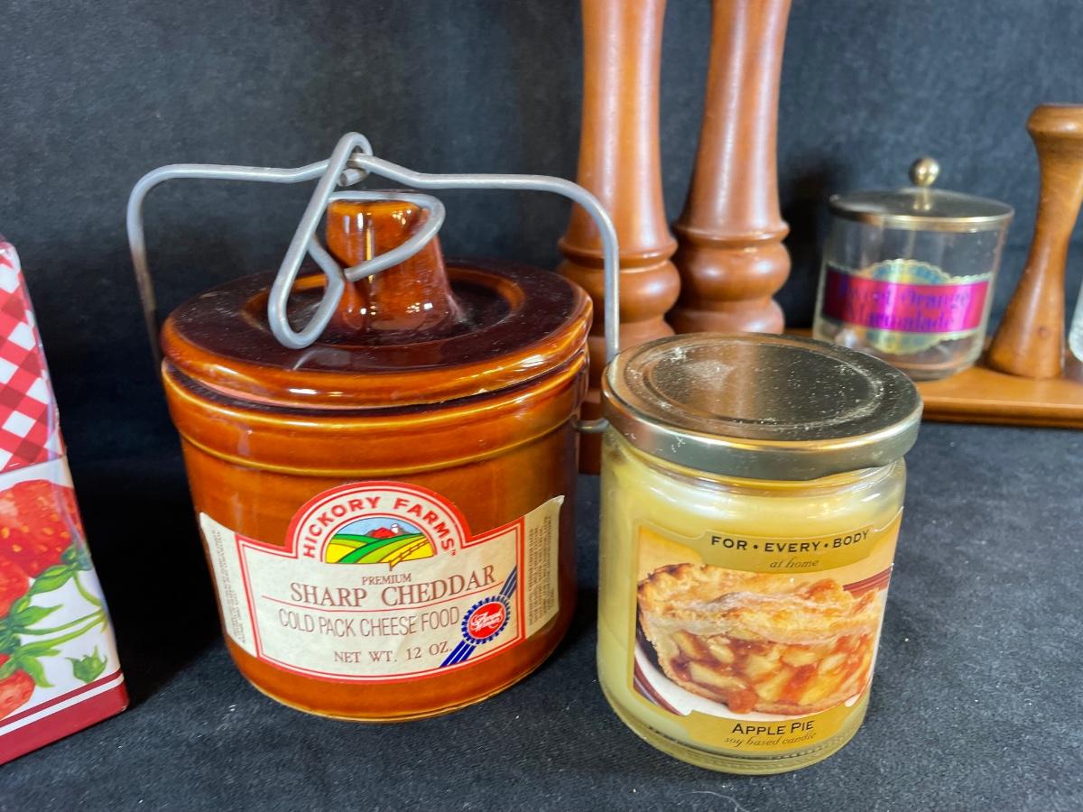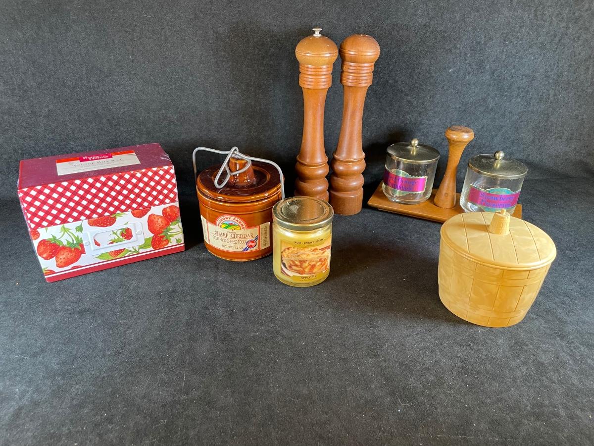 New recipe box, salt and pepper grinders, jam serving set, apply pie scented jar candle, an recycled crockery container and a covered plastic container
