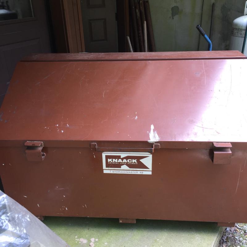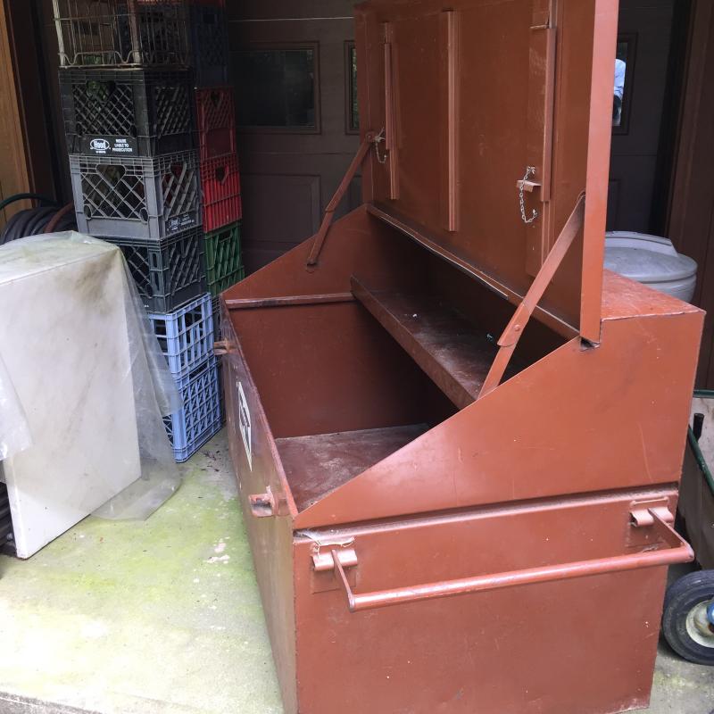 Knaack Job Box on Wheels. Measures 60”x 30” x 35” . Box is 40” Tall with The Wheels. Box is Substantial so please bring help to load. Lot is available for Local Pickup Only in Horseshoe, NC.