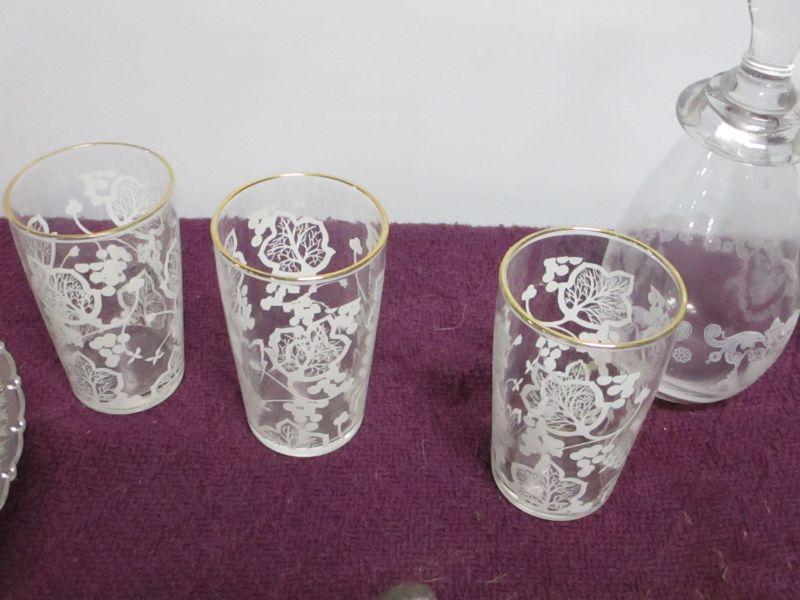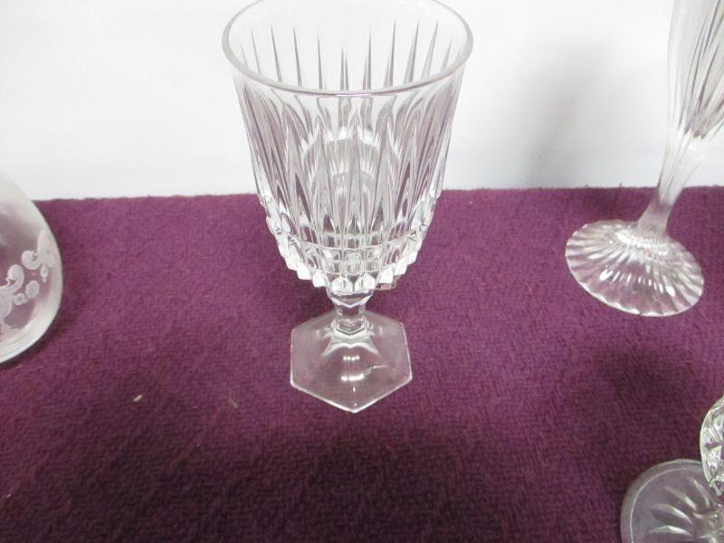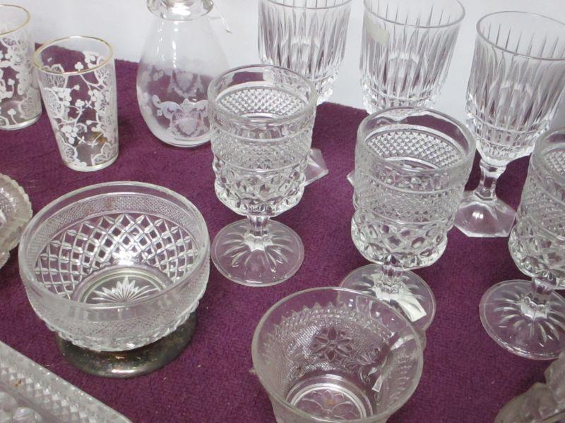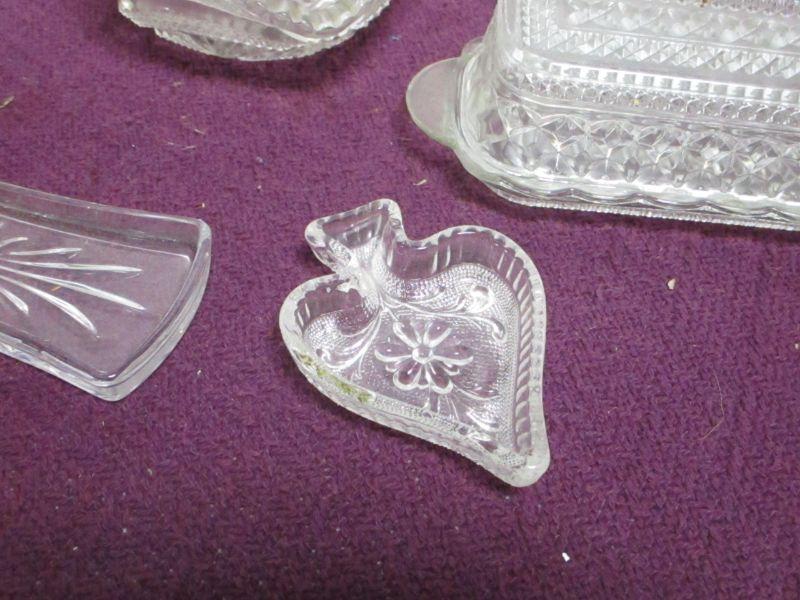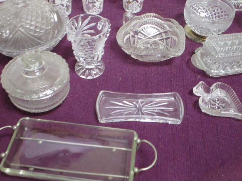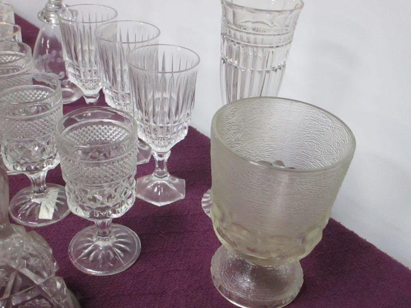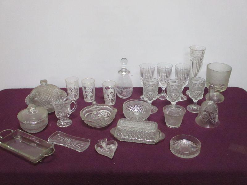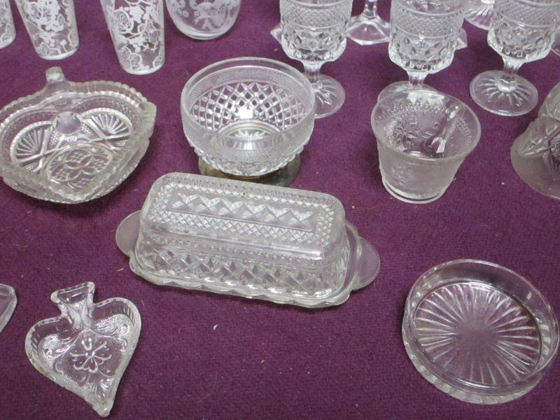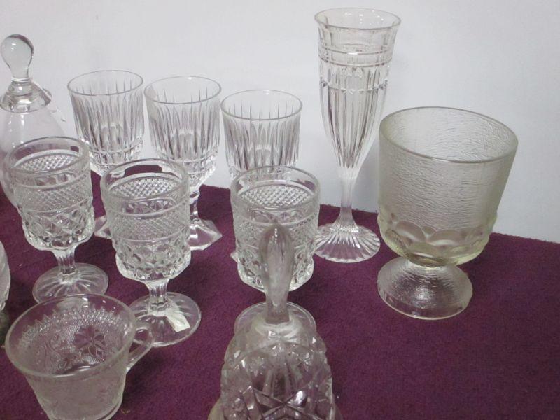 Cut and formed glass lot includes Butter dish, juice glasses, candy dishes, a bell and wine glasses