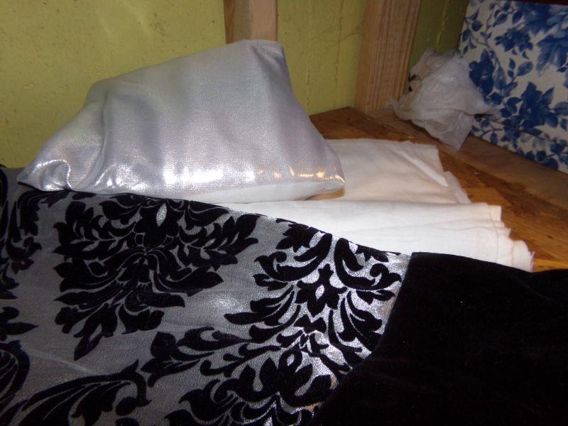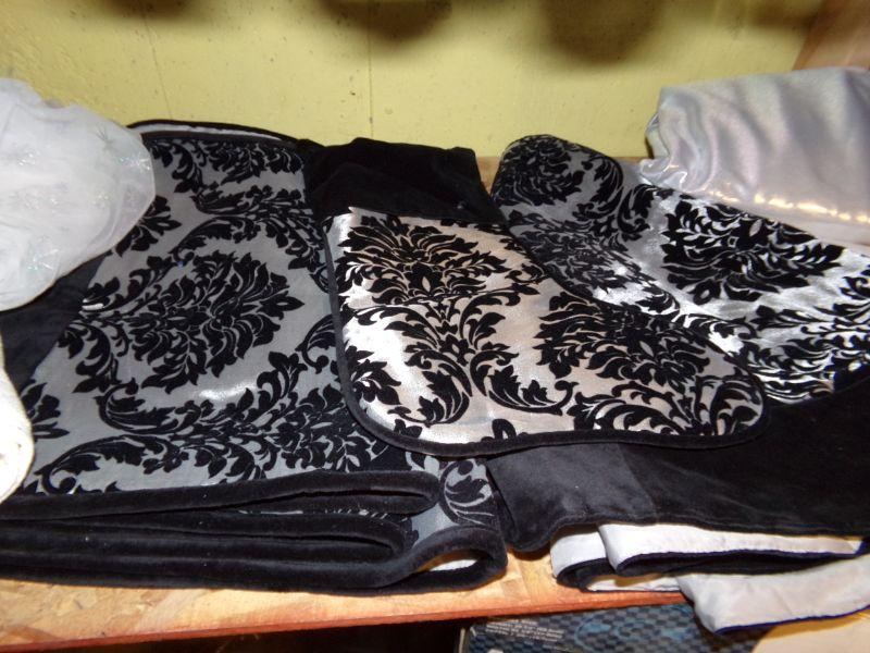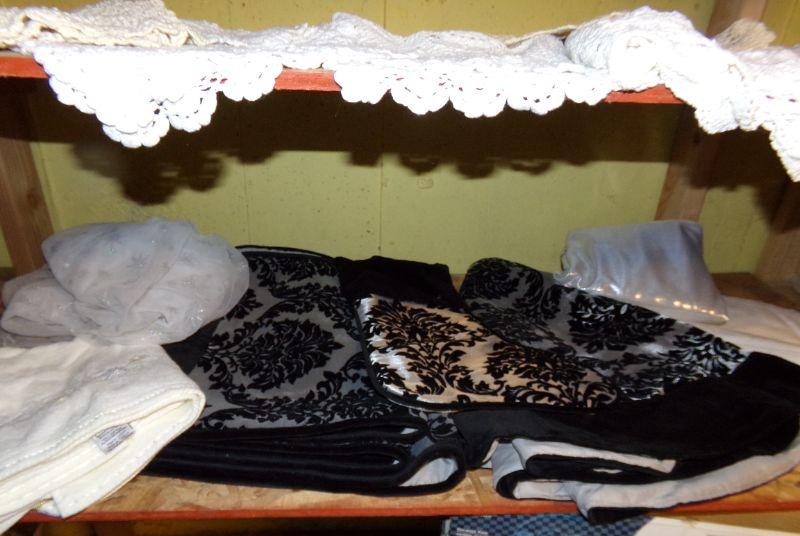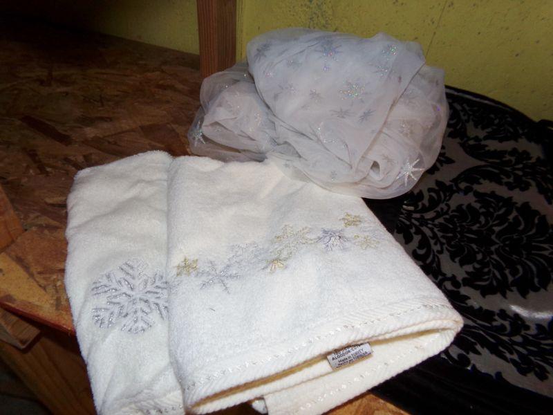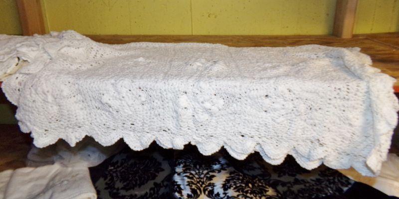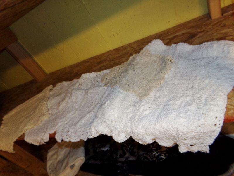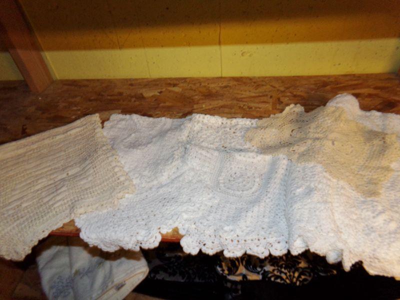 CHRISTMAS TREE SKIRT, 3 MATCHING TABLE RUNNERS, DOILIES, CROCHETED CARD TABLE SIZE COVER, MATERIAL