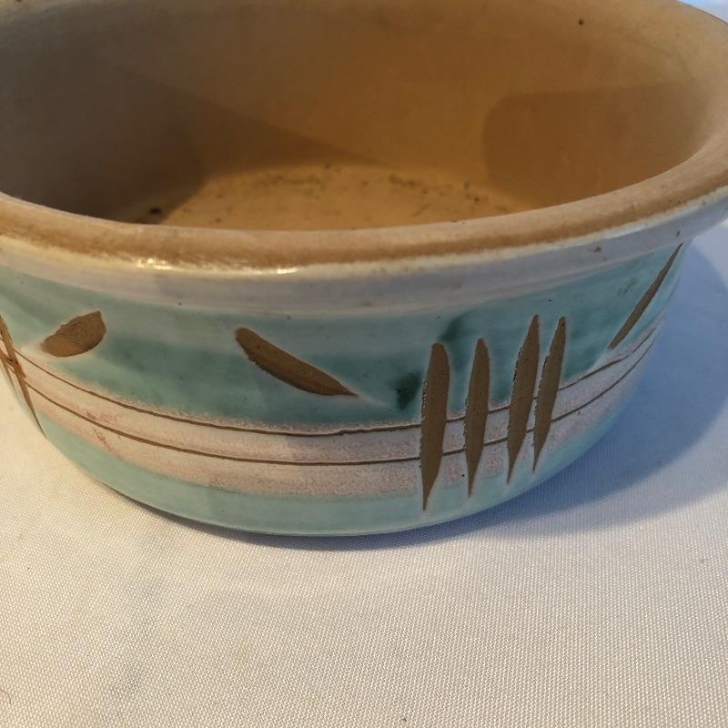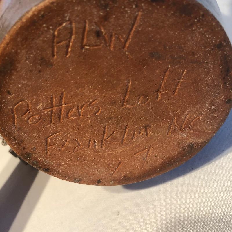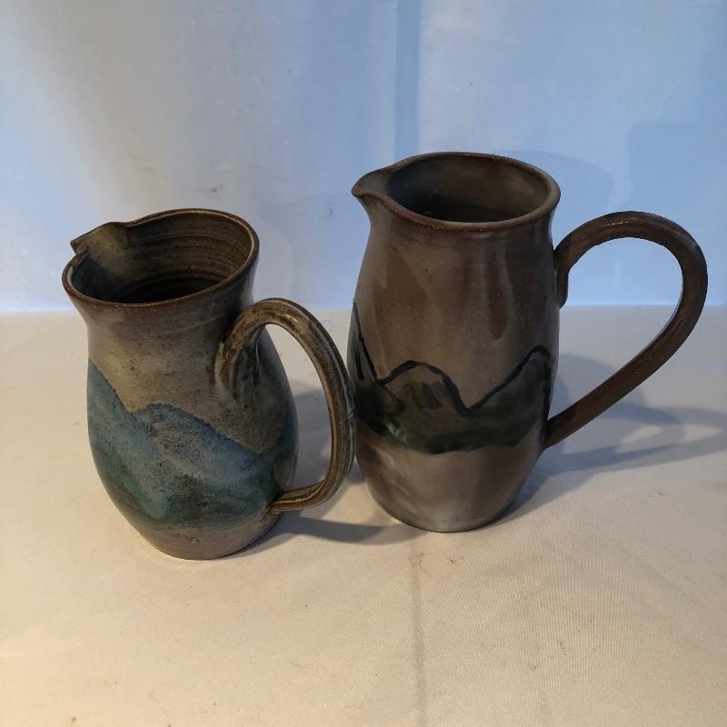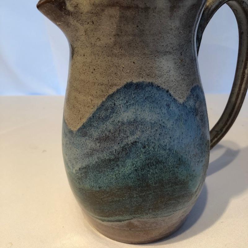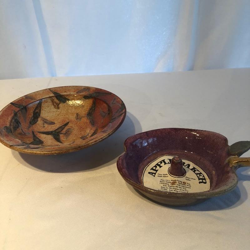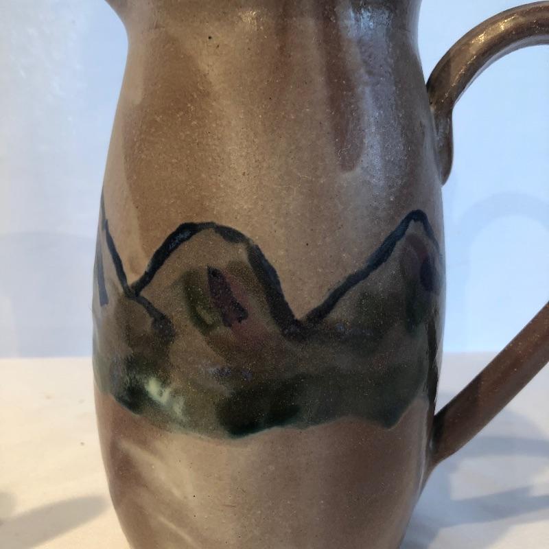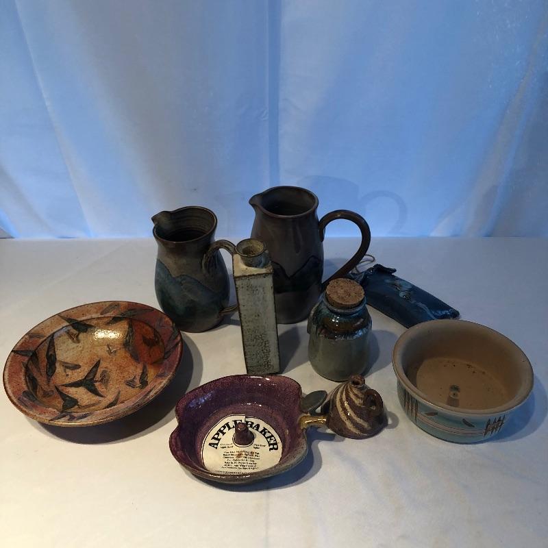 There are nine total pieces of pottery in this lot. There are two large pitchers with designs of the mountains that are local from Franklin, NC. There are also two small bowls, an Apple Baker, and more! Shipping available.