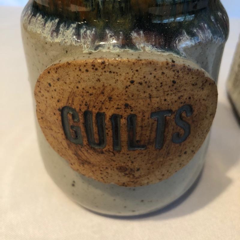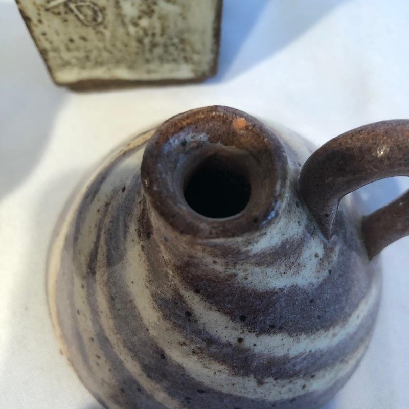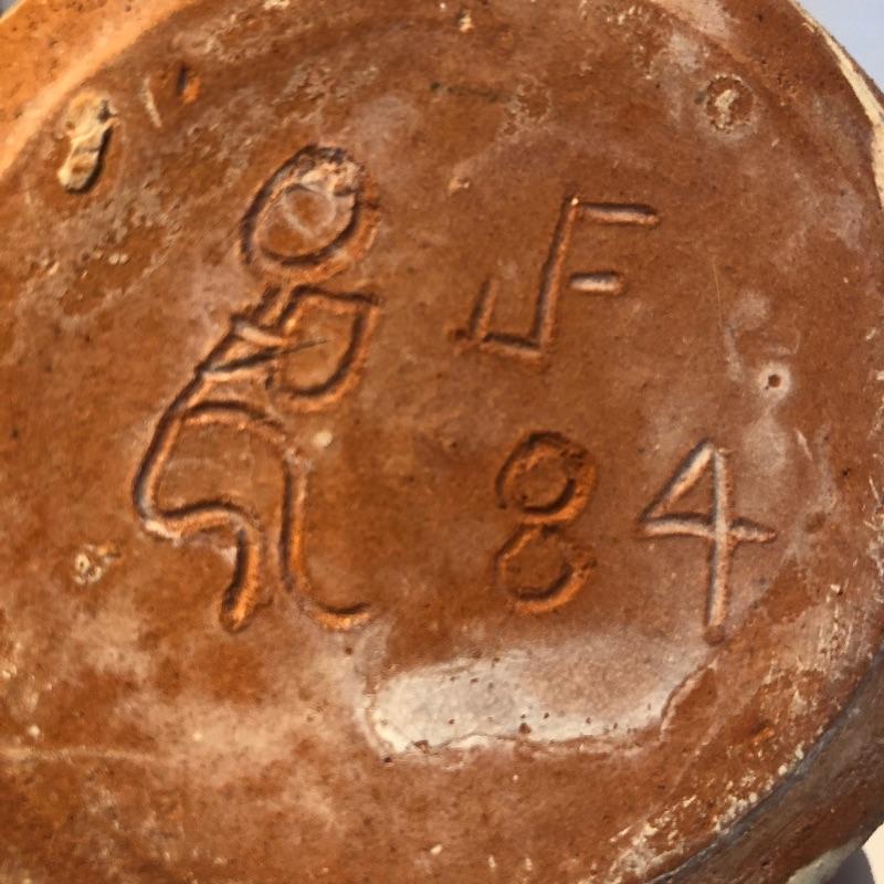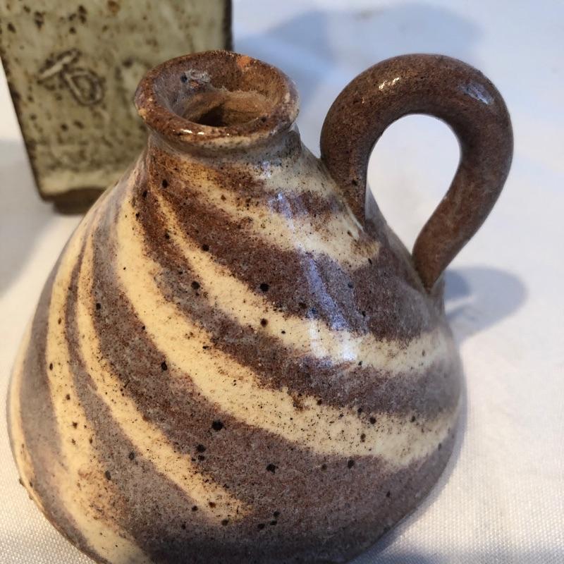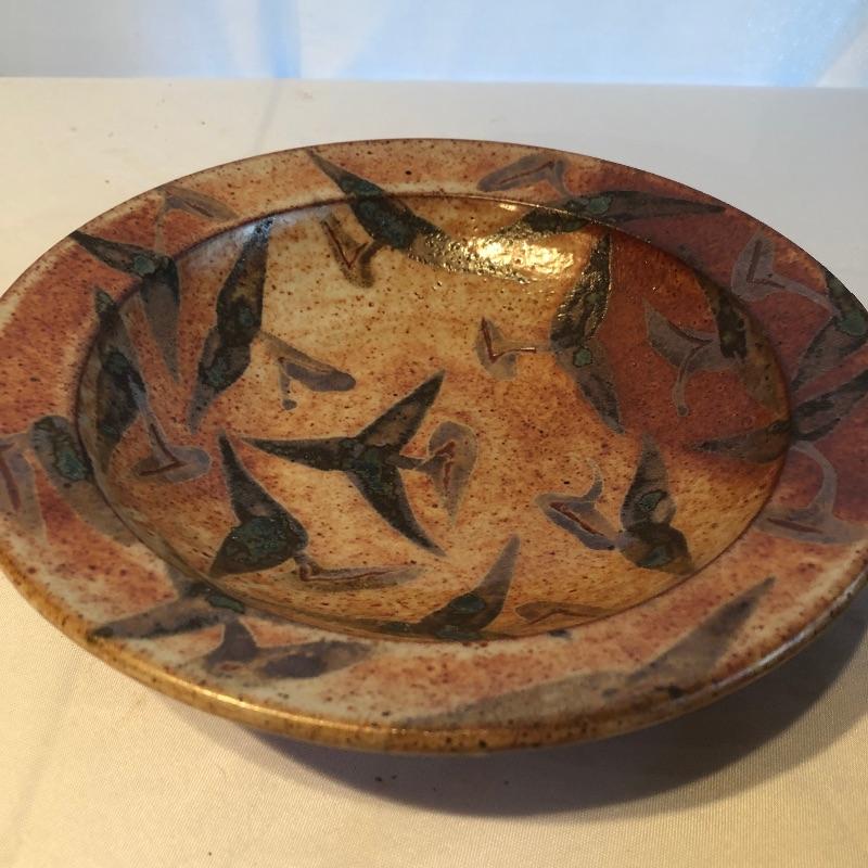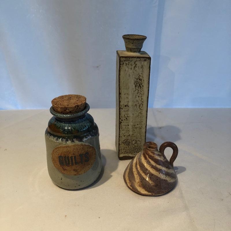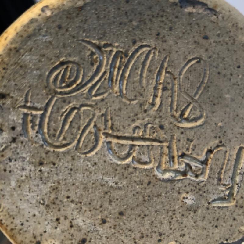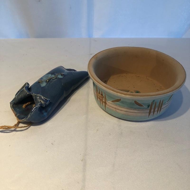 There are nine total pieces of pottery in this lot. There are two large pitchers with designs of the mountains that are local from Franklin, NC. There are also two small bowls, an Apple Baker, and more! Shipping available.