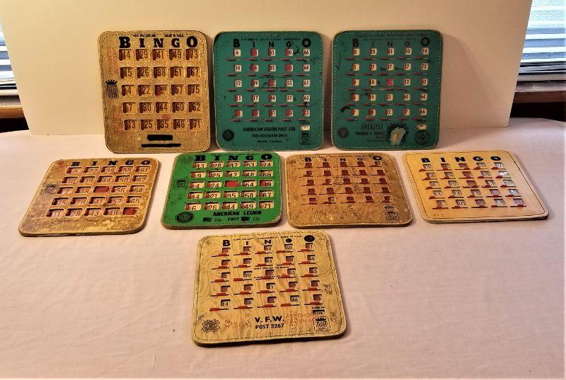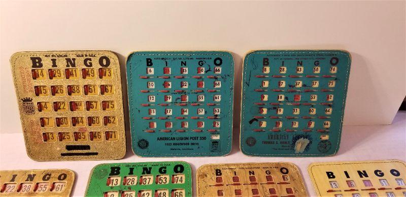 Lot of 8 vintage multiple use BINGO cards - very old school. Each is 6.5" x 7". They came from various VFW halls in the New Orleans area. Apparently, this lady played the same cards week after week, so they must have been "lucky."