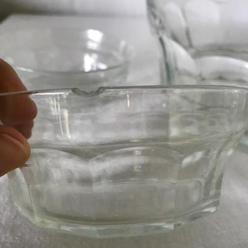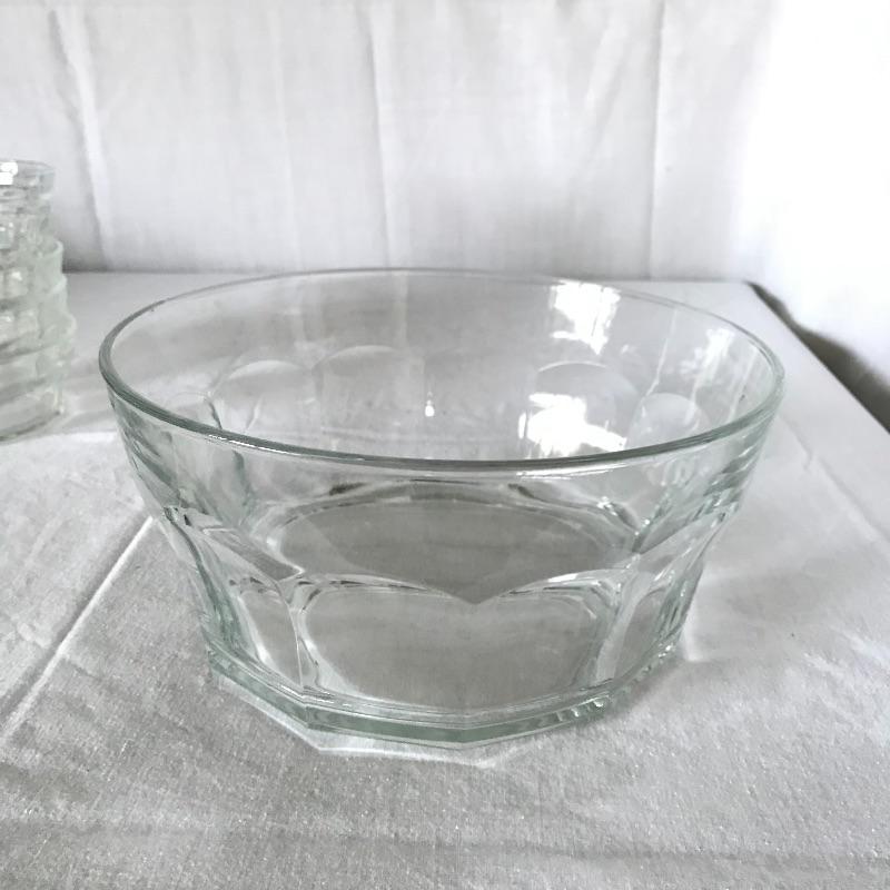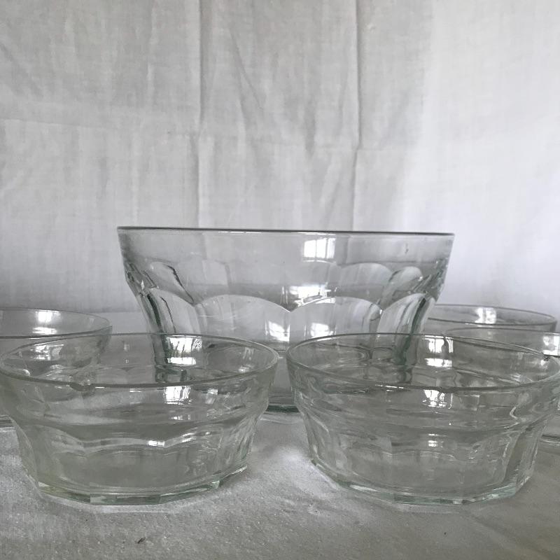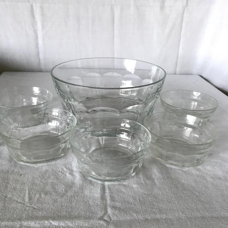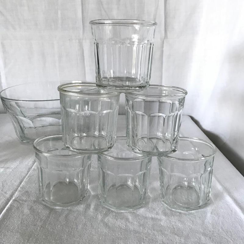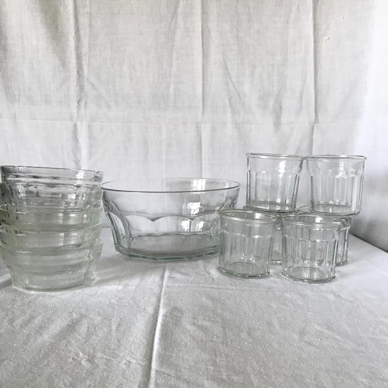 Six Luminarc wide stout tumblers with a 3.75” diameter mouth. Matching the tumblers we’ve paired an Italian compilation of one large 10.25”d x 5” serving bowl and five 5.5”d bowls. Some bowls have chips in the lip, see photos. Local Pickup Only.