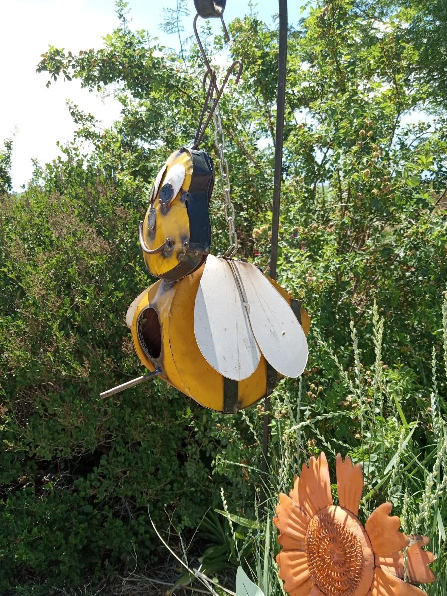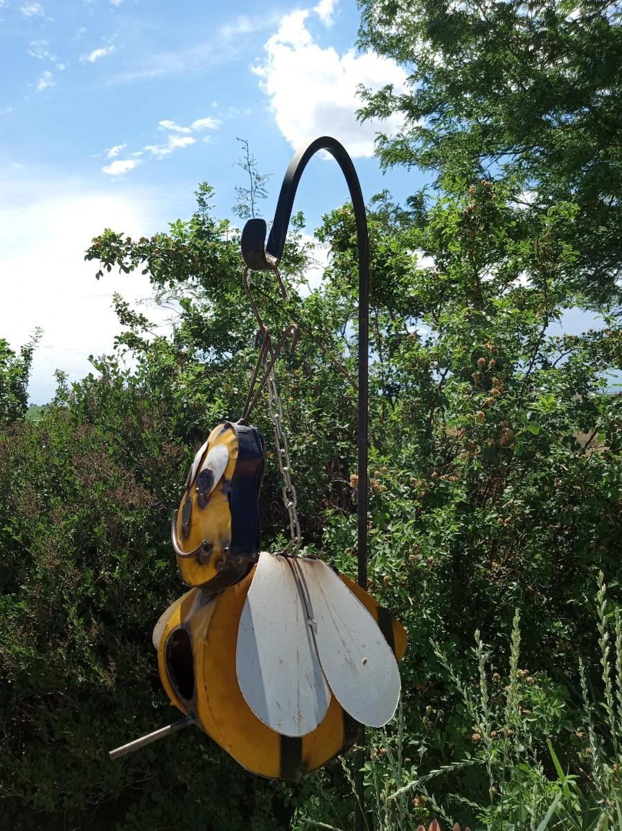 THE BEE HANGS FROM A SHEPHERDS HOOK WHICH IS ALSO INCLUDED